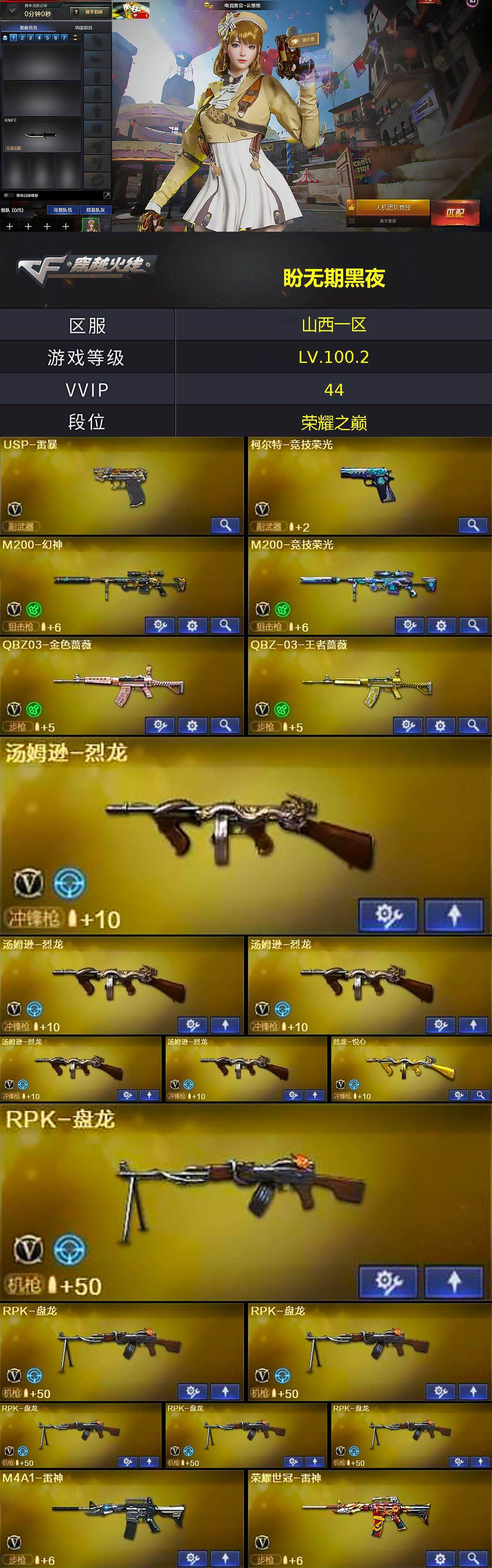 [15250120]山西一区-44v-6王者-0炫金 【热门武器】:q03-金色蔷薇,hk417-朱雀,m200-幻神,m200-竞技荣光,死亡之眼,荣耀世冠-雷神,m4a1-黑骑士,汤姆逊-烈龙5,rpk-盘龙6,加特林-炼狱2,斯泰尔-蝴蝶,usp-雷暴,沙鹰-修罗 【音效卡】:m4a1-黑骑士音效卡,barrett-碧霄极光音效卡 【皮肤】:火麒麟-百城,毁灭-星空,m4a1-千变-孔明皮肤,战神-粉色甜心皮肤,ak47-b-常胜将军-刘备,ak47-b-常胜将军-孙权 【角色】:电竞教官-云悠悠,王者-瞳-闭月羞花,初恋灵狐,风暴女,零-热舞青春,灵狐者-七夕宝贝,麻雀,职业选手 【人偶武器】:斯泰尔-蝴蝶,迷你裂空之翼2,夺魂,迷你牛牛,迷你生化手蕾,深渊终结者手蕾,闪光丹-貂蝉,高爆手蕾-大乔,迷你艾比 【暴走生化】:黑龙吞噬者,死亡之眼,超级对讲机 【挑战大师】:神圣爆裂者iii,冰龙粉碎者-白马银呛,激光毁灭者iii-白马银呛,vepr-12-金魔,激光毁灭者iii,机甲撕裂者iii,阐释者iii 【英雄级武器】:m4a1-千变,ak47-火麒麟,m4a1-雷神,m4a1-黑骑士,ak12-天启,hk417-朱雀,无影-神兵利器,黑武士-锦绣游龙,q03-金色蔷薇,黑骑士-海王,ak47-b-常胜将军,q-03-王者蔷薇-觉醒版,荣耀世冠-雷神,barrett-毁灭,m200-幻神,m200-竞技荣光,rpk-盘龙6,加特林-炼狱2,汤姆逊-烈龙5,烈龙-悦心-觉醒版,aa-12-雷霆,沙鹰-修罗,沙鹰-天神,usp-雷暴,柯尔特-竞技荣光,屠龙,擎天-竞技荣光,高爆手蕾-竞技荣光,闪光丹-竞技荣光2,盐雾蛋-竞技荣光,m4a1-赤狱骑士,barrett-碧霄极光 【道具】:edg炫彩背包,炫彩背包,超级背包,女皇终结者-魔龙之吻,黄金生化钩,绿色巨人,灵魂忍者,变异宝贝,迷雾幽灵,生化弹匣,夺命之镰,防化服2,流光-鎏金之域,呛王排位28赛季金色流光,呛王排位29赛季金色流光,ep战队名片,防弹头盔5,防弹衣7,c4工具钳5,手蕾包5 【特殊呛械】:蝴蝶斯泰尔5烈龙,1黑骑士,5烈龙,6盘龙,2炼狱,1蝴蝶斯泰尔