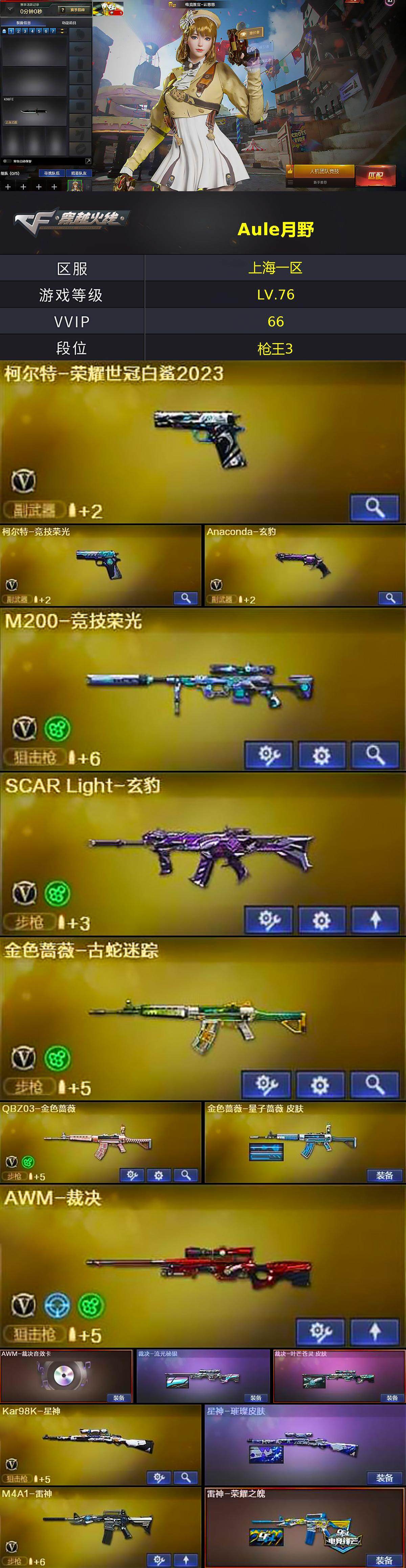 上海一区-62v-3王者-0炫金 【热门武器】:q03-金色蔷薇,柯尔特-荣耀世冠白鲨2023,金色蔷薇-古蛇迷踪,修罗-古蛇迷踪,m200-竞技荣光,kar98k-星神,沙鹰-修罗 【王者炫金武器】:王者星光 【音效卡】:awm-裁决音效卡,barrett-碧霄极光音效卡,炼狱-百战金芒-庆典舞曲音效卡 【皮肤】:金色蔷薇-量子蔷薇 皮肤,裁决-流光秘银,裁决-叶芒苍灵 皮肤,星神-璀璨皮肤,雷神-荣耀之魄,火麒麟-平天大圣,修罗-冠军之魂,屠龙-星耀 皮肤,轻型军用手斧-再燃火线 【角色】:电竞教官-云悠悠,星际战将,曼珠沙华,战地猎狐,王者-魅影,蛇隐宗,乔伊教练,修道士,暗夜-x,初恋灵狐,芳心审判者,龙儿,娜塔莉娅,潘多拉-甜心教官,蛇姬,兔囡囡,维纳斯,雪莉杨,雪莉杨-摸金校尉,智影 【人偶武器】:awm-灵狐-15周年嘉年华,迷你牛牛,迷你超能女侍 【挑战大师】:冰龙粉碎者-白马银呛,激光毁灭者iii-白马银呛,试炼破坏者iii,神圣爆裂者-末日iii 【英雄级武器】:m4a1-雷神,ak12-天启,金色蔷薇-古蛇迷踪,scar light-玄豹,q03-独角-iii,q03-金色蔷薇,黑骑士-海王,王者风势-觉醒版,awm-裁决,kar98k-星神,m200-竞技荣光,炼狱-百战金芒,沙鹰-修罗,沙鹰-天神2,柯尔特-荣耀世冠白鲨2023,柯尔特-竞技荣光,anaconda-玄豹,修罗-古蛇迷踪,屠龙,擎天-竞技荣光,麒麟刺-百战金芒,丛林匕首-玄豹2,高爆手蕾-雷暴,高爆手蕾-竞技荣光7,高爆手蕾-古蛇迷踪,高爆手蕾-玄豹3,闪光丹-竞技荣光7,闪光丹-玄豹2,盐雾蛋-竞技荣光7,盐雾蛋-古蛇迷踪,盐雾蛋-玄豹2,m4a1-苍鸣雷神,barrett-碧霄极光 【道具】:bs战队炫彩背包,云山科技背包,亚洲杯纪念炫彩背包,古蛇迷踪炫彩背包,炫彩背包-诺拉,百战金芒炫彩背包,超级背包,女皇终结者-魔龙之吻,救世主-黑桃战神,绿色巨人,灵魂忍者2,变异宝贝,妖姬,迷雾幽灵,夺命之镰,防化服4,呛王排位29赛季金色流光,语音特效-盛典烟火,古蛇迷踪打击特效,蛇隐宗表情,萌萌小葵表情,电玩兔兔表情,动感闪耀表情,c4-黑曜,防弹头盔3,防弹衣3,c4工具钳3,手蕾包3 【特殊呛械】:
