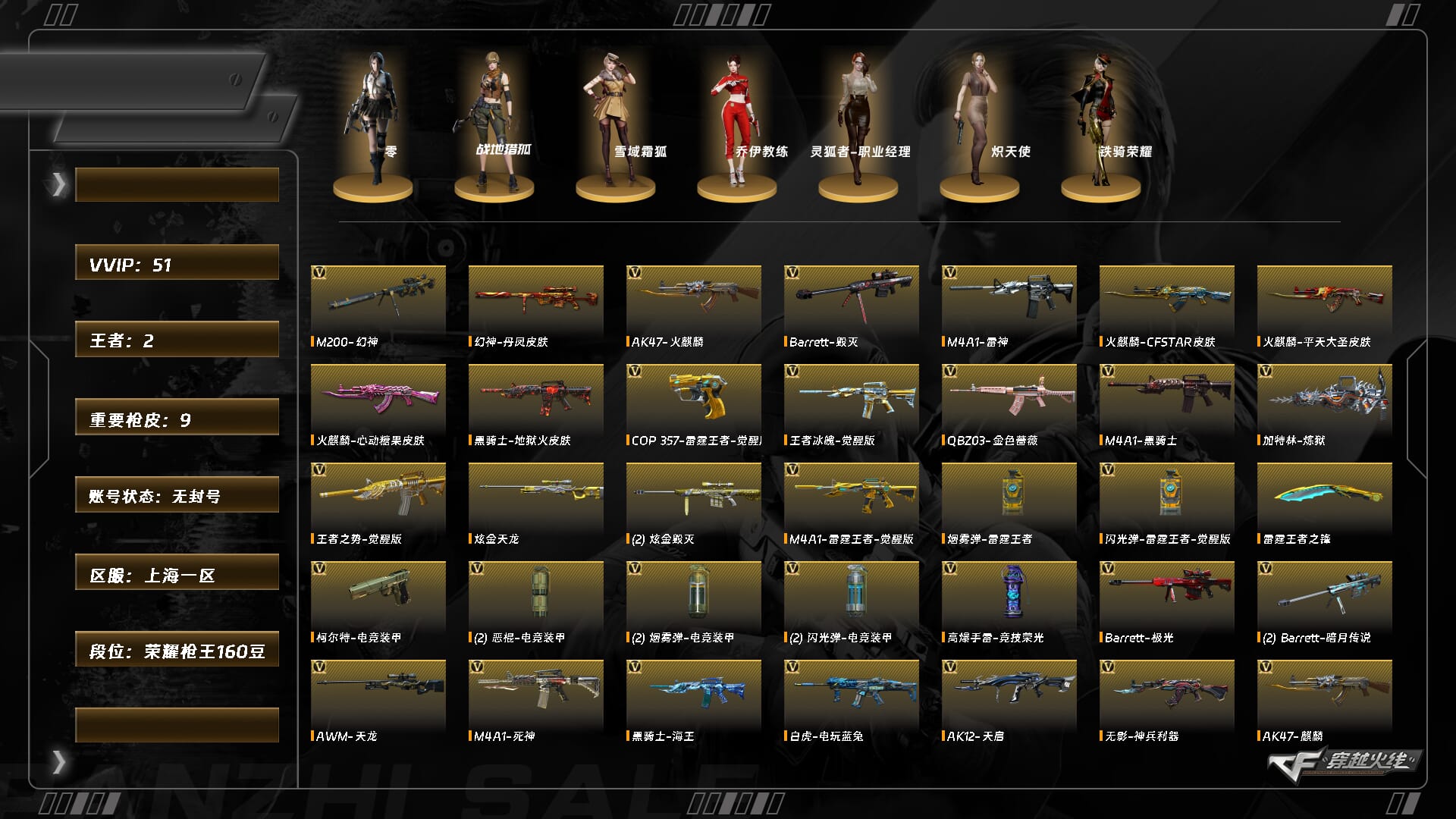 9976/东部/上海一区/【荣耀呛王160豆】/lv.102 荣耀元帅/vip6/51v/【幻神三件套】/幻神/幻神音效卡/幻神丹凤/q金色蔷薇/白虎电玩蓝兔/cop雷霆王者/柯尔特电竞装甲/m4雷霆王者/王者冰魄/5修罗/【音效卡皮肤】/黑骑士音效卡/黑骑士白马银呛/火麒麟心动糖果/雷神源