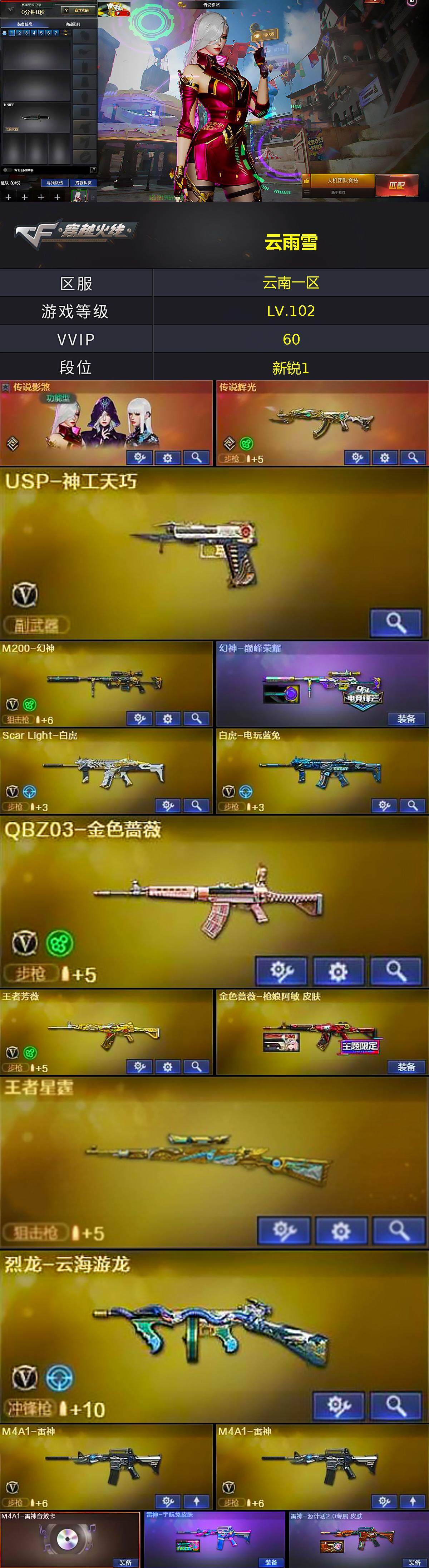 云南一区-55v-10王者-0炫金 【传说武器】:传说辉光 【传说角色】:传说影煞 【热门武器】:传说辉光,q03-金色蔷薇,scar light-白虎,hk417-朱雀,m200-幻神,修罗-古蛇迷踪,白虎-电玩蓝兔,cat-刀锋,牛牛-ak47,m4a1-黑骑士,沙鹰-修罗2,炽芒蝶刃,金刚伞 【王者炫金武器】:王者霜心,王者星霆,雷霆王者之锋 【音效卡】:m4a1-雷神音效卡,m4