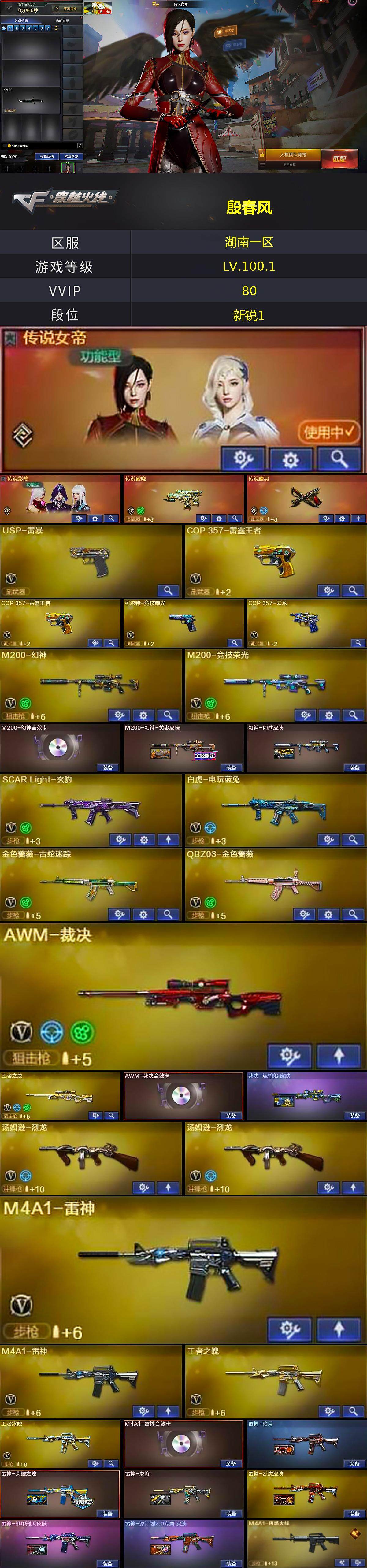 湖南一区-70v-51王者-3炫金 【传说武器】:传说破晓,传说幽冥 【传说角色】:传说女帝,传说影煞 【热门武器】:传说破晓,传说幽冥,q03-金色蔷薇,m200-幻神,金色蔷薇-古蛇迷踪,修罗-古蛇迷踪,m200-竞技荣光,死亡之眼,白虎-电玩蓝兔,q03-街机,金色小号,c.a.t,牛牛-ak47,m4a1-黑骑士,汤姆逊-烈龙2,加特林-炼狱,usp-雷暴,cop 357-雷