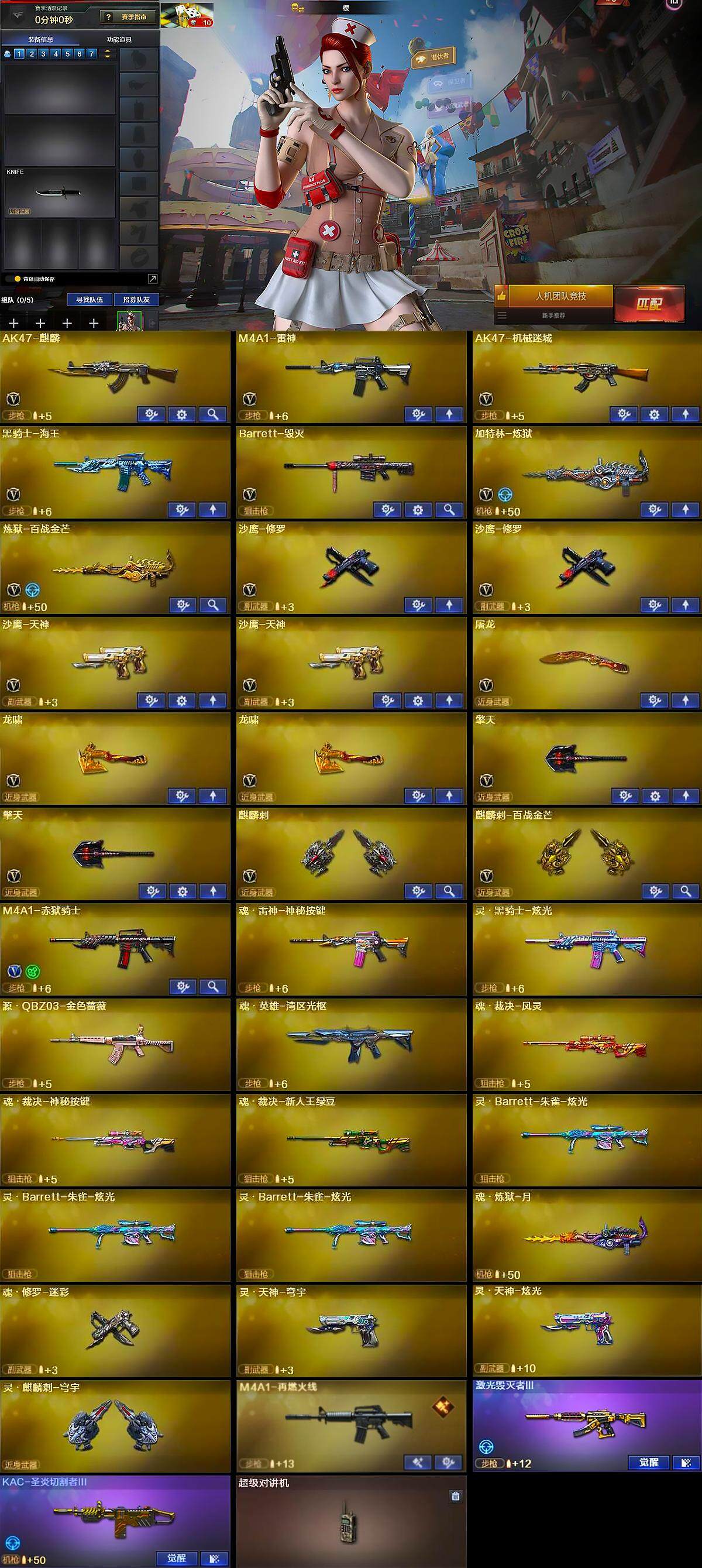 山西一区-26v-0王者-0炫金 【热门武器】:加特林-炼狱,沙鹰-修罗2 【音效卡】:炼狱-百战金芒-庆典舞曲音效卡 【皮肤】:雷神-暗月,雷神-化蛇 皮肤,雷神-诺拉 皮肤,m4a1-再燃火线,毁灭-英雄计划 皮肤,黑骑士-暗月,无影-暗月,天启-暗月2,修罗-能量核心,轻型军用手斧-再燃火