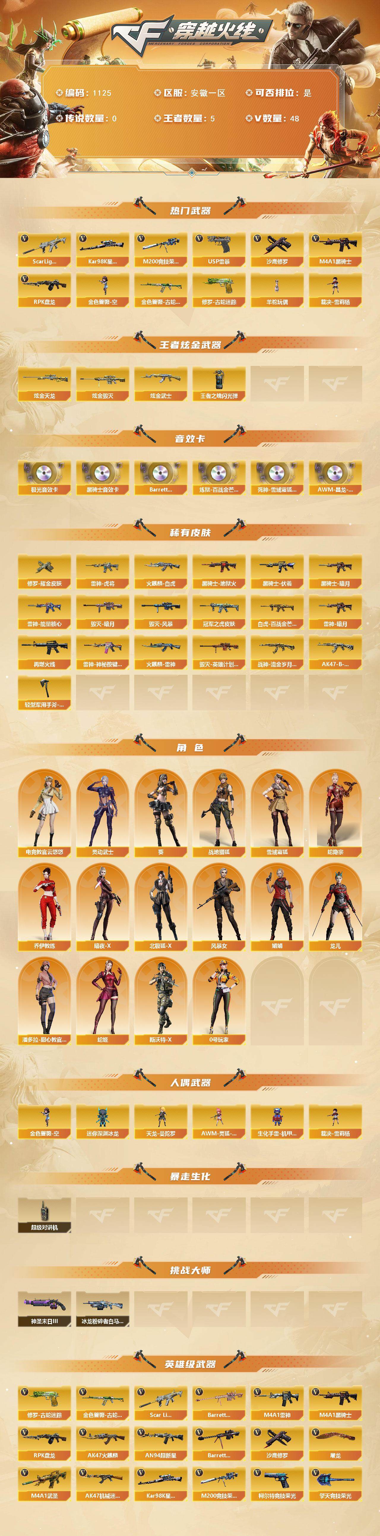[15310556]安徽一区-48v-5王者-4炫金 【热门武器】:scar light-白虎,金色蔷薇-古蛇迷踪,修罗-古蛇迷踪,m200-竞技荣光,kar98k-星神,m4a1-黑骑士2,rpk-盘龙,金色蔷薇-空,羊驼玩偶,裁决-雪莉杨,usp-雷暴,沙鹰-修罗2 【王者炫金武器】:炫金武士,炫金毁灭2,炫金天龙,王者之魄闪光丹 【音效卡】:m4a1-黑骑士音效卡,barrett-极光音效卡,barrett-碧霄极光音效卡,炼狱-百战金芒-庆典舞曲音效卡,死神-雪域霜狐-怀旧音效卡,awm-昌龙-怀旧音效卡 【皮肤】:scarlight-白虎-冠军之虎皮肤,白虎-百战金芒 皮肤,雷神-暗月,雷神-能量核心,雷神-虎将,m4a1-再燃火线,雷神-神秘按键 皮肤,火麒麟-雷神,火麒麟-白虎,毁灭-暗月,毁灭-风暴,毁灭-英雄计划 皮肤,黑骑士-暗月,黑骑士-地狱火,黑骑士-伏羲,战神-流金岁月皮肤,ak47-b-常胜将军-刘备,修罗耀金皮肤,轻型军用手斧-再燃火线 【角色】:葵,电竞教官-云悠悠,战地猎狐,雪域霜狐,蛇隐宗,乔伊教练,暗夜-x,北极狐-x,风暴女,娟娟,0号玩家,灵动武士,龙儿,潘多拉-甜心教官,蛇姬,斯沃特-x 【人偶武器】:裁决-雪莉杨,天龙-曼陀罗,金色蔷薇-空,awm-灵狐-15周年嘉年华2,迷你深渊冰龙,生化手蕾-机甲核心 【暴走生化】:超级对讲机 【挑战大师】:冰龙粉碎者-白马银呛,神圣爆裂者-末日iii 【英雄级武器】:ak47-火麒麟,m4a1-雷神,m4a1-黑骑士2,an94-超新星,m4a1-武圣3,ak47-机械迷城,scar light-白虎,金色蔷薇-古蛇迷踪,死神-雪域霜狐,王者之影-觉醒版,王者之魄-觉醒版,王者之势-觉醒版,王者之戮-觉醒版,barrett-毁灭,kar98k-星神,m200-竞技荣光,barrett-金色蔷薇,rpk-盘龙,炼狱-百战金芒,沙鹰-修罗2,usp-雷暴,柯尔特-竞技荣光,修罗-古蛇迷踪,屠龙,擎天-竞技荣光2,擎天-云海游龙,麒麟刺-百战金芒,高爆手蕾-竞技荣光,高爆手蕾-古蛇迷踪,闪光丹-竞技荣光,盐雾蛋-竞技荣光3,盐雾蛋-古蛇迷踪,m4a1-赤狱骑士,m4a1-苍鸣雷神,awm-昌龙,barrett-碧霄极光3 【道具】:bs战队炫彩背包,cfs限定背包,云山科技背包,古蛇迷