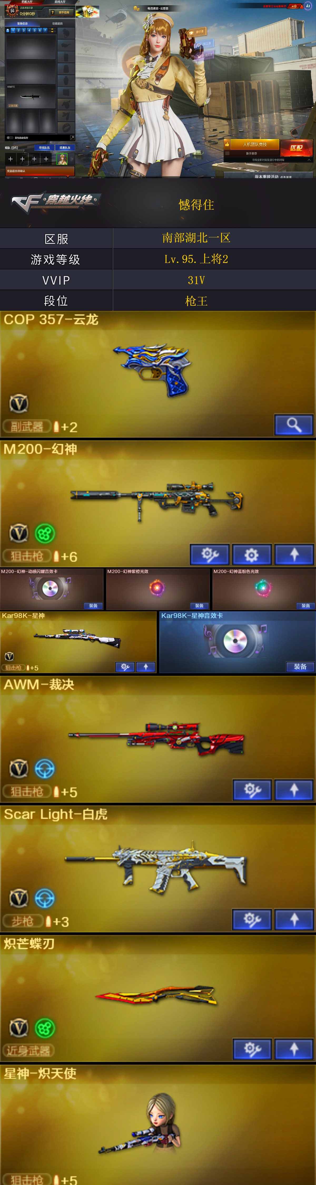 【★找回包赔★南部2014】:南部湖北一区-31v-可二次实名-【lv.95.上将2】-【段位:呛王】m200-幻神/kar98k-星神/awm-裁决/scarlight-白虎/cop357-云龙/炽芒蝶刃/kar98k-星神音效卡/隼/关小雨/星神-炽天使(截图展示段位不代表实际段位,如赛季更新等不可抗拒因素发生变化,其余道具看截图或咨询客服)