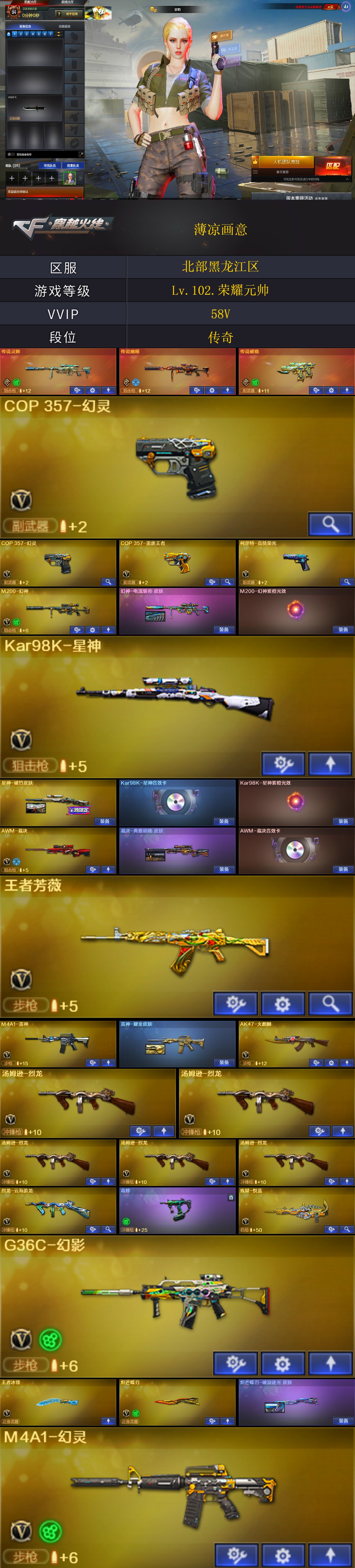 【★找回包赔★北部4123】:北部黑龙江区-58v-可二次实名-【lv.102.荣耀元帅】-【段位:传奇】传说灵眸/传说幽瞳/传说破晓/m200-幻神/幻神-电流骇客皮肤/kar98k-星神/星神-破竹皮肤/awm-裁决/王者芳薇-觉醒版/cop357-幻灵2/cop357-雷霆王者-觉醒版/柯尔特-竞技荣光/g36c-幻影/炽芒蝶刃/炽芒蝶刃-破浪逐光皮肤/汤姆逊-烈龙5/烈龙-云海游龙/毒蜂/毁灭-荣耀之怒/幻影-破浪逐光皮肤/kar98k-星神音效卡/awm-裁决音效卡/barrett-毁灭音效卡(截图展示段位不代表实际段位,如赛季更新等不可抗拒因素发生变化,其余道具看截图或咨询客服)