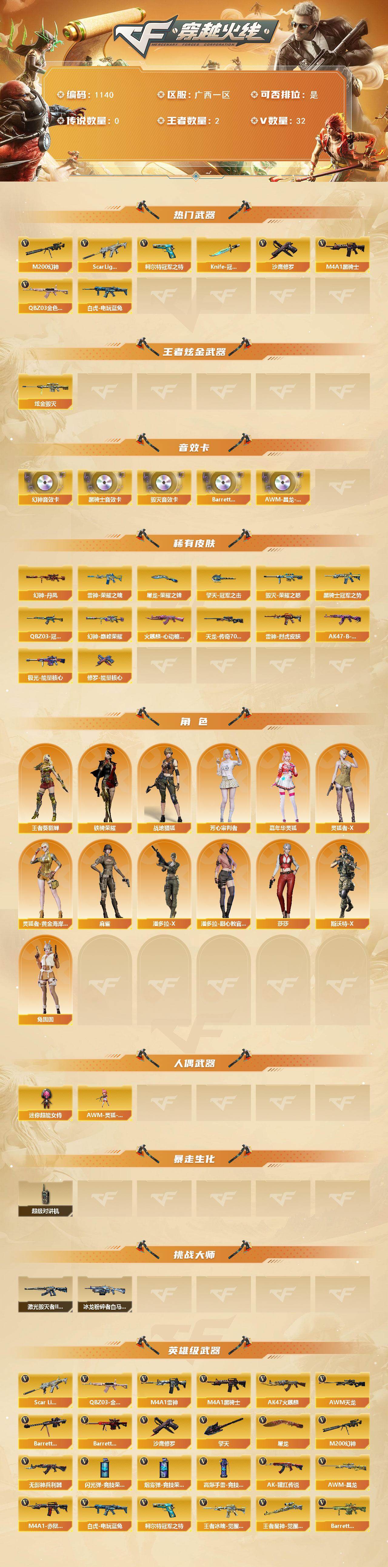 [15346071]广西一区-32v-2王者-1炫金 【热门武器】:q03-金色蔷薇,scar light-白虎,m200-幻神,白虎-电玩蓝兔,柯尔特-冠军之特,m4a1-黑骑士,沙鹰-修罗2,knife-冠军之刃 【王者炫金武器】:炫金毁灭 【音效卡】:m200-幻神音效卡,m4a1-黑骑士音效卡,barrett-毁灭音效卡,barrett-碧霄极光音效卡,awm-昌龙-怀旧音效卡 【皮肤】:幻神-丹凤,幻神-巅峰荣耀,q03-冠军之薇,雷神-荣耀之魄,雷神-烈虎皮肤,火麒麟-心动糖果,毁灭-荣耀之怒,黑骑士-冠军之势,ak47-b-常胜将军-曹操,awm-天龙-传奇70kg2,极光-能量核心,修罗-能量核心,屠龙-荣耀之锋,擎天-冠军之击 【角色】:战地猎狐,王者-葵-貂蝉,芳心审判者,嘉年华灵狐,灵狐者-x,灵狐者-黄金海岸,麻雀,潘多拉-x,潘多拉-甜心教官,莎莎,斯沃特-x,铁骑荣耀,兔囡囡 【人偶武器】:awm-灵狐-15周年嘉年华2,迷你超能女侍 【暴走生化】:超级对讲机 【挑战大师】:冰龙粉碎者-白马银呛,激光毁灭者iii-白马银呛 【英雄级武器】:ak47-火麒麟2,m4a1-雷神,m4a1-黑骑士,scar light-白虎,无影-神兵利器,q03-金色蔷薇,ak-47-猩红传说2,王者冰魄-觉醒版,白虎-电玩蓝兔,awm-天龙2,barrett-毁灭,barrett-极光,m200-幻神,王者星神-觉醒版,沙鹰-修罗2,柯尔特-冠军之特,屠龙2,擎天,高爆手蕾-竞技荣光2,闪光丹-竞技荣光2,盐雾蛋-竞技荣光2,m4a1-赤狱骑士,awm-昌龙,barrett-碧霄极光 【道具】:ag战队炫彩背包,bs战队炫彩背包,cfs限定背包,q9战队炫彩背包,亚洲杯纪念炫彩背包,战舰背包,炫彩背包,虎牙炫彩背包,超级背包,女皇终结者-魔龙之吻,救世主-黑桃战神,绿色巨人,灵魂忍者,迷雾幽灵2,夺命之镰,防化服3,金色流光-呛王排位2,流光-鎏金之域,流光-再燃火线,呛王排位29赛季金色流光,电玩兔兔表情,动感闪耀表情,c4-红龙,防弹头盔8,防弹衣8,c4工具钳5,手蕾包4 【特殊呛械】:1白虎,1黑骑士