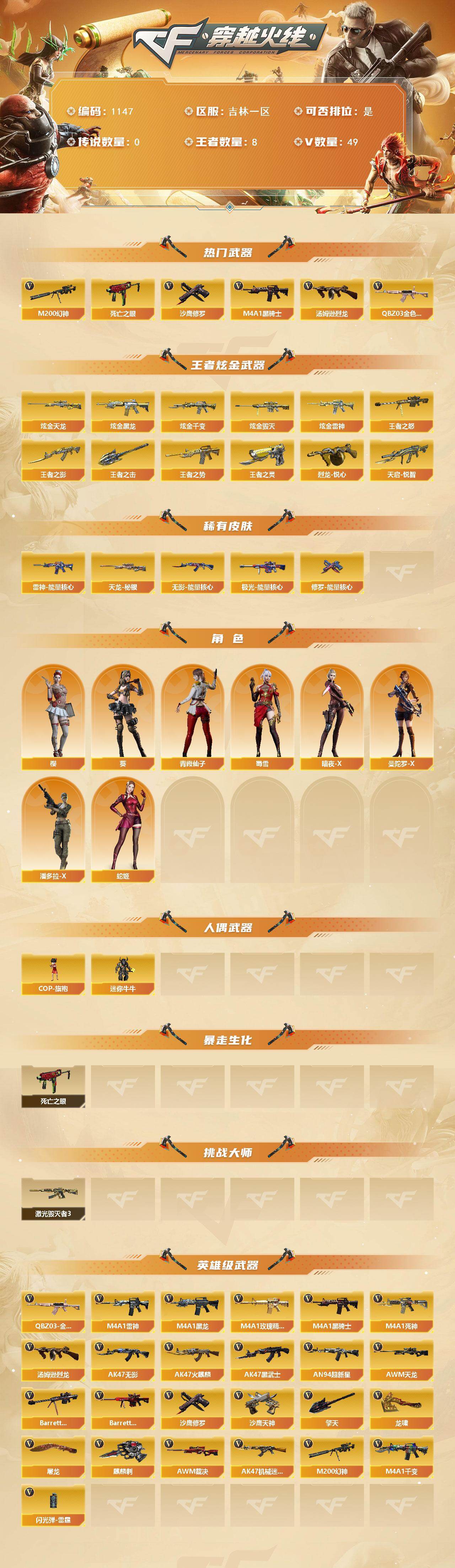 [15346534]吉林一区-49v-8王者-6炫金 【热门武器】:q03-金色蔷薇,m200-幻神,死亡之眼6,m4a1-黑骑士,汤姆逊-烈龙2,沙鹰-修罗7 【王者炫金武器】:天启-悦智,王者之势,王者之影2,王者之怒,烈龙-悦心,王者之灵,王者之击,炫金黑龙,炫金千变,炫金雷神,炫金毁灭2,炫金天龙 【皮肤】:雷神-能量核心,无影-能量核心,天龙-秘银,极光-能量核心,修罗-能量核心 【角色】:葵,樱,暗夜-x,曼陀罗-x,潘多拉-x,青霞仙子,蛇姬,蜀雪 【人偶武器】:cop-旗袍,迷你牛牛 【暴走生化】:死亡之眼6 【挑战大师】:激光毁灭者iii 【英雄级武器】:m4a1-千变2,ak47-火麒麟2,m4a1-黑龙,m4a1-雷神,m4a1-黑骑士,ak47-无影,m4a1-死神,ak47-黑武士3,an94-超新星,ak47-机械迷城,m4a1-玫瑰精灵,q03-金色蔷薇,awm-天龙3,barrett-毁灭2,barrett-极光3,awm-裁决,m200-幻神,汤姆逊-烈龙2,沙鹰-修罗7,沙鹰-天神,屠龙7,龙啸,擎天,麒麟刺,闪光丹-雷霆 【道具】:亚洲杯纪念炫彩背包,炫彩背包,背包-洛丽塔,超级背包2,救世主-黑桃战神,黄金生化钩,绿色巨人,灵魂忍者,迷雾幽灵,夺命之镰,防化服2,呛王排位28赛季金色流光,呛王排位29赛季金色流光,防弹头盔2,防弹衣2,c4工具钳2,手蕾包2 【特殊呛械】:1黑骑士,2烈龙