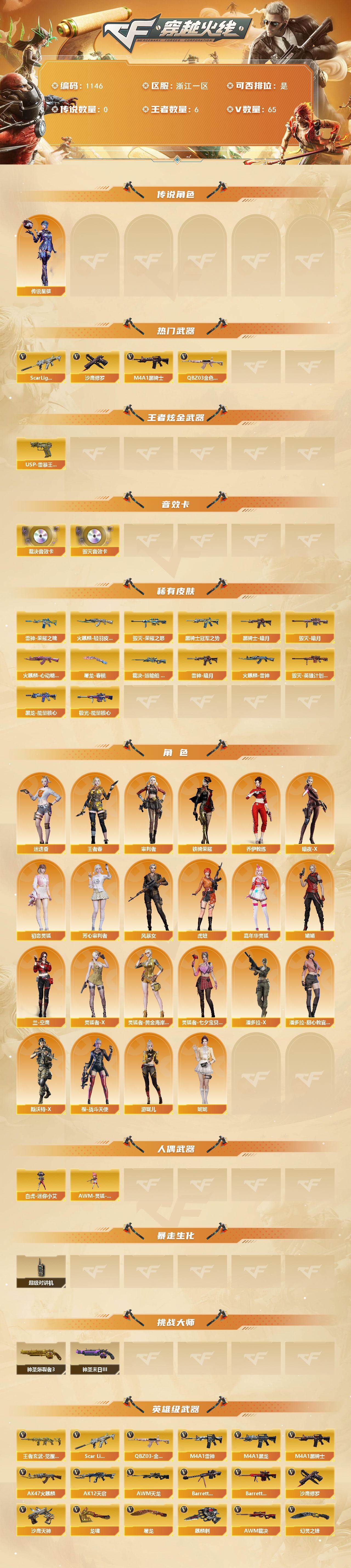 [15346437]浙江一区-65v-6王者-0炫金 【传说角色】:传说星骇 【热门武器】:q03-金色蔷薇,scar light-白虎,m4a1-黑骑士,沙鹰-修罗4 【王者炫金武器】:usp-雷暴王者 【音效卡】:barrett-毁灭音效卡,awm-裁决音效卡 【皮肤】:裁决-运输船 皮肤,雷神-暗月,雷神-荣耀之魄,火麒麟-雷神,火麒麟-轻羽皮肤,火麒麟-心动糖果,毁灭-暗月,毁灭-荣耀之怒,毁灭-英雄计划 皮肤,黑龙-能量核心,黑骑士-暗月,黑骑士-冠军之势,极光-能量核心,屠龙-春桃 皮肤 【角色】:迷迭香,审判者,妮妮,王者春,乔伊教练,暗夜-x,初恋灵狐,芳心审判者,风暴女,虎妞,嘉年华灵狐,娟娟,兰-空鹰,灵狐者-x,灵狐者-黄金海岸,灵狐者-七夕宝贝,潘多拉-x,潘多拉-甜心教官,斯沃特-x,铁骑荣耀,樱-战斗天使,游珑儿 【人偶武器】:白虎-迷你小艾,awm-灵狐-15周年嘉年华 【暴走生化】:超级对讲机 【挑战大师】:神圣爆裂者iii2,神圣爆裂者-末日iii 【英雄级武器】:ak47-火麒麟2,m4a1-黑龙,m4a1-雷神,m4a1-黑骑士,ak12-天启,scar light-白虎,无影-神兵利器,黑武士-锦绣游龙,q03-金色蔷薇,王者风势-觉醒版,王者玄武-觉醒版,awm-天龙,barrett-毁灭,barrett-极光2,awm-裁决,王者幻神-觉醒版,沙鹰-修罗4,沙鹰-天神,天神-动感闪耀,屠龙,龙啸,麒麟刺,幻灵之锋,屠龙-动感闪耀,斩神刀-雷暴,高爆手蕾-雷霆,高爆手蕾-雷暴2,高爆手蕾-幻灵2,高爆手蕾-神工天巧2,手蕾-动感闪耀,闪光丹-雷霆,闪光丹-雷暴2,闪光丹-幻灵3,闪光丹-神工天巧4,闪光丹-玄豹,闪光丹-雷霆王者-觉醒版,盐雾蛋-雷霆,盐雾蛋-雷暴2,盐雾蛋-幻灵3,盐雾蛋-神工天巧3,盐雾蛋-玄豹,盐雾蛋-荣耀世冠ep 【道具】:bs战队炫彩背包,cfs限定背包,全能呛王背包,战舰背包,炫彩背包,虎牙炫彩背包,哔哩哔哩名片,妩媚妖姬,绿色巨人,灵魂忍者,变异宝贝,迷雾幽灵,夺命之镰,防化服2,金色流光-呛王排位2,星辰流光-呛王排位,呛王排位28赛季金色流光,ep战队击杀图标,防弹头盔2,防弹衣2,c4工具钳2,手蕾包2 【特殊呛械】:1白虎,1黑骑士