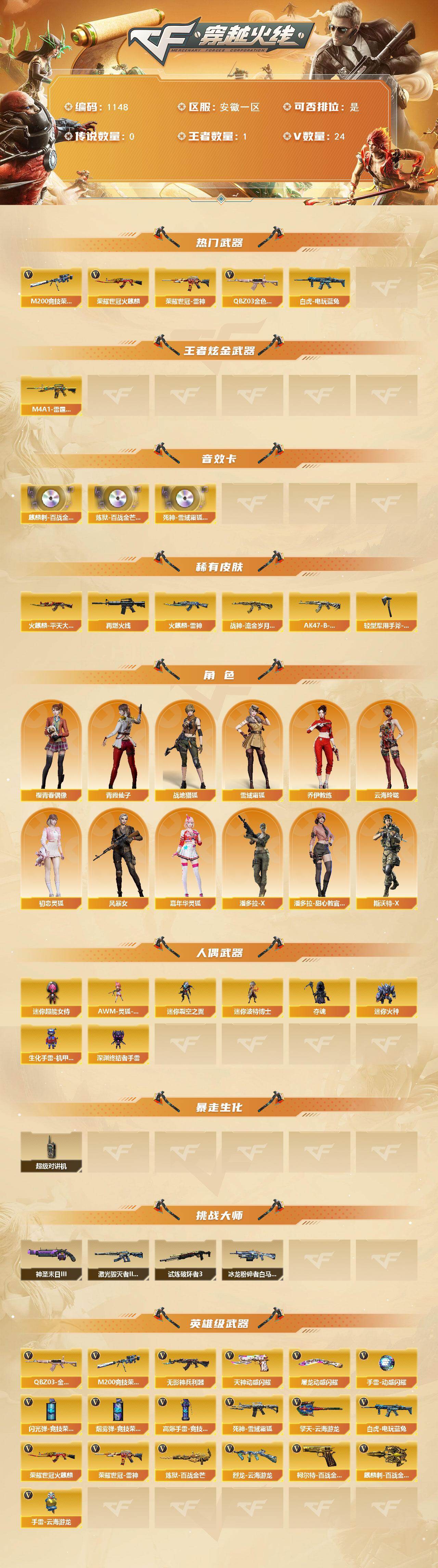[15346583]安徽一区-24v-1王者-0炫金 【热门武器】:q03-金色蔷薇,m200-竞技荣光,荣耀世冠-火麒麟,荣耀世冠-雷神,白虎-电玩蓝兔 【王者炫金武器】:m4a1-雷霆王者 【音效卡】:麒麟刺-百战金芒-盛典舞曲音效卡,炼狱-百战金芒-庆典舞曲音效卡,死神-雪域霜狐-怀旧音效卡 【皮肤】:m4a1-再燃火线,火麒麟-雷神2,火麒麟-平天大圣,战神-流金岁月皮肤2,ak47-b-常胜将军-刘备,轻型军用手斧-再燃火线 【角色】:战地猎狐,雪域霜狐,乔伊教练,云海玲珑,初恋灵狐,风暴女,嘉年华灵狐,潘多拉-x,潘多拉-甜心教官,青霞仙子,斯沃特-x,樱-青春偶像 【人偶武器】:awm-灵狐-15周年嘉年华2,迷你裂空之翼,迷你波特博士4,夺魂,迷你火种,生化手蕾-机甲核心2,深渊终结者手蕾,迷你超能女侍 【暴走生化】:超级对讲机 【挑战大师】:冰龙粉碎者-白马银呛,激光毁灭者iii-白马银呛3,试炼破坏者iii,神圣爆裂者-末日iii 【英雄级武器】:无影-神兵利器,死神-雪域霜狐,q03-金色蔷薇,白虎-电玩蓝兔,荣耀世冠-火麒麟,荣耀世冠-雷神,m200-竞技荣光,炼狱-百战金芒,烈龙-云海游龙,柯尔特-百战金芒,天神-动感闪耀,屠龙-动感闪耀,擎天-云海游龙,麒麟刺-百战金芒,高爆手蕾-竞技荣光,手蕾-动感闪耀,手蕾-云海游龙,闪光丹-竞技荣光,盐雾蛋-竞技荣光 【道具】:bs战队炫彩背包,q9战队炫彩背包,云山科技背包,云海游龙炫彩背包,全能呛王背包,次元之矛-背包,百战金芒炫彩背包,超级背包,雪域霜狐炫彩背包,圣拳猎手-炽雪,女皇终结者-魔龙之吻,救世主-黑桃战神,绿色巨人,灵魂忍者,迷雾幽灵,夺命之镰3,防化服6,金色流光-呛王排位2,星辰流光-呛王排位,语音特效-盛典烟火,语音特效-怀旧,雪域霜狐表情,萌萌小葵表情,电玩兔兔表情,云海游龙表情,防弹头盔7,防弹衣7,c4工具钳7,手蕾包7 【特殊呛械】: