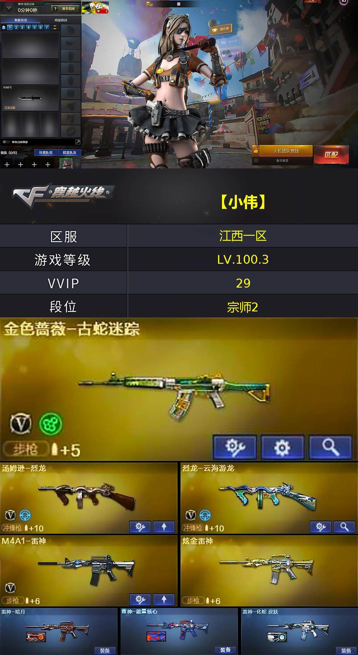 江西一区-26v-4王者-2炫金 【热门武器】:金色蔷薇-古蛇迷踪,修罗-古蛇迷踪,死亡之眼,汤姆逊-烈龙,沙鹰-修罗 【王者炫金武器】:王者之势,王者之影,炼狱-悦蓝,王者之啸,炫金千变,炫金雷神 【皮肤】:雷神-暗月,雷神-能量核心,雷神-化蛇 皮肤,毁灭-暗月,战神-粉色甜心皮肤,极光-能量核心,修罗-能量核心,龙啸-纸灯龙皮肤,擎天-秘银 【角色】:葵,隼,战地猎狐,蛇隐宗,乔伊教练,修道士,芳心审判者,娟娟,龙儿,潘多拉-x,潘多拉-甜心教官,青霞仙子,蛇姬,雪莉杨,影武者-x 【人偶武器】:街机小灰机,cop-旗袍,迷你裂空之翼,迷你波特博士,夺魂,生化手蕾-机甲核心2 【暴走生化】:死亡之眼 【挑战大师】:冰龙粉碎者-白马银呛,机甲撕裂者iii,试炼破坏者iii,kac-圣炎切割者iii 【英雄级武器】:m4a1-千变,ak47-火麒麟,m4a1-黑龙,m4a1-雷神,ak12-天启,ak47-机械迷城,无影-神兵利器,金色蔷薇-古蛇迷踪,ak47-b-战神,黑骑士-海王,awm-天龙,barrett-毁灭,barrett-极光2,汤姆逊-烈龙,烈龙-云海游龙,沙鹰-修罗,沙鹰-天神,修罗-古蛇迷踪,屠龙2,龙啸,擎天,麒麟刺,高爆手蕾-古蛇迷踪,盐雾蛋-古蛇迷踪,m4a1-赤狱骑士 【道具】:云山科技背包,亚洲杯纪念炫彩背包,古蛇迷踪炫彩背包,战舰背包,炫彩背包,背包-洛丽塔,女皇终结者-魔龙之吻,救世主-黑桃战神,黄金生化钩,绿色巨人,灵魂忍者,迷雾幽灵,夺命之镰,防化服2,流光-再燃火线,呛王排位29赛季金色流光,古蛇迷踪打击特效,蛇隐宗表情,电玩兔兔表情,云海游龙表情,c4-红龙,防弹头盔3,防弹衣3,c4工具钳3,手蕾包3 【特殊呛械】:1烈龙