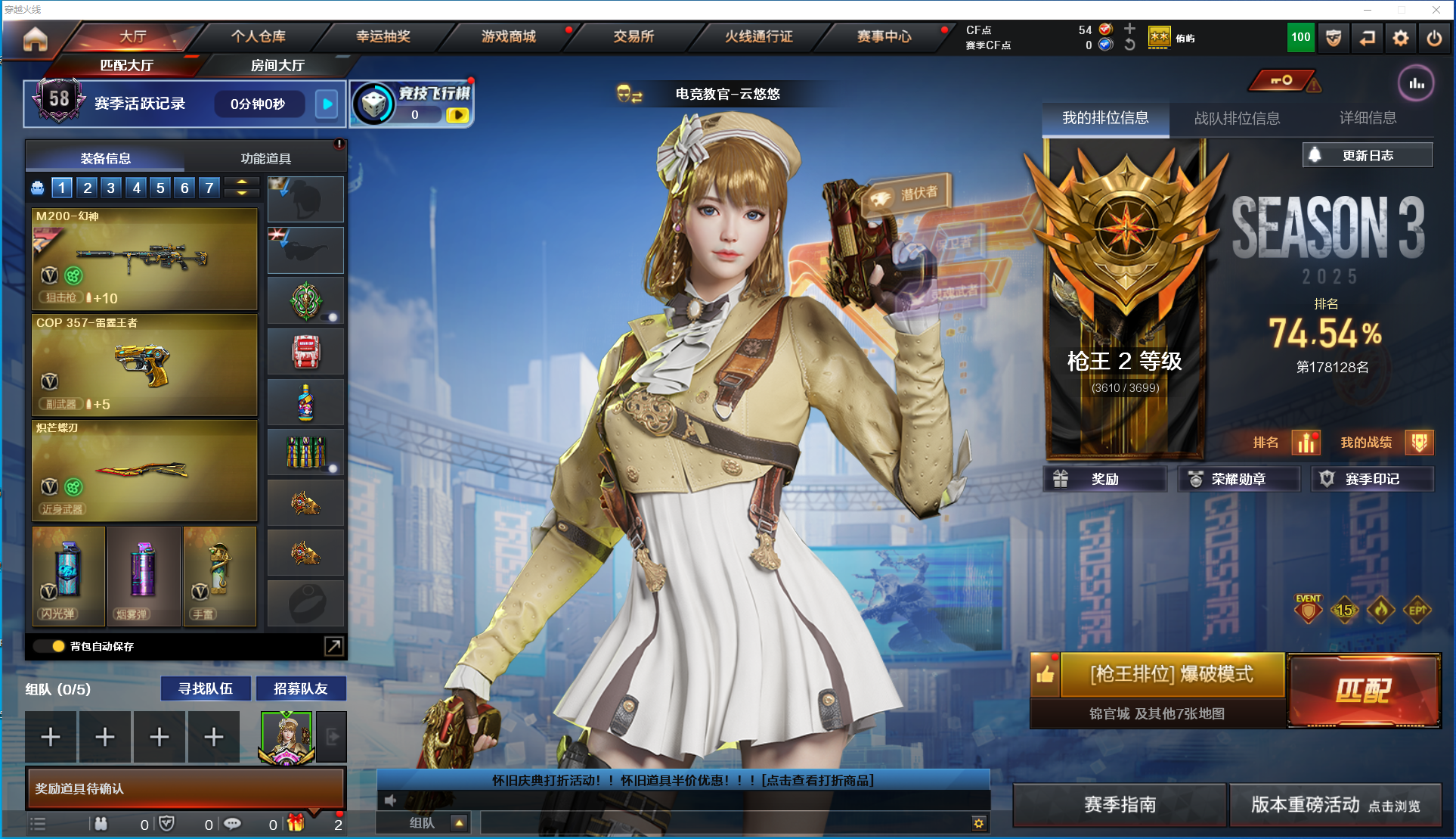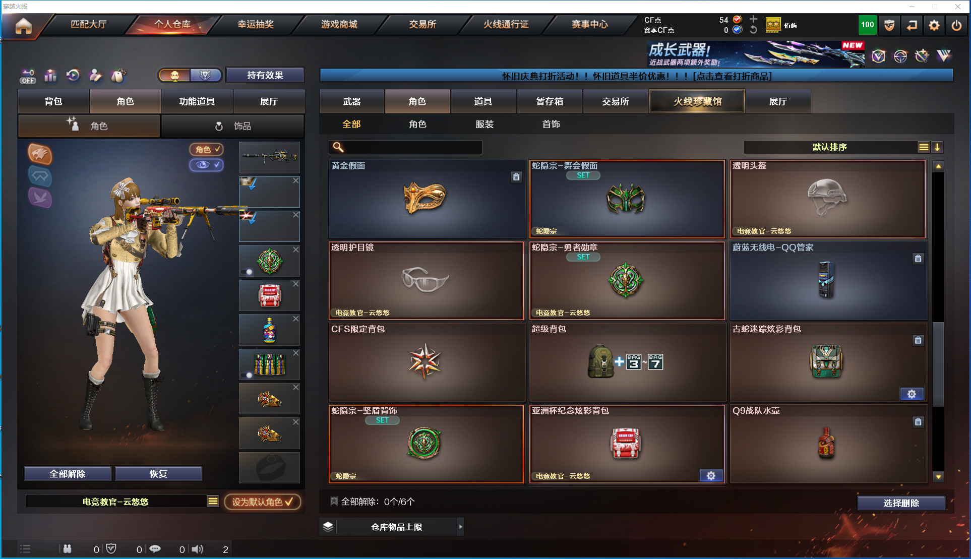 [15399554]实名: 可修改 排位资格: 有 v武器: ak47-火麒麟m4a1-雷神m4a1-猎神barrett-毁灭barrett-极光awm-裁决m200-幻神m200-竞技荣光柯尔特-竞技荣光擎天-竞技荣光q03天罚炽芒蝶刃g36c-幻影ak47-黑武士-锦绣游龙金色蔷薇-古蛇迷踪修罗-古蛇迷踪 王者武器: 雷霆王者之锋cop 357-雷霆王者-觉醒版王者风势-觉醒版 狙击呛稀有皮肤: 幻神-cfs2022裁决-流光秘银 英雄角色: 电竞教官-云悠悠王者炫 音效道具: m200-幻神音效卡