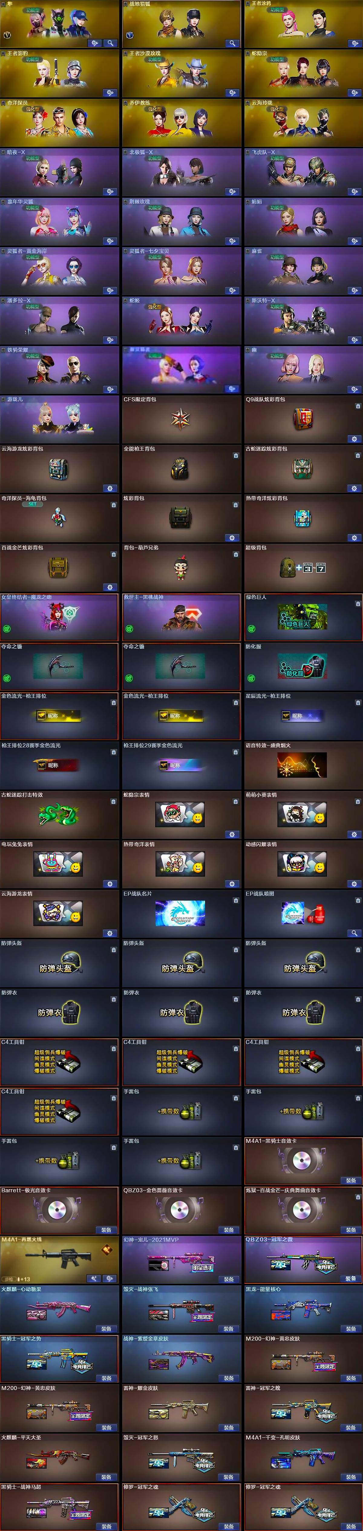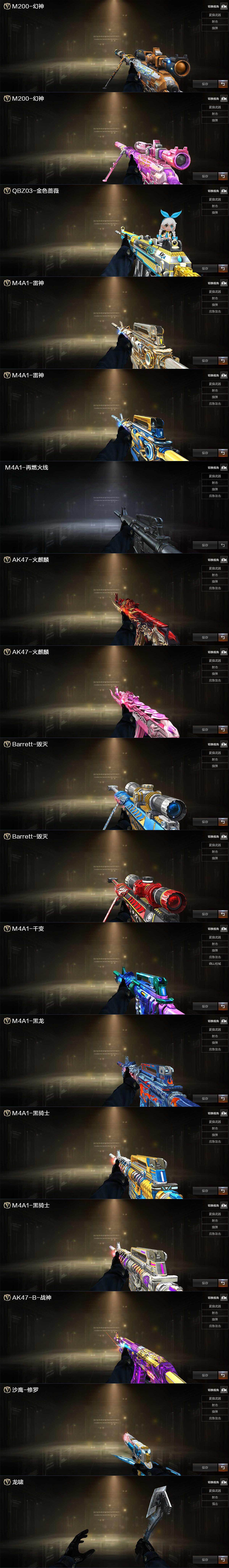 江苏一区-108v-3王者-3炫金 【传说武器】:传说圣灵 【热门武器】:传说圣灵,q03-金色蔷薇,m200-幻神,金色蔷薇-古蛇迷踪,修罗-古蛇迷踪,白虎-电玩蓝兔,柯尔特-冠军之特,m4a1-黑骑士3,汤姆逊-烈龙5,rpk-盘龙3,加特林-炼狱4,羊驼玩偶,cop 357-幻灵,沙鹰-修罗5,knife-冠军之刃 【王者炫金武器】:炫金火麒麟,炫金骑士,炫金毁灭 【音效卡