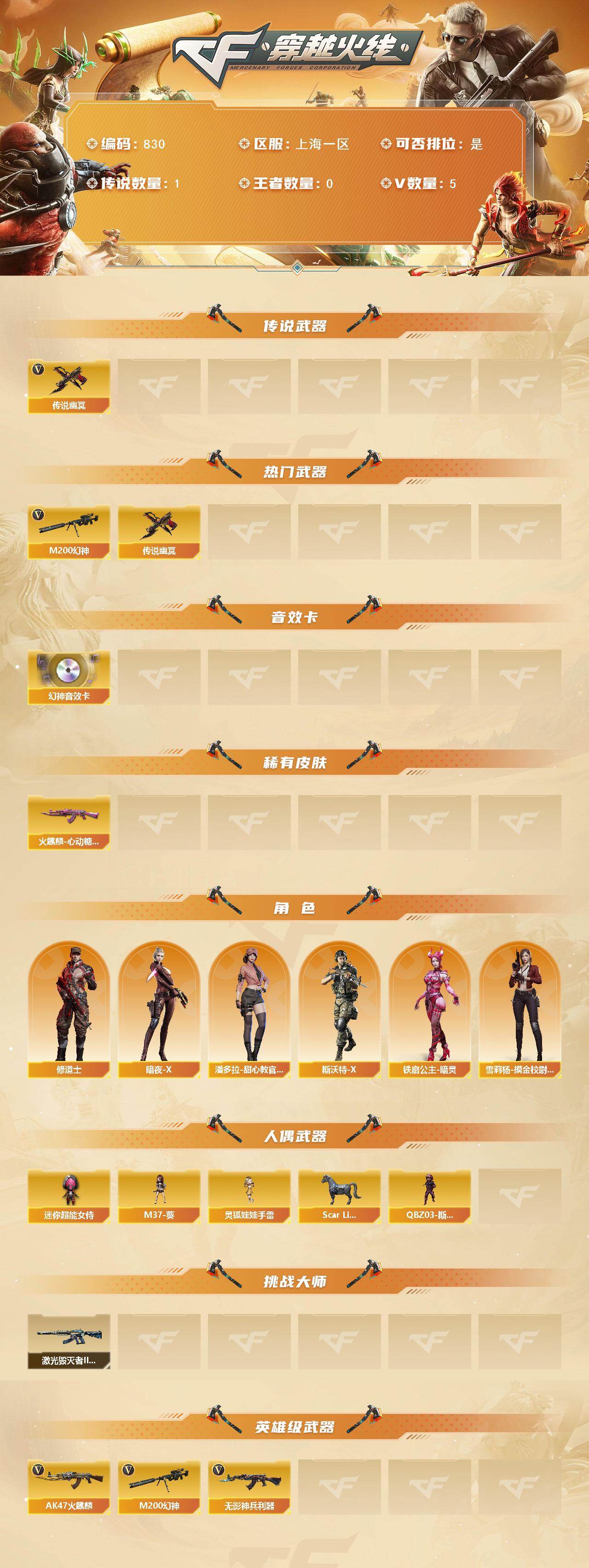 [15401156]上海一区-5v-0王者-0炫金 【传说武器】:传说幽冥 【热门武器】:传说幽冥,m200-幻神 【音效卡】:m200-幻神音效卡 【皮肤】:火麒麟-心动糖果 【角色】:修道士,暗夜-x,潘多拉-甜心教官,斯沃特-x,铁扇公主-暗灵,雪莉杨-摸金校尉 【人偶武器】:scar light-马呛,m37-葵,迷你超能女侍,q03-斯沃特,灵狐娃娃手蕾 【挑战大师】:激光毁灭者iii-白马银呛 【英雄级武器】:ak47-火麒麟,无影-神兵利器,m200-幻神 【道具】:亚洲杯纪念炫彩背包,救世主-黑桃战神,绿色巨人,灵魂忍者,迷雾幽灵,夺命之镰,防化服2,金色流光-呛王排位,流光-鎏金之域,呛王排位29赛季金色流光,防弹头盔2,防弹衣2,c4工具钳2,手蕾包2 【特殊呛械】:
