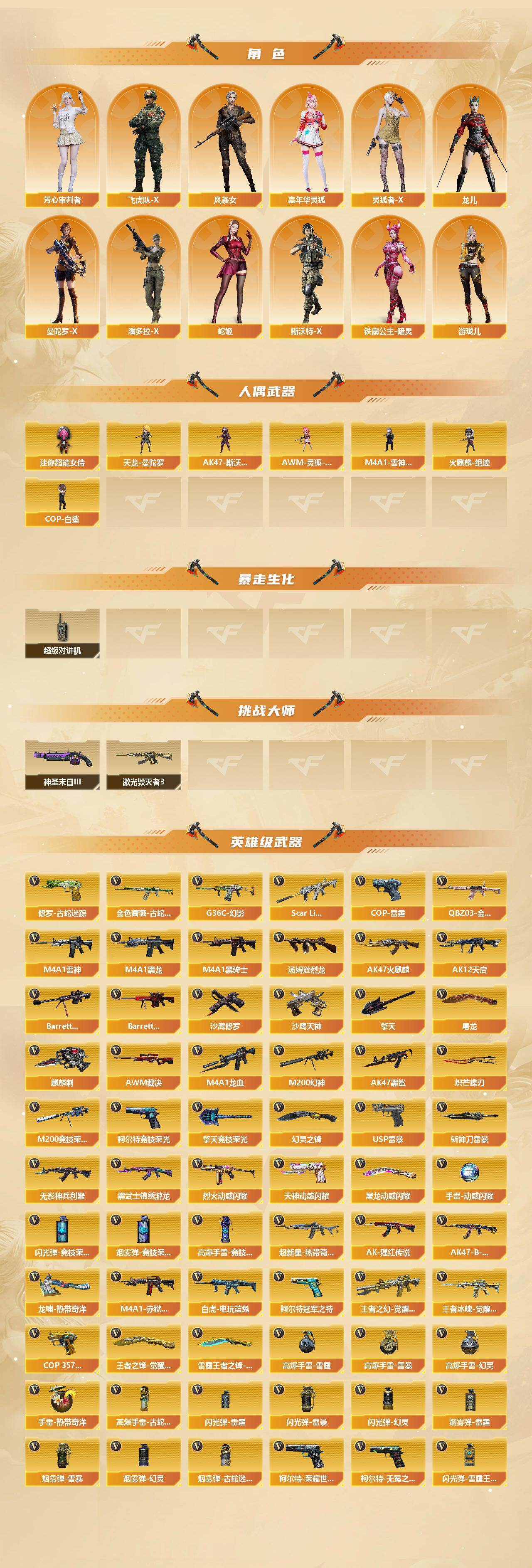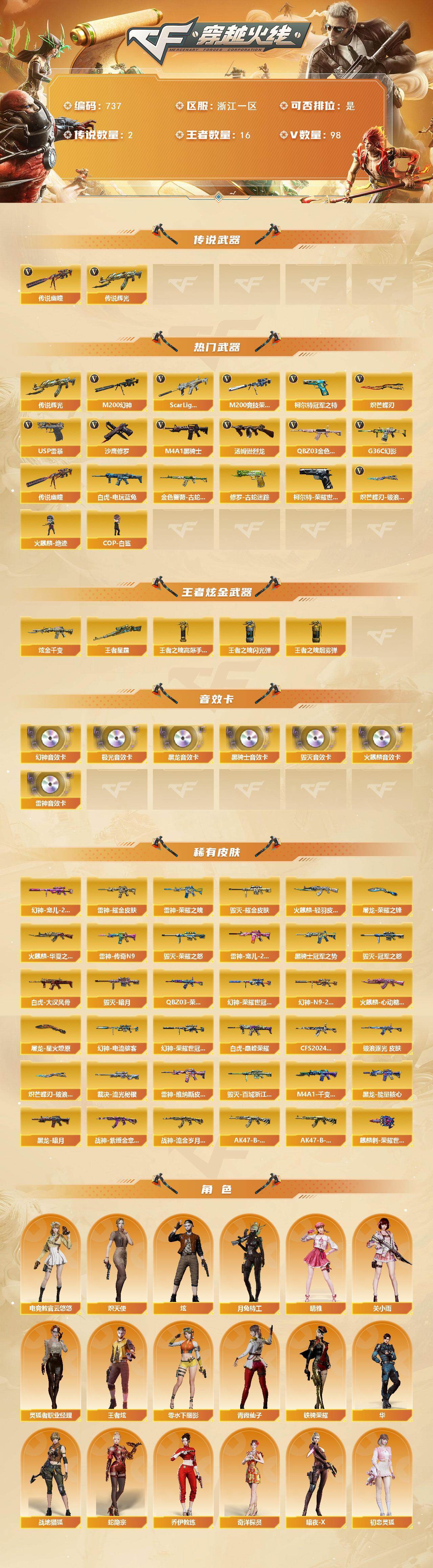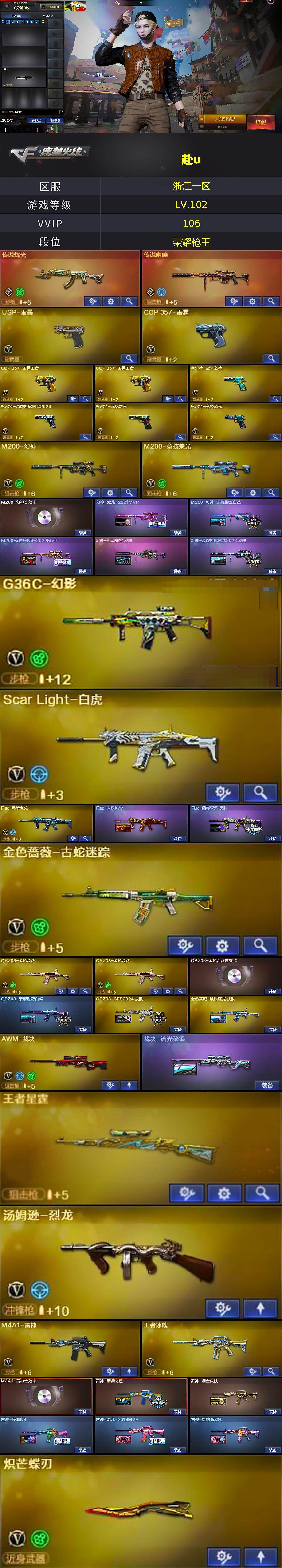浙江一区-98v-16王者-1炫金 【传说武器】:传说辉光,传说幽瞳 【热门武器】:传说辉光,传说幽瞳,g36c-幻影,q03-金色蔷薇2,scar light-白虎,m200-幻神,柯尔特-荣耀世冠白鲨2023,金色蔷薇-古蛇迷踪,修罗-古蛇迷踪,m200-竞技荣光,白虎-电玩蓝兔,柯尔特-冠军之特,m4a1-黑骑士,汤姆逊-烈龙,火麒麟-绝迹,cop-白鲨,usp-雷暴,沙鹰-修罗5,炽芒蝶刃,炽芒蝶刃-破浪逐光 皮肤 【王者炫金武器】:王者星霆,炫金千变,王者之魄高爆手蕾,王者之魄闪光丹2,王者之魄盐雾蛋2 【音效卡】:m200-幻神音效卡,ak47-火麒麟音效卡,m4a1-雷神音效卡,m4a1-黑龙音效卡,m4a1-黑骑士音效卡,barrett-毁灭音效卡,barrett-极光音效卡 【皮肤】:幻神-宠儿-2021mvp,m200-幻神-荣耀世冠白鲨,m200-幻神-n9-2022mvp,幻神-电流骇客 皮肤,幻神-荣耀世冠白鲨2023 皮肤,白虎-大汉风骨,白虎-巅峰荣耀 皮肤,q03-荣耀世冠白鲨,q03-cfs2024 皮肤,金色蔷薇-破浪逐光 皮肤,裁决-流光秘银,雷神-荣耀之魄,雷神-耀金皮肤,雷神-传奇n9,雷神-宠儿-2019mvp,雷神-维纳斯皮肤,火麒麟-华夏之心,火麒麟-轻羽皮肤,火麒麟-心动糖果,毁灭-暗月,毁灭-荣耀之怒,毁灭耀金皮肤,毁灭-冠军之怒,毁灭-百城浙江 皮肤,m4a1-千变-孔明皮肤,黑龙-能量核心,黑龙-暗月,黑骑士-冠军之势,战神-紫绶金章皮肤,战神-流金岁月皮肤,ak47-b-常胜将军-刘备,ak47-b-常胜将军-孙权,屠龙-荣耀之锋,屠龙-星火燎原,麒麟刺-荣耀世冠白鲨,炽芒蝶刃-破浪逐光 皮肤 【角色】:炫,电竞教官-云悠悠,月兔特工,关小雨,晴雅,华,战地猎狐,王者炫,蛇隐宗,奇洋探员,乔伊教练,炽天使,暗夜-x,初恋灵狐,芳心审判者,飞虎队-x,风暴女,嘉年华灵狐,零-水下丽影,灵狐者-x,灵狐者-职业经理,龙儿,曼陀罗-x,潘多拉-x,青霞仙子,蛇姬,斯沃特-x,铁骑荣耀,铁扇公主-暗灵,游珑儿 【人偶武器】:火麒麟-绝迹,cop-白鲨,天龙-曼陀罗,m4a1-雷神-精英刀锋,awm-灵狐-15周年嘉年华,ak47-斯沃特,迷你超能女侍 【暴走生化】:超级对讲机 【挑战大师】:激光毁灭者iii,神圣爆裂者-末日iii 【英雄级武器】:ak47-火麒麟2,m4a1-黑龙,m4a1-雷神,m4a1-黑骑士,ak12-天启,ak47-黑鲨,m4a1-龙血,scar light-白虎,无影-神兵利器,g36c-幻影,黑武士-锦绣游龙,超新星-热带奇洋,金色蔷薇-古蛇迷踪,q03-金色蔷薇2,烈火-动感闪耀,王者之幻-觉醒版,ak-47-猩红传说,ak47-b-战神,王者冰魄-觉醒版,白虎-电玩蓝兔,barrett-毁灭,barrett-极光,awm-裁决,m200-幻神,m200-竞技荣光,汤姆逊-烈龙,沙鹰-修罗5,沙鹰-天神3,usp-雷暴,cop-雷霆,cop 357-雷霆王者-觉醒版2,柯尔特-冠军之特,柯尔特-荣耀世冠白鲨2023,柯尔特-无冕之王,柯尔特-竞技荣光,天神-动感闪耀,修罗-古蛇迷踪,屠龙2,擎天,麒麟刺,幻灵之锋2,擎天-竞技荣光,炽芒蝶刃,屠龙-动感闪耀,龙啸-热带奇洋,斩神刀-雷暴,王者之锋-觉醒版,雷霆王者之锋-觉醒版,高爆手蕾-雷霆5,高爆手蕾-雷暴,高爆手蕾-幻灵2,高爆手蕾-竞技荣光2,手蕾-动感闪耀,手蕾-热带奇洋,高爆手蕾-古蛇迷踪,闪光丹-雷霆6,闪光丹-雷暴,闪光丹-幻灵2,闪光丹-竞技荣光3,闪光丹-雷霆王者-觉醒版,盐雾蛋-雷霆7,盐雾蛋-雷暴,盐雾蛋-幻灵3,盐雾蛋-竞技荣光4,盐雾蛋-古蛇迷踪,盐雾蛋-雷霆王者-觉醒版,m4a1-赤狱骑士 【道具】:泡泡象背包,bs战队炫彩背包,古蛇迷踪炫彩背包,奇洋探员-海龟背包,热带奇洋炫彩背包,虎牙炫彩背包,超级背包,哔哩哔哩名片,女皇终结者-魔龙之吻,救世主-黑桃战神,黄金生化钩,绿色巨人,灵魂忍者,变异宝贝,迷雾幽灵,生化弹匣,夺命之镰,防化服2,金色流光-呛王排位2,星辰流光-呛王排位,巅峰赛先锋-金色流光,流光-再燃火线,呛王排位28赛季金色流光,呛王排位29赛季金色流光,语音特效-机器人,古蛇迷踪打击特效,蛇隐宗表情,电玩兔兔表情,热带奇洋表情,动感闪耀表情,ep战队名片,c4-再燃火线,防弹头盔3,防弹衣3,c4工具钳3,手蕾包3 【特殊呛械】:1白虎,1黑骑士,1烈龙