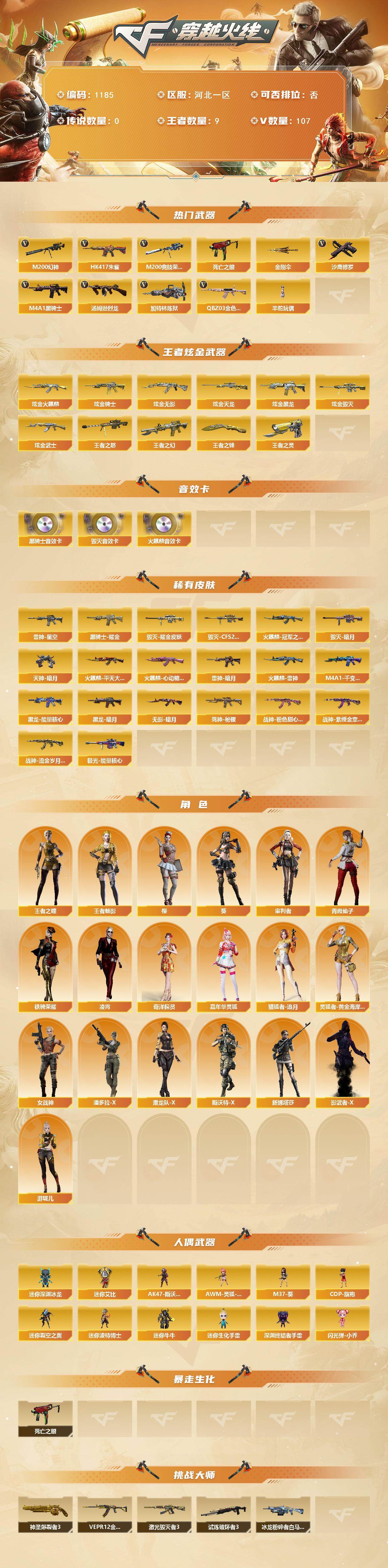 [15452567]河北一区-107v-9王者-8炫金 【热门武器】:q03-金色蔷薇,hk417-朱雀,m200-幻神,m200-竞技荣光,死亡之眼3,m4a1-黑骑士,汤姆逊-烈龙4,加特林-炼狱3,羊驼玩偶,沙鹰-修罗4,金刚伞 【王者炫金武器】:王者之幻,王者之怒,王者之灵,王者之锋,炫金火麒麟,炫金骑士,炫金无影,炫金黑龙,炫金武士,炫金毁灭,炫金天龙2 【音效卡】:ak47-火麒麟音效卡,m4a1-黑骑士音效卡,barrett-毁灭音效卡 【皮肤】:雷神-暗月,雷神-星空,火麒麟-雷神,火麒麟-冠军之心,火麒麟-平天大圣,火麒麟-心动糖果,毁灭-暗月3,毁灭耀金皮肤,毁灭-cfs2020,m4a1-千变-孔明皮肤,黑龙-能量核心,黑龙-暗月,黑骑士耀金皮肤,无影-暗月2,死神-秘银2,战神-粉色甜心皮肤2,战神-紫绶金章皮肤4,战神-流金岁月皮肤3,极光-能量核心,天神-暗月 【角色】:葵,樱,凌霄,审判者,王者之瞳,王者-魅影,奇洋探员,嘉年华灵狐,猎狐者-追月,灵狐者-黄金海岸,女战神,潘多拉-x,潜龙队-x,青霞仙子,斯沃特-x,铁骑荣耀,新娜塔莎,影武者-x,游珑儿 【人偶武器】:awm-灵狐-15周年嘉年华,m37-葵,cop-旗袍,迷你深渊冰龙,迷你裂空之翼,迷你波特博士8,迷你牛牛,迷你生化手蕾,深渊终结者手蕾,闪光丹-小乔,ak47-斯沃特,迷你艾比 【暴走生化】:死亡之眼3 【挑战大师】:神圣爆裂者iii,冰龙粉碎者-白马银呛,vepr-12-金魔,激光毁灭者iii,试炼破坏者iii2 【英雄级武器】:m4a1-千变,ak47-火麒麟2,m4a1-黑龙5,m4a1-雷神3,m4a1-黑骑士,ak47-黑武士2,an94-超新星,ak47-机械迷城,ak47-黑鲨3,ak47-雷暴,hk417-朱雀,m4a1-夜魔2,黑武士-锦绣游龙,m4a1-玫瑰精灵,q03-金色蔷薇,王者之魄-觉醒版,ak-47-猩红传说5,ak47-b-战神,王者冰魄-觉醒版,awm-天龙,barrett-毁灭3,awm-裁决,m200-幻神,m200-竞技荣光,barrett-金色蔷薇,王者之光-觉醒版,加特林-炼狱3,汤姆逊-烈龙4,沙鹰-修罗4,沙鹰-天神,柯尔特-竞技荣光,破空呛刃-夜魔2,屠龙,龙啸,马来剑-夜魔