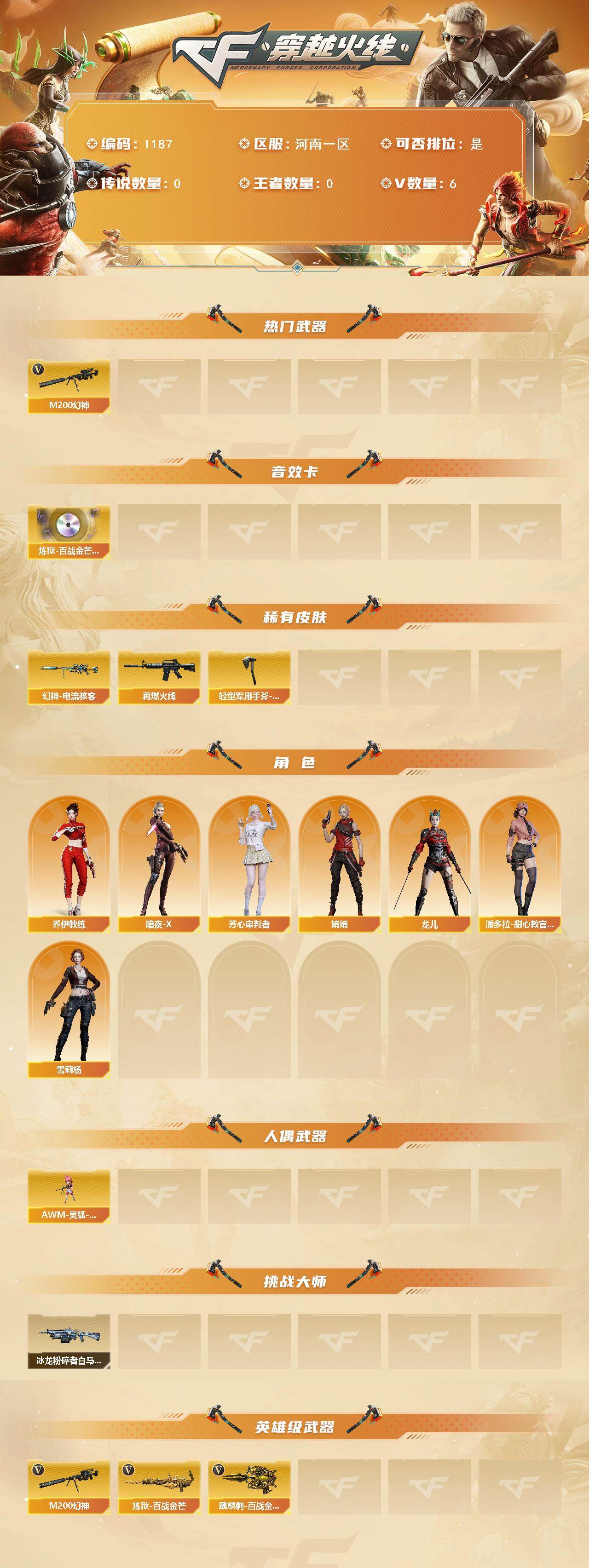 [15452966]河南一区-6v-0王者-0炫金 【热门武器】:m200-幻神 【音效卡】:炼狱-百战金芒-庆典舞曲音效卡 【皮肤】:幻神-电流骇客 皮肤,m4a1-再燃火线,轻型军用手斧-再燃火线 【角色】:乔伊教练,暗夜-x,芳心审判者,娟娟,龙儿,潘多拉-甜心教官,雪莉杨 【人偶武器】:awm-灵狐-15周年嘉年华 【挑战大师】:冰龙粉碎者-白马银呛 【英雄级武器】:m200-幻神,炼狱-百战金芒,麒麟刺-百战金芒 【道具】:bs战队炫彩背包,百战金芒炫彩背包,超级背包,女皇终结者-魔龙之吻,绿色巨人,灵魂忍者2,变异宝贝,迷雾幽灵2,夺命之镰,防化服3,金色流光-呛王排位,语音特效-盛典烟火,萌萌小葵表情,防弹头盔4,防弹衣4,c4工具钳4,手蕾包4 【特殊呛械】: