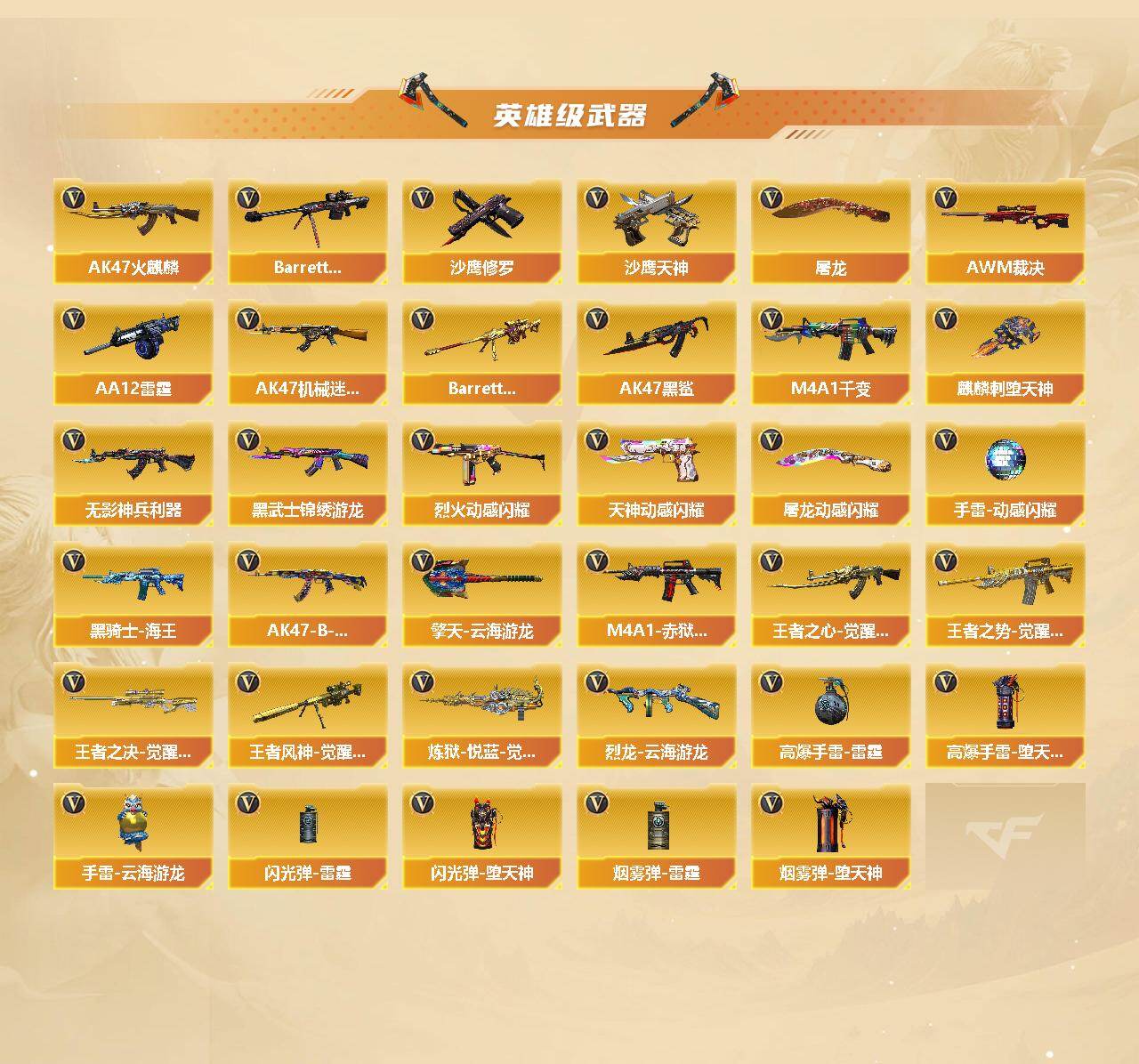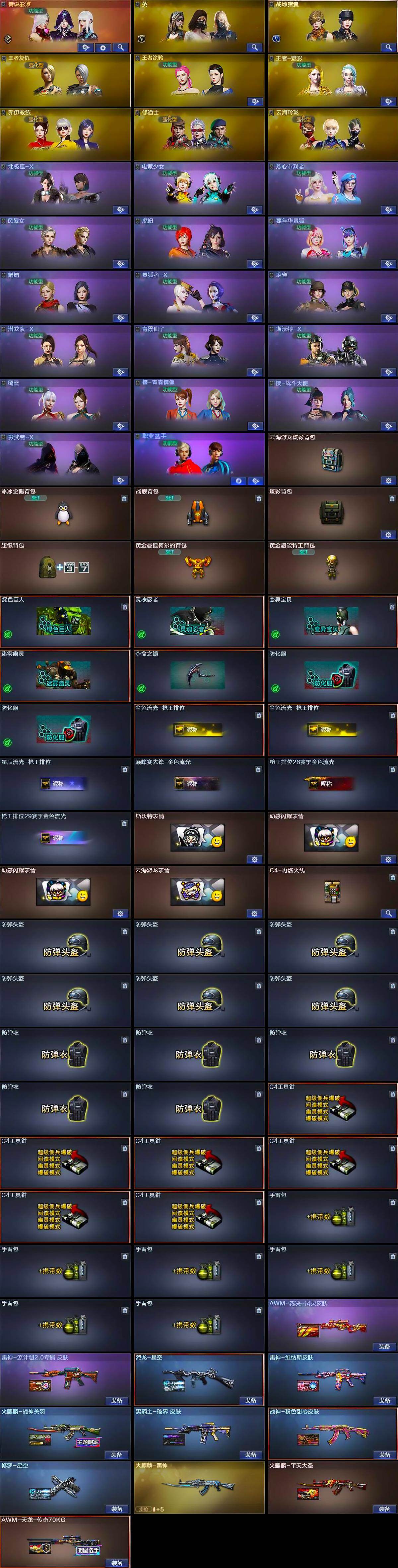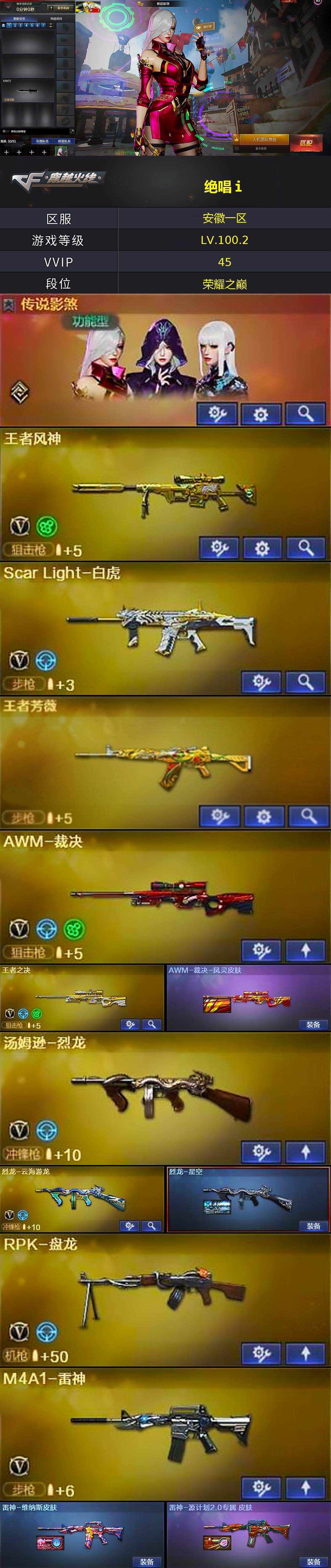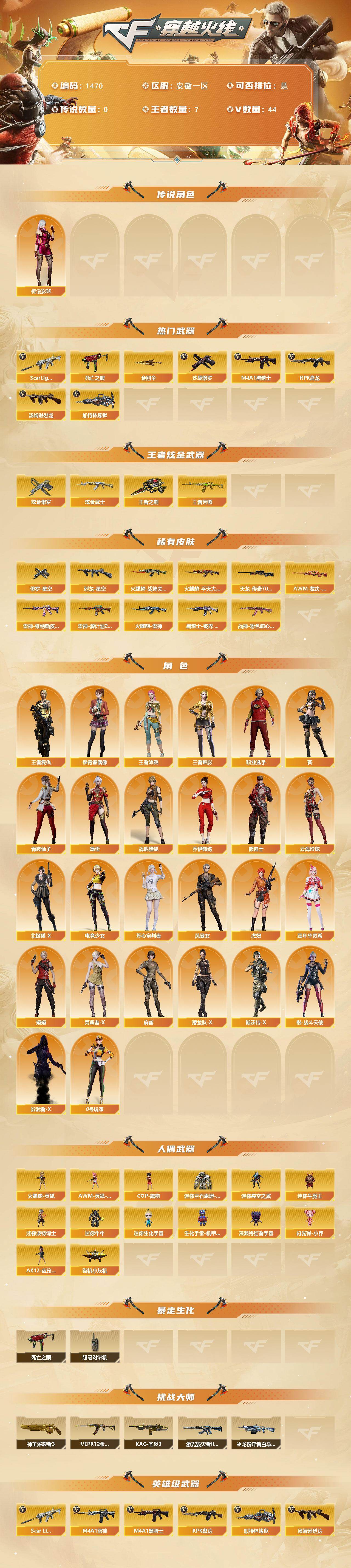 安徽一区-44v-7王者-2炫金 【传说角色】:传说影煞 【热门武器】:scar light-白虎,死亡之眼,m4a1-黑骑士,汤姆逊-烈龙,rpk-盘龙,加特林-炼狱,沙鹰-修罗,金刚伞 【王者炫金武器】:王者芳薇,王者之刺,炫金武士,炫金修罗 【皮肤】:awm-裁决-凤灵皮肤,烈龙-星空,雷神-维纳斯皮肤,雷神-源计划2.0专属 皮肤,火麒麟-雷神,火麒麟-战神关羽,火麒麟-平天大圣,黑骑