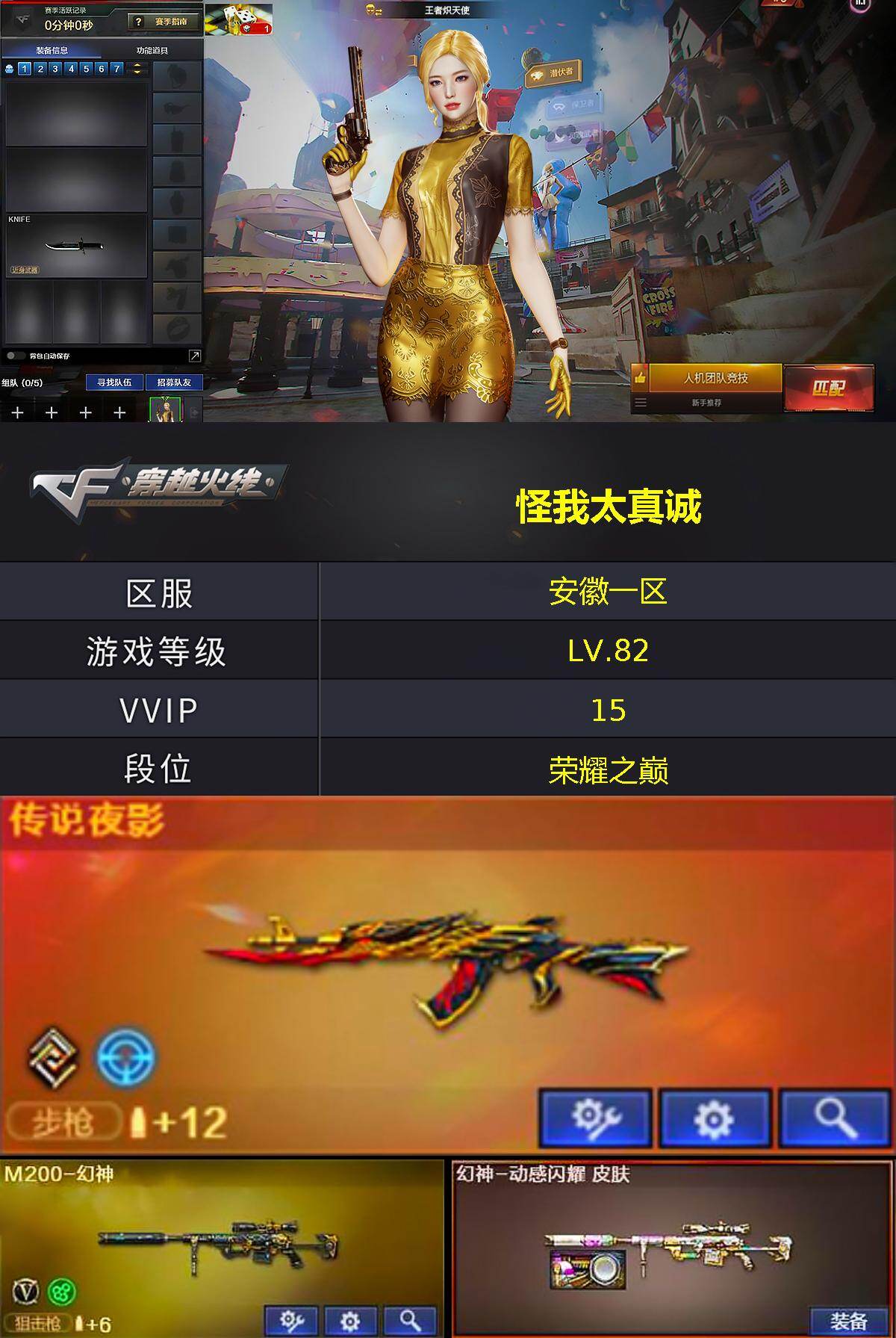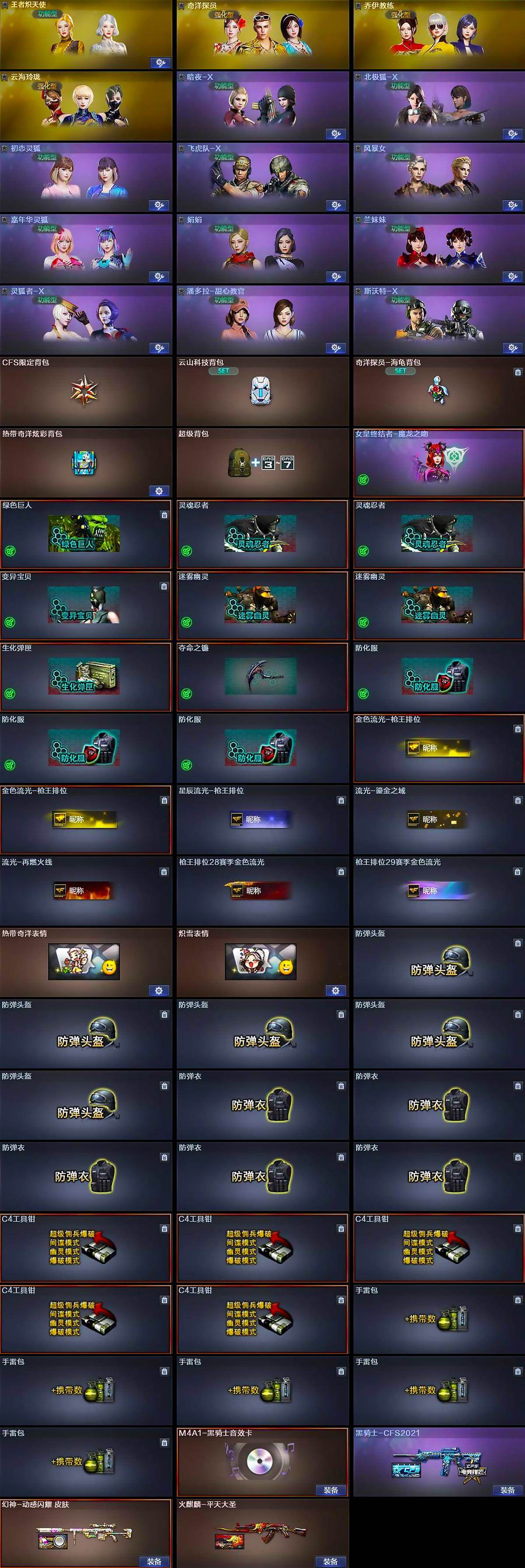 [15457993]安徽一区-11v-1王者-0炫金 【传说武器】:传说夜影 【热门武器】:传说夜影,m200-幻神,牛牛-ak47,m4a1-黑骑士,金刚伞 【王者炫金武器】:王者玉锋 【音效卡】:m4a1-黑骑士音效卡 【皮肤】:幻神-动感闪耀 皮肤,火麒麟-平天大圣,黑骑士-cfs2021 【角色】:王者炽天使,奇洋探员,乔伊教练,云海玲珑,暗夜-x,北极狐-x,初恋灵狐,飞虎队-x,风暴女,嘉年华灵狐,娟娟,兰妹妹,灵狐者-x,潘多拉-甜心教官,斯沃特-x 【人偶武器】:awm-灵狐-15周年嘉年华,牛牛-ak47,迷你艾比 【挑战大师】:激光毁灭者iii-白马银呛 【英雄级武器】:ak47-火麒麟,m4a1-黑龙,m4a1-黑骑士,无影-神兵利器,黑武士-锦绣游龙,超新星-热带奇洋,m200-幻神,麒麟刺,龙啸-热带奇洋,高爆手蕾-幻灵,手蕾-动感闪耀,手蕾-热带奇洋 【道具】:cfs限定背包,云山科技背包,奇洋探员-海龟背包,热带奇洋炫彩背包,超级背包,女皇终结者-魔龙之吻,绿色巨人,灵魂忍者2,变异宝贝,迷雾幽灵2,生化弹匣,夺命之镰,防化服3,金色流光-呛王排位2,星辰流光-呛王排位,流光-鎏金之域,流光-再燃火线,呛王排位28赛季金色流光,呛王排位29赛季金色流光,热带奇洋表情,炽雪表情,防弹头盔5,防弹衣5,c4工具钳5,手蕾包5 【特殊呛械】:1黑骑士