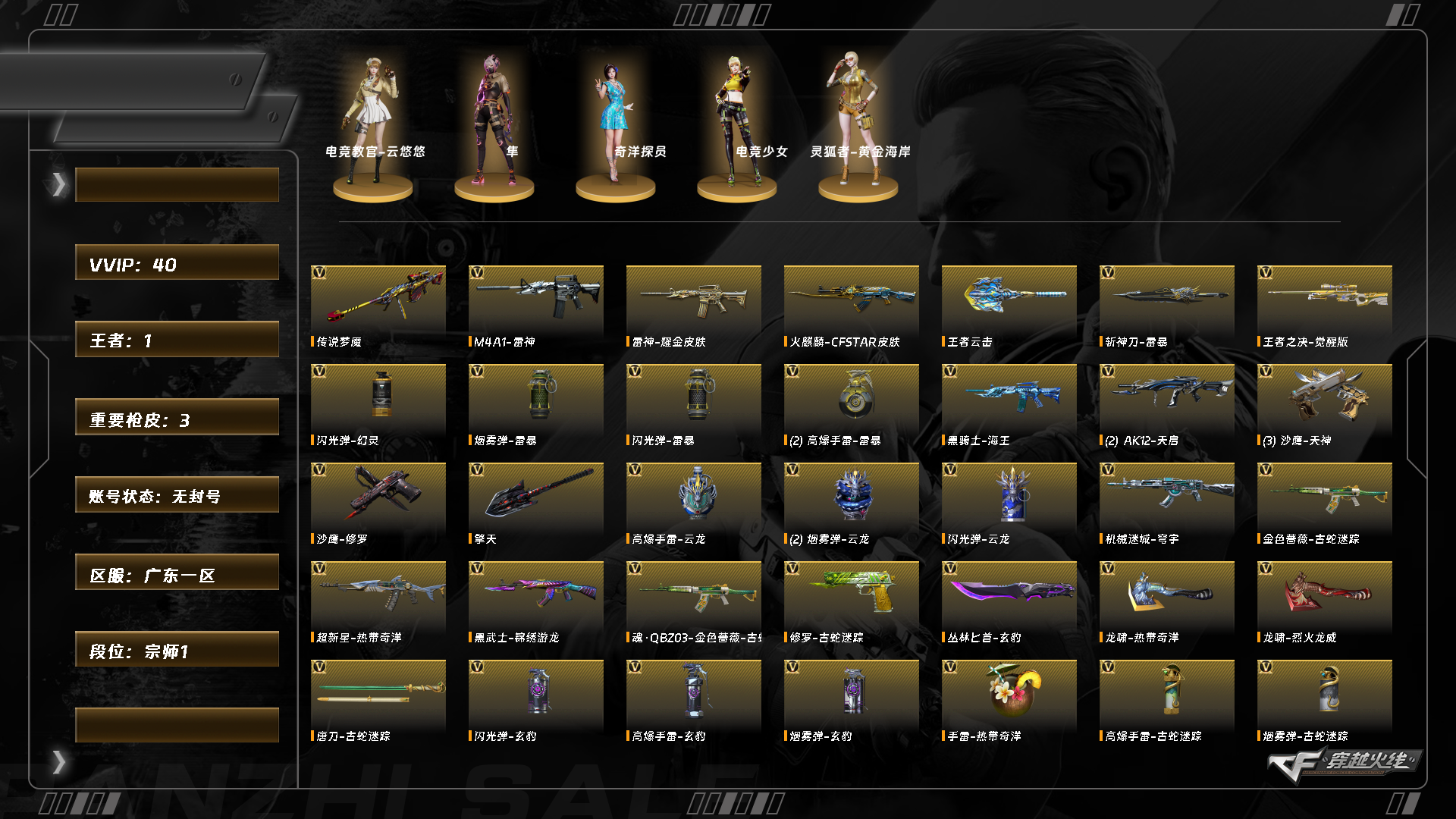 [15473122]abc9432/南部/广东一区/钱包注销/可排位/可二次/掌火id746706627/38v/传说梦魇/幻神魅影/王者之决/金色蔷薇古蛇迷踪/雷神/天启/黑武士锦绣游龙/黑骑士海王/机械迷城穹宇/斩神刀雷暴/丛林匕首玄豹/王者云击/玄豹手蕾套/雷暴手蕾套/云龙手蕾套/朱雀蛇隐宗/mk5炽火炎龙/四防已开/电竞教官云悠悠/四防未开/隼/【皮肤】/火麒麟cfstar/雷神耀金/永久ac/细节看图/