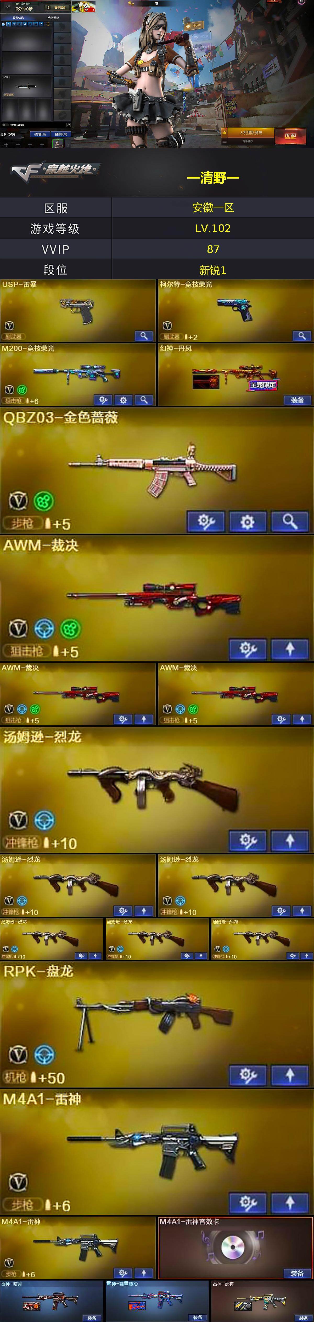 安徽一区-6v-0王者-0炫金 【角色】:葵,樱,魅影,电竞教官-云悠悠,审判者,战地猎狐,王者春,雪域霜狐,奇洋探员,乔伊教练,云海玲珑,飞虎队-x,风暴女2,疾风,娟娟,兰-海滩派对,零-水下丽影,灵狐者-黄金海岸,麻雀,潜龙队-x,莎莎,铁骑荣耀,影武者-x,游珑儿 【特殊呛械】: