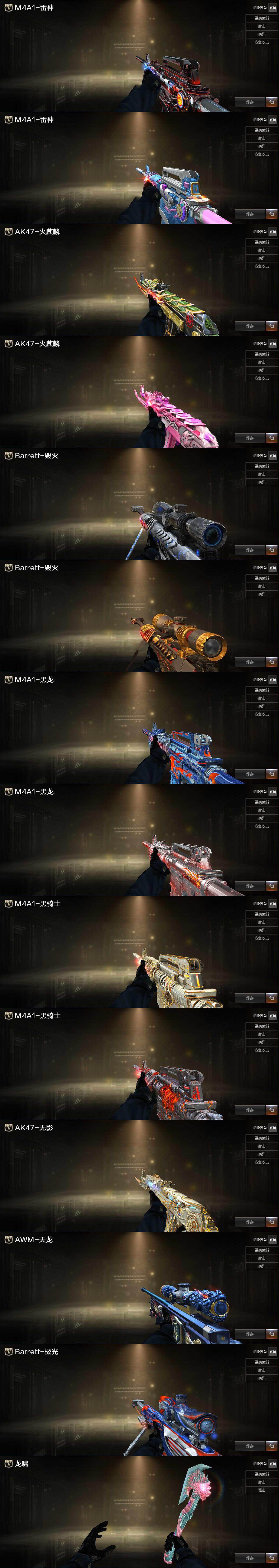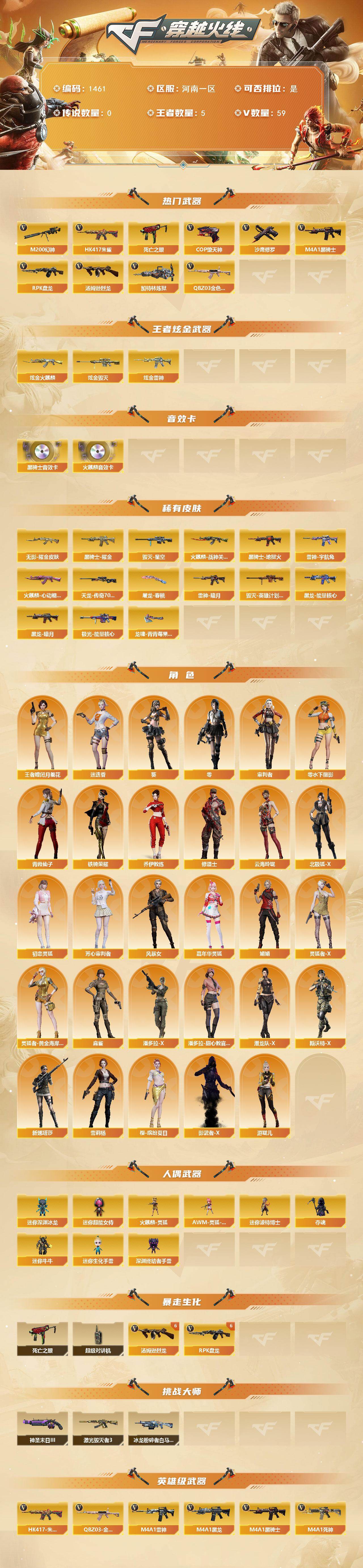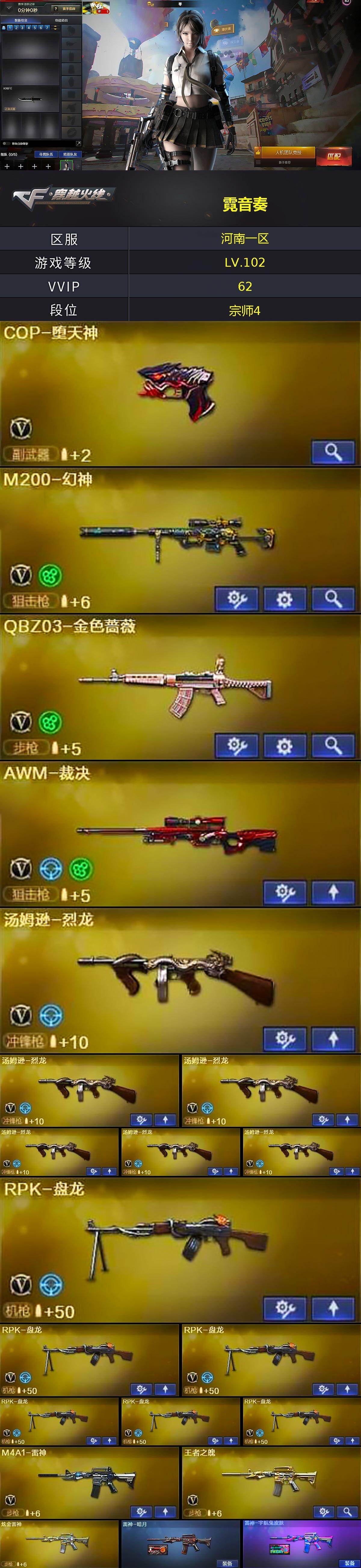河南一区-59v-5王者-5炫金 【热门武器】:q03-金色蔷薇,hk417-朱雀,m200-幻神,死亡之眼,m4a1-黑骑士,汤姆逊-烈龙6,rpk-盘龙6,加特林-炼狱2,cop-堕天神,沙鹰-修罗3 【王者炫金武器】:炫金火麒麟,炫金雷神,炫金毁灭3 【音效卡】:ak47-火麒麟音效卡,m4a1-黑骑士音效卡 【皮肤】:雷神-暗月,雷神-宇航兔皮肤,火麒麟-战神关羽2,火