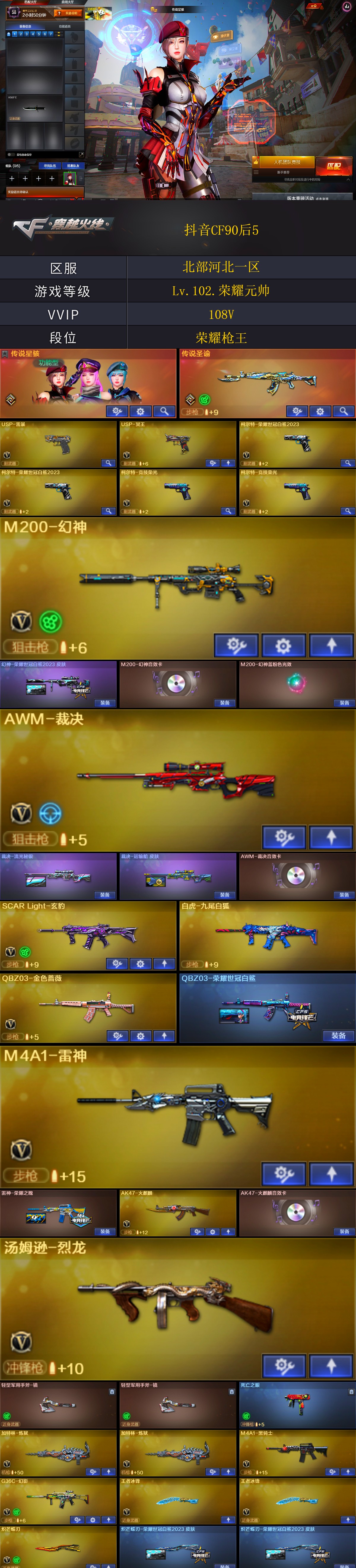 【★找回包赔★北部4127】:北部河北一区-108v-可二次实名-【lv.102.荣耀元帅】-【段位:荣耀呛王】m200-幻神/幻神-荣耀世冠白鲨2023皮肤/awm-裁决/裁决-流光秘银/q03-金色薇/q03-荣耀世冠白鲨/usp-雷暴/柯尔特-荣耀世冠白鲨20232/柯尔特-竞技荣光2/g36c-幻影/炽芒蝶刃/炽芒蝶刃-荣耀世冠白鲨2023皮肤2/汤姆逊-烈龙/加特林-炼狱2/m4a1-黑骑士/雷神-荣耀之魄/毁灭-荣耀之怒/m200-幻神音效卡/awm-裁决音效卡/barrett-毁灭音效卡/白虎-九尾白狐/高爆手蕾-雷霆4/闪光丹-雷霆4/盐雾蛋-雷霆4(截图展示段位不代表实际段位,如赛季更新等不可抗拒因素发生变化,其余道具看截图或咨询客服)