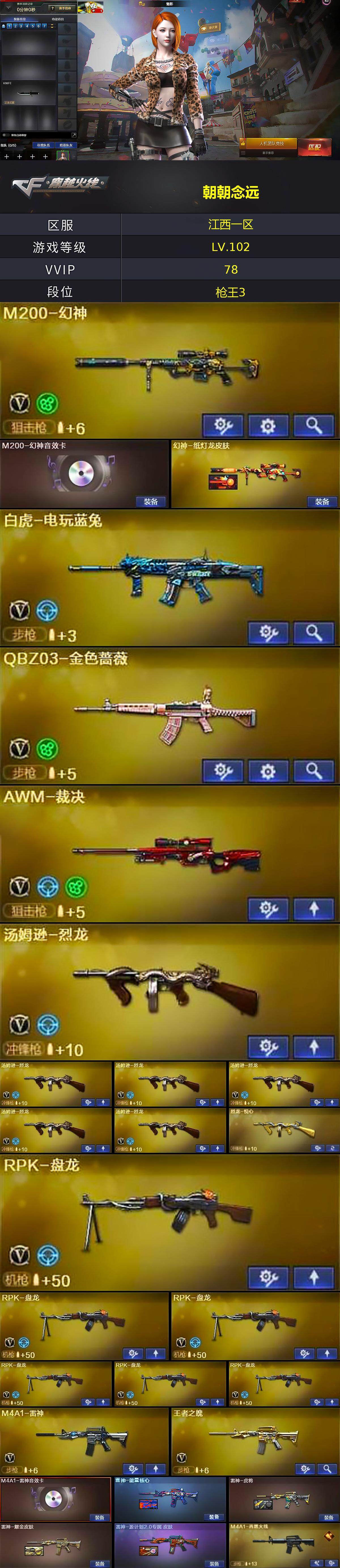 [15304541]江西一区-70v-15王者-2炫金 【热门武器】:q03-金色蔷薇,hk417-朱雀,m200-幻神,修罗-古蛇迷踪,死亡之眼2,白虎-电玩蓝兔,金色小号,c.a.t,牛牛-ak47,m4a1-黑骑士,汤姆逊-烈龙6,rpk-盘龙6,加特林-炼狱2,沙鹰-修罗4 【王者炫金武器】:王者之戮,王者之翼,玫瑰精灵-悦动,烈龙-悦心,王者之啸,炫金骑士,炫金天龙 【音效卡】:天神-动感闪耀 音效卡,m200-幻神音效卡,ak47-火麒麟音效卡,m4a1-雷神音效卡,m4a1-黑骑士音效卡,barrett-毁灭音效卡,barrett-碧霄极光音效卡,炼狱-百战金芒-庆典舞曲音效卡 【皮肤】:幻神-纸灯龙皮肤,雷神-能量核心,雷神-虎将,雷神-耀金皮肤,雷神-源计划2.0专属 皮肤,m4a1-再燃火线,火麒麟-雷神,火麒麟-冠军之心,火麒麟-心动糖果,毁灭耀金皮肤,毁灭-星空,毁灭-百城浙江 皮肤,毁灭-英雄计划 皮肤,黑龙-能量核心,黑龙-暗月,黑骑士-暗月,无影-暗月,战神-粉色甜心皮肤,战神-紫绶金章皮肤,战神-流金岁月皮肤,ak47-b-常胜将军-刘备,极光-能量核心,轻型军用手斧-再燃火线 【角色】:魅影,司雨,审判者,战地猎狐,王者-瞳-闭月羞花,雪域霜狐,蛇隐宗,奇洋探员,乔伊教练,修道士,云海玲珑,暗夜-x,初恋灵狐,芳心审判者,飞虎队-x,风暴女,嘉年华灵狐,娟娟,兰-海滩派对,灵狐者-x,龙儿,潘多拉-x,潘多拉-甜心教官,蛇姬,斯沃特-x,蜀雪,铁骑荣耀,兔囡囡,影武者-x,游珑儿 【人偶武器】:天龙-乔伊教练,scar light-马呛,awm-灵狐-15周年嘉年华,海滩汪汪-芭蕾特,cop-旗袍,c.a.t,牛牛-ak47,迷你深渊冰龙2,迷你裂空之翼,迷你波特博士,夺魂2,深渊终结者手蕾2,迷你超能女侍,迷你巨石泰坦-魔花研究所 【暴走生化】:死亡之眼2,超级对讲机 【挑战大师】:冰龙粉碎者-白马银呛,激光毁灭者iii-白马银呛,激光毁灭者iii,kac-圣炎切割者iii,神圣爆裂者-末日iii 【英雄级武器】:ak47-火麒麟2,m4a1-黑龙,m4a1-雷神,m4a1-黑骑士,ak47-无影,m4a1-死神,ak47-机械迷城,ak47-黑鲨,hk417-朱雀,无影-神兵利器,黑武士-锦绣游龙,超新星-热带奇洋,q