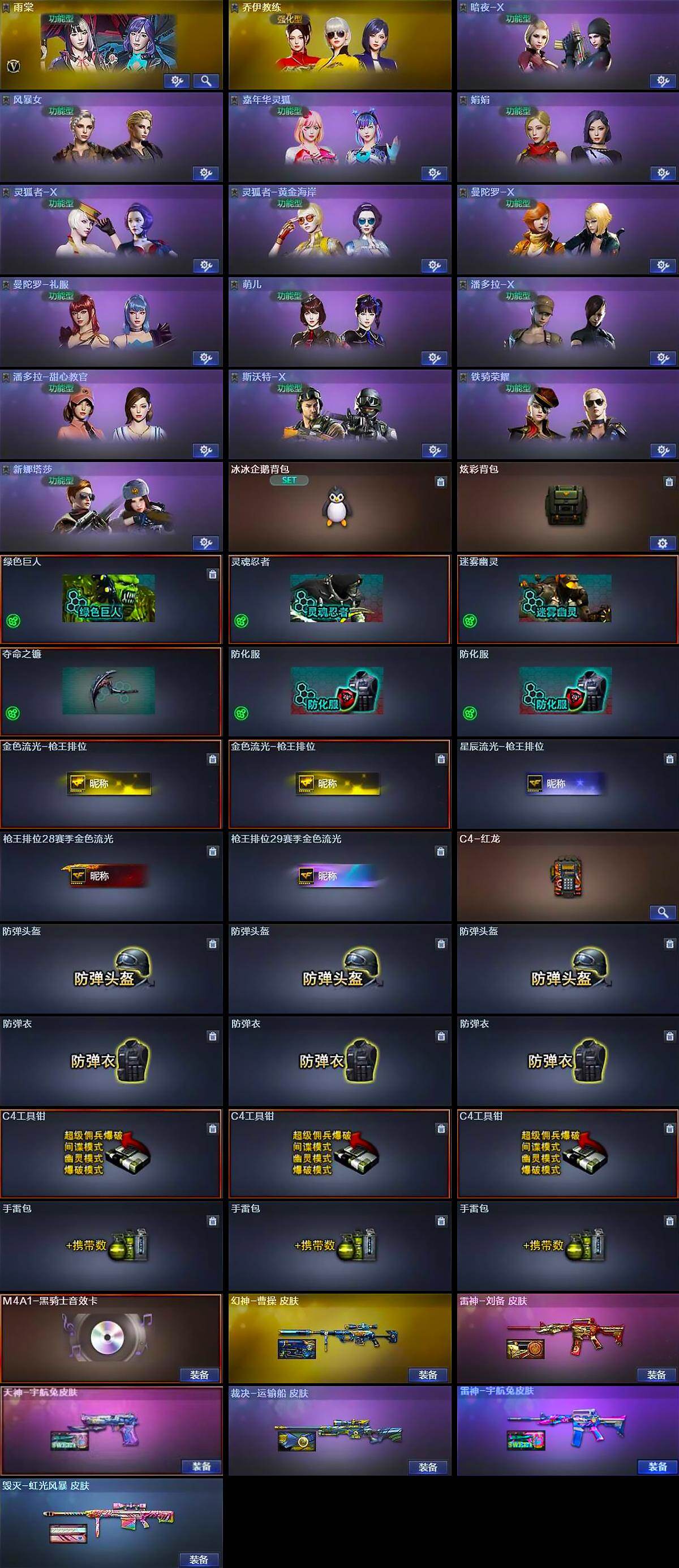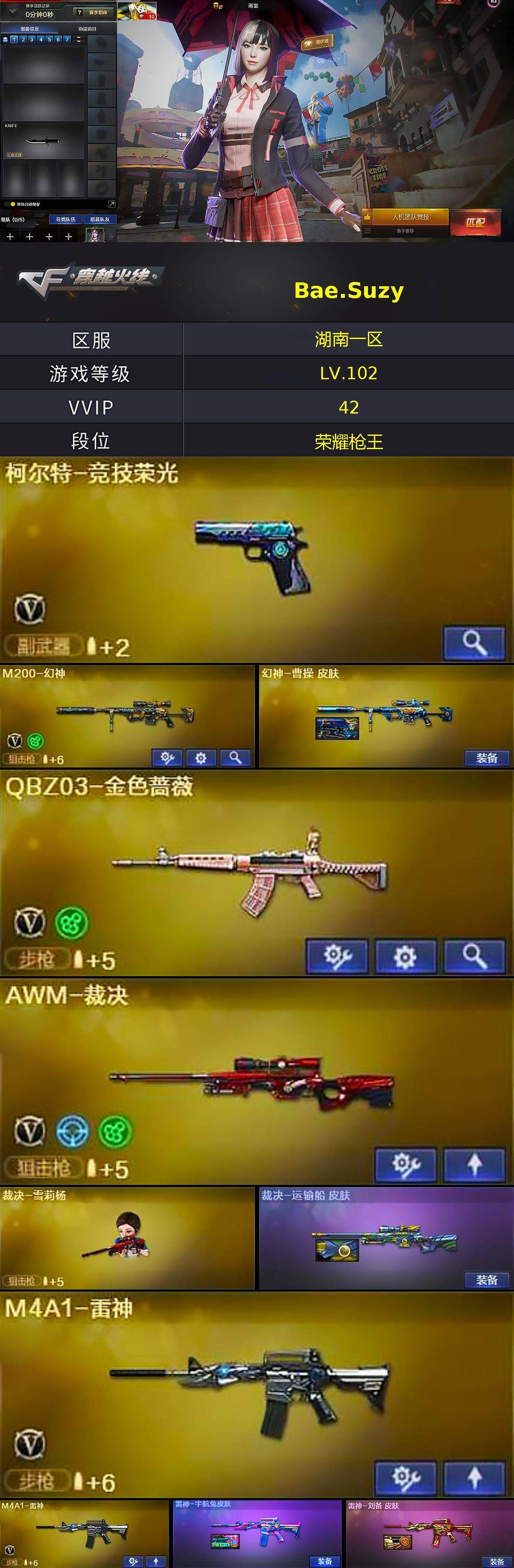 湖南一区-43v-3王者-0炫金 【热门武器】:q03-金色蔷薇,m4a1-青龙,m200-幻神,m4a1-黑骑士,裁决-雪莉杨,沙鹰-修罗2 【音效卡】:m4a1-黑骑士音效卡 【皮肤】:幻神-曹操 皮肤,裁决-运输船 皮肤,雷神-宇航兔皮肤,雷神-刘备 皮肤,毁灭-虹光风暴 皮肤,毁灭-英雄计划 皮肤,天神-宇航兔皮肤 【角色】:雨棠,乔伊教练,暗夜-x,风暴女,嘉年华灵狐,娟娟,灵