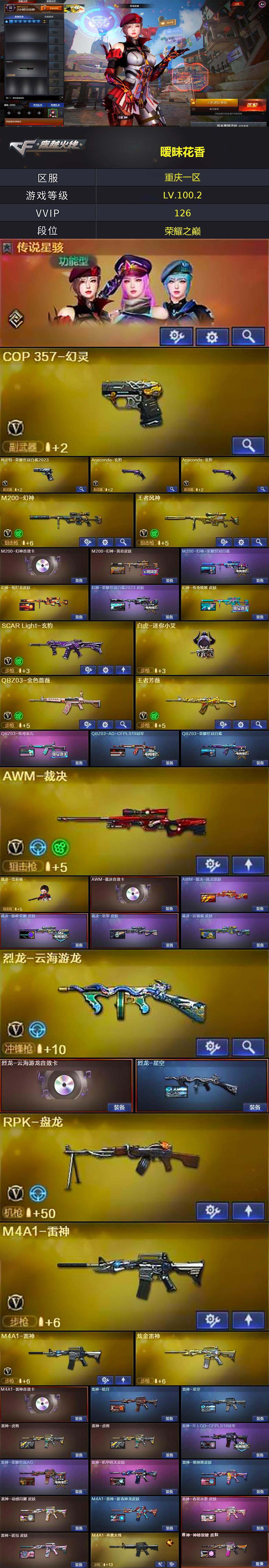 重庆一区-129v-18王者-4炫金 【传说角色】:传说星骇 【热门武器】:q03-金色蔷薇,m14ebr-玄武,m4a1-青龙,m200-幻神,柯尔特-荣耀世冠白鲨2023,m4a1-黑骑士2,rpk-盘龙,加特林-炼狱,金色蔷薇-空,裁决-雪莉杨,cop-白鲨2,cop 357-幻灵,沙鹰-修罗2,柯尔特-赛博朋克,cop 357-极地霜雄 【王者炫金武器】:王者凤吟2,王者云