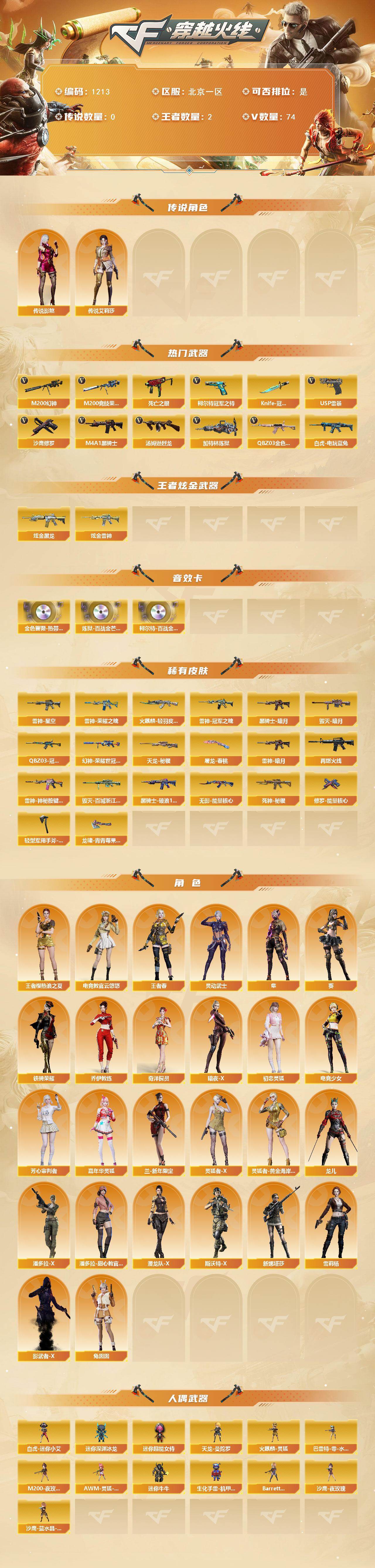 [15521685]北京一区-74v-2王者-2炫金 【传说角色】:传说艾莉莎,传说影煞 【热门武器】:q03-金色蔷薇,m200-幻神,m200-竞技荣光,死亡之眼,白虎-电玩蓝兔,柯尔特-冠军之特,m4a1-黑骑士2,汤姆逊-烈龙,加特林-炼狱,usp-雷暴,沙鹰-修罗4,knife-冠军之刃 【王者炫金武器】:炫金黑龙,炫金雷神 【音效卡】:q03-金色蔷薇-热带奇洋音效卡,炼狱-百战金芒-庆典舞曲音效卡,柯尔特-百战金芒-庆典舞曲音效卡 【皮肤】:m200-幻神-荣耀世冠白鲨,q03-冠军之薇,雷神-暗月,雷神-荣耀之魄,雷神-星空,雷神-冠军之魄,m4a1-再燃火线,雷神-神秘按键 皮肤,火麒麟-轻羽皮肤,毁灭-暗月,毁灭-百城浙江 皮肤,黑骑士-暗月,黑骑士-破浪10年皮肤,无影-能量核心,死神-秘银,天龙-秘银2,修罗-能量核心2,屠龙-春桃 皮肤,轻型军用手斧-再燃火线,龙啸-青青莓果 皮肤 【角色】:葵,电竞教官-云悠悠,隼,王者樱-热浪之夏,王者春,奇洋探员,乔伊教练,暗夜-x,初恋灵狐,电竞少女,芳心审判者,嘉年华灵狐,兰-新年限定,灵动武士,灵狐者-x,灵狐者-黄金海岸,龙儿,潘多拉-x,潘多拉-甜心教官,潜龙队-x,斯沃特-x,铁骑荣耀,兔囡囡,新娜塔莎,雪莉杨,影武者-x 【人偶武器】:白虎-迷你小艾,天龙-曼陀罗,火麒麟-灵狐,芭蕾特-零-水下丽影,barrett-云海玲珑,awm-灵狐-15周年嘉年华,迷你深渊冰龙,迷你牛牛,生化手蕾-机甲核心,沙鹰-蓝水晶-曼陀罗,m200-夜玫瑰,迷你超能女侍,沙鹰-夜玫瑰 【暴走生化】:黑龙吞噬者,死亡之眼,超级对讲机 【挑战大师】:冰龙粉碎者-白马银呛,激光毁灭者iii,神圣爆裂者-末日iii2 【英雄级武器】:ak47-火麒麟,m4a1-黑龙,m4a1-雷神2,m4a1-黑骑士2,ak47-无影,无影-神兵利器,黑武士-锦绣游龙,超新星-热带奇洋,q03-金色蔷薇,烈火-动感闪耀,王者之势-觉醒版,ak-47-猩红传说,白虎-电玩蓝兔,awm-天龙,barrett-毁灭,m200-幻神,m200-竞技荣光,王者之怒-觉醒版,加特林-炼狱,炼狱-百战金芒,汤姆逊-烈龙,沙鹰-修罗4,沙鹰-天神,usp-雷暴,柯尔特-冠军之特,柯尔特-竞技荣光,天神-动感闪耀,屠龙,龙啸,擎天,麒