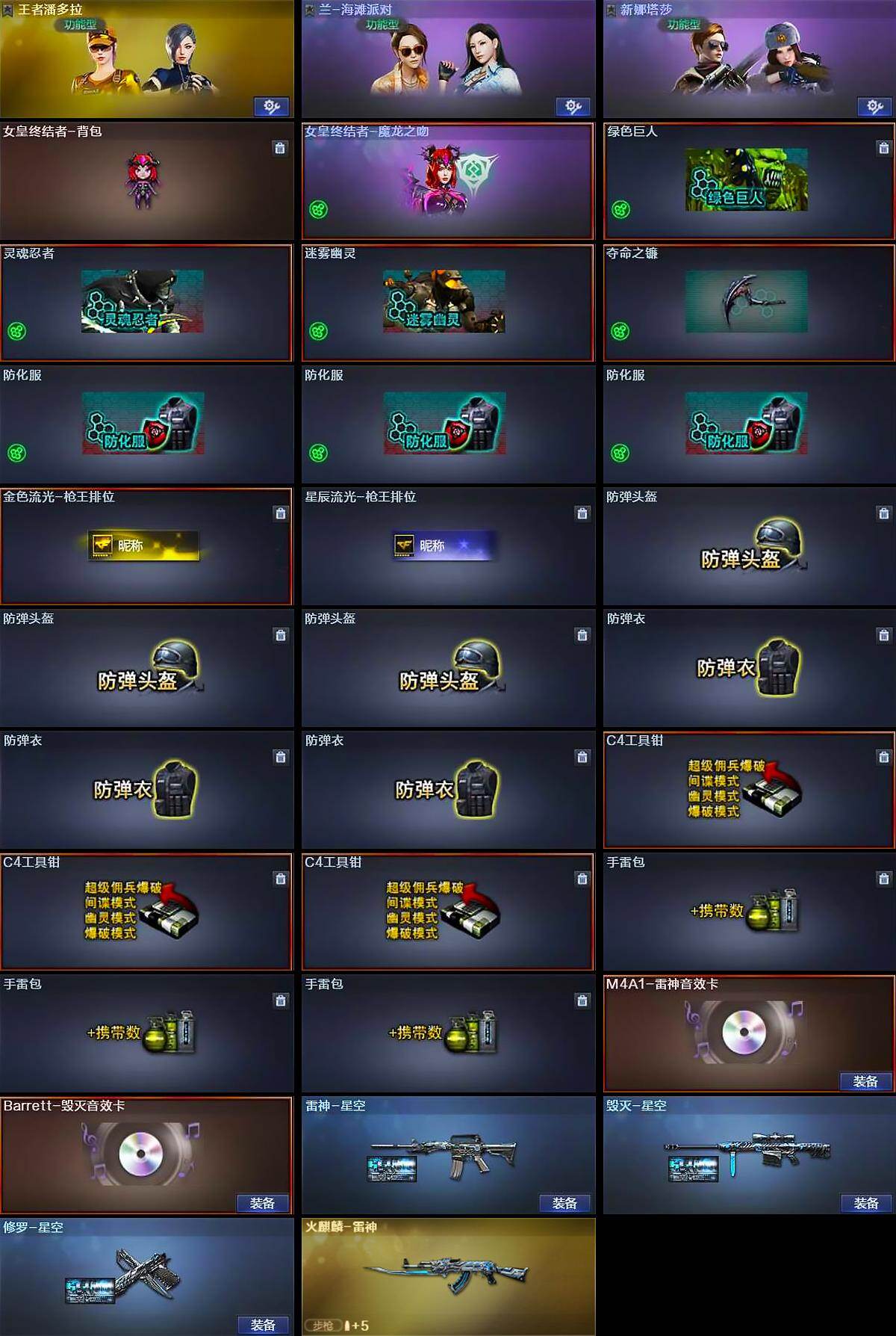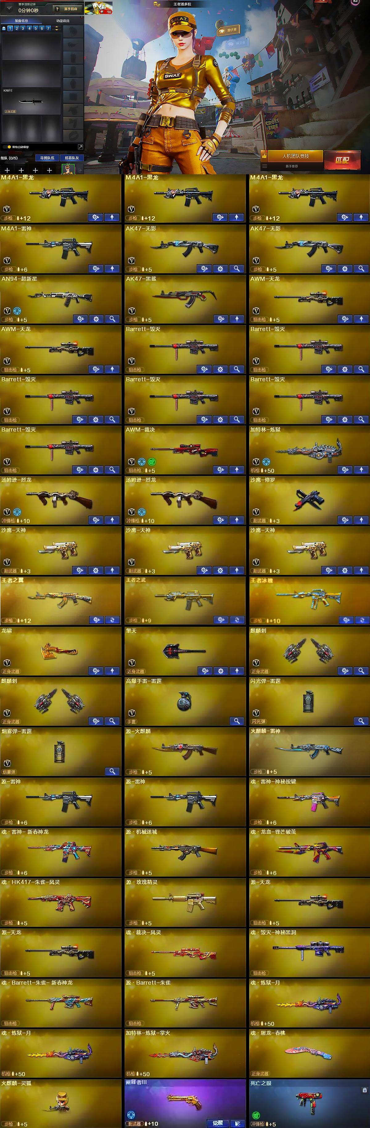 [15522015]山西一区-33v-3王者-0炫金 【热门武器】:死亡之眼,汤姆逊-烈龙2,加特林-炼狱,沙鹰-修罗 【王者炫金武器】:王者之翼,王者之武,王者之魄 【音效卡】:m4a1-雷神音效卡,barrett-毁灭音效卡 【皮肤】:雷神-星空,火麒麟-雷神,毁灭-星空,修罗-星空 【角色】:王者潘多拉,狐影,兰-海滩派对,新娜塔莎 【人偶武器】:火麒麟-灵狐 【暴走生化】:死亡之眼 【挑战大师】:阐释者iii 【英雄级武器】:m4a1-黑龙3,m4a1-雷神,ak47-无影2,an94-超新星,ak47-黑鲨,awm-天龙2,barrett-毁灭6,awm-裁决,加特林-炼狱,汤姆逊-烈龙2,沙鹰-修罗,沙鹰-天神3,龙啸,擎天,麒麟刺2,高爆手蕾-雷霆,闪光丹-雷霆,盐雾蛋-雷霆 【道具】:女皇终结者-背包,女皇终结者-魔龙之吻,绿色巨人,灵魂忍者,迷雾幽灵,夺命之镰,防化服3,金色流光-呛王排位,星辰流光-呛王排位,防弹头盔3,防弹衣3,c4工具钳3,手蕾包3 【特殊呛械】:2烈龙,1炼狱