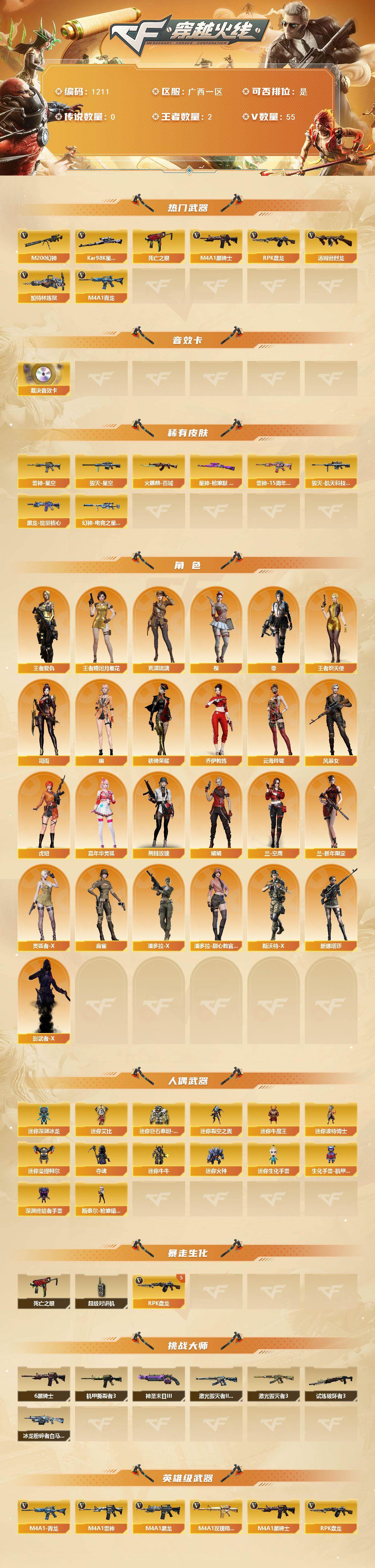 [15523862]广西一区-55v-2王者-0炫金 【热门武器】:m4a1-青龙,m200-幻神,死亡之眼,kar98k-星神,m4a1-黑骑士6,汤姆逊-烈龙,rpk-盘龙5,加特林-炼狱 【音效卡】:awm-裁决音效卡 【皮肤】:幻神-电竞之星 皮肤,星神-呛娘默 皮肤,雷神-星空,雷神-15周年嘉年华 皮肤,火麒麟-百城,毁灭-星空,毁灭-航天科技皮肤,黑龙-能量核心 【角色】:零,樱,荒漠琉璃,司雨,王者-瞳-闭月羞花,王者复仇,王者炽天使,乔伊教练,云海玲珑,风暴女,虎妞,嘉年华灵狐,荆棘玫瑰,娟娟,兰-空鹰,兰-新年限定,灵狐者-x,麻雀,潘多拉-x,潘多拉-甜心教官,斯沃特-x,铁骑荣耀,新娜塔莎,影武者-x,幽 【人偶武器】:斯泰尔-呛娘暗刃,迷你深渊冰龙,迷你裂空之翼3,迷你牛魔王,迷你波特博士,迷你曼提柯尔,夺魂,迷你牛牛,迷你火种,迷你生化手蕾,生化手蕾-机甲核心,深渊终结者手蕾4,迷你艾比,迷你巨石泰坦-魔花研究所 【暴走生化】:死亡之眼,超级对讲机 【挑战大师】:冰龙粉碎者-白马银呛,激光毁灭者iii-白马银呛,激光毁灭者iii,机甲撕裂者iii,试炼破坏者iii,神圣爆裂者-末日iii 【英雄级武器】:ak47-火麒麟,m4a1-黑龙2,m4a1-雷神3,m4a1-黑骑士6,ak47-黑鲨,m4a1-龙血,m4a1-青龙,无影-神兵利器,m4a1-玫瑰精灵,烈火-动感闪耀,超新星-悦享-觉醒版,q-03-王者蔷薇-觉醒版,barrett-毁灭,awm-裁决,m200-幻神,kar98k-星神,rpk-盘龙5,加特林-炼狱,汤姆逊-烈龙,烈龙-云海游龙,沙鹰-天神2,天神-动感闪耀,屠龙,屠龙-动感闪耀,擎天-云海游龙,高爆手蕾-幻灵3,手蕾-动感闪耀,手蕾-云海游龙,闪光丹-幻灵3,盐雾蛋-幻灵3,m4a1-赤狱骑士 【道具】:云海游龙炫彩背包,次元之矛-黄金背包,超级背包,黄金超能特工背包,女皇终结者-魔龙之吻,救世主-黑桃战神,绿色巨人,灵魂忍者2,变异宝贝,妖姬,迷雾幽灵2,夺命之镰,防化服2,金色流光-呛王排位2,星辰流光-呛王排位,流光-再燃火线,呛王排位28赛季金色流光,语音特效-机器人,动感闪耀表情,云海游龙表情,防弹头盔5,防弹衣5,c4工具钳5,手蕾包5 【特殊呛械】:6黑骑士,1烈龙,5盘龙