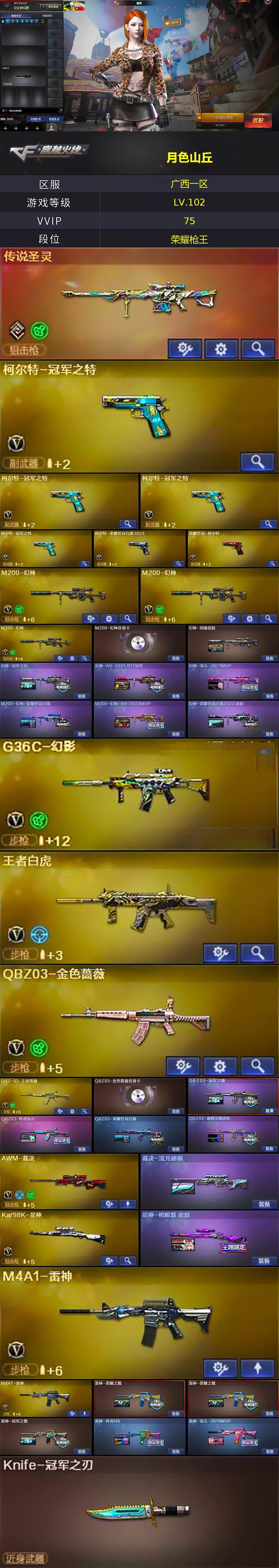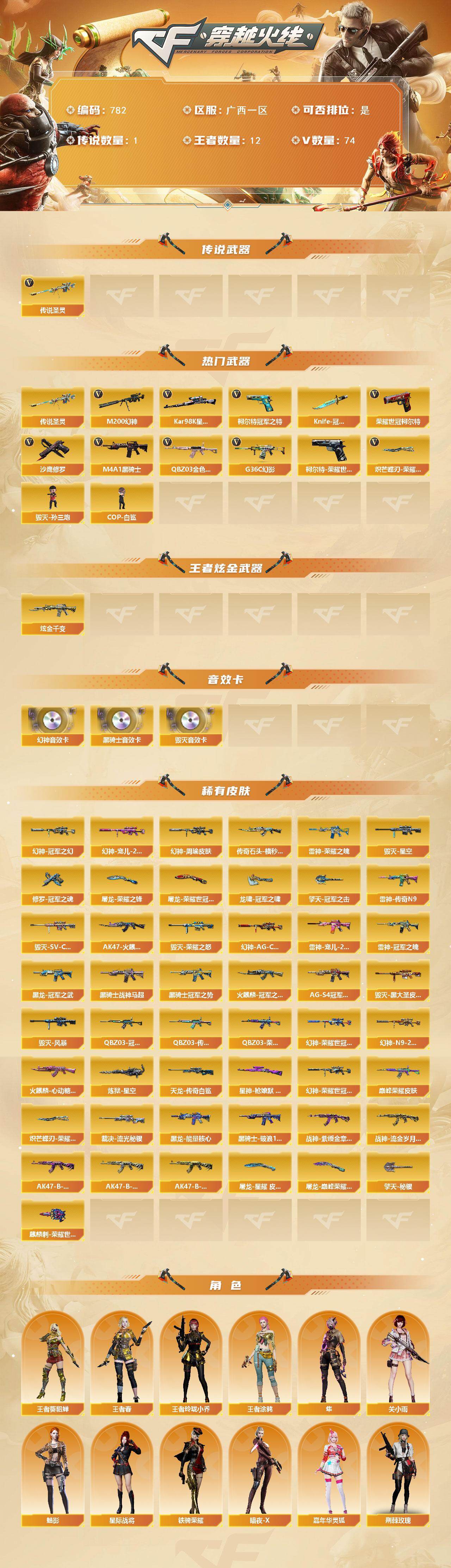 [15527333]广西一区-74v-12王者-1炫金 【传说武器】:传说圣灵 【热门武器】:传说圣灵,g36c-幻影,q03-金色蔷薇,m200-幻神3,柯尔特-荣耀世冠白鲨2023,柯尔特-冠军之特4,荣耀世冠-柯尔特,kar98k-星神,m4a1-黑骑士3,毁灭-孙三炮,cop-白鲨,沙鹰-修罗3,knife-冠军之刃,炽芒蝶刃-荣耀世冠白鲨2023 皮肤 【王者炫金武器】:炫金千变 【音效卡】:m200-幻神音效卡,m4a1-黑骑士音效卡,barrett-毁灭音效卡 【皮肤】:幻神-周瑜皮肤,幻神-冠军之幻,幻神-ag-cfpls17冠军,幻神-宠儿-2021mvp,m200-幻神-荣耀世冠白鲨,m200-幻神-n9-2022mvp,幻神-荣耀世冠白鲨2023 皮肤,q03-冠军之薇,q03-传奇宠儿,q03-荣耀世冠白鲨,q03-巅峰荣耀皮肤,裁决-流光秘银,星神-呛娘默 皮肤,雷神-荣耀之魄2,雷神-冠军之魄,雷神-传奇n9,雷神-宠儿-2019mvp,火麒麟-冠军之心,ak47-火麒麟-传奇even,传奇石头-横秒之巅,火麒麟-心动糖果,毁灭-荣耀之怒,毁灭-星空,毁灭-sv-cfpls16冠军,毁灭-黑大圣皮肤,毁灭-风暴,黑龙-能量核心,黑龙-冠军之武,黑骑士-冠军之势,黑骑士-战神马超,黑骑士-ag-s4冠军典藏2,黑骑士-破浪10年皮肤,战神-紫绶金章皮肤,战神-流金岁月皮肤3,ak47-b-常胜将军-曹操2,ak47-b-常胜将军-刘备3,ak47-b-常胜将军-孙权3,awm-天龙-传奇白鲨,炼狱-星空,修罗-冠军之魂,屠龙-荣耀之锋,屠龙-荣耀世冠ag,屠龙-星耀 皮肤2,屠龙-巅峰荣耀 皮肤,龙啸-冠军之啸2,擎天-秘银,擎天-冠军之击,麒麟刺-荣耀世冠白鲨2,炽芒蝶刃-荣耀世冠白鲨2023 皮肤 【角色】:魅影,关小雨,隼,星际战将,王者-葵-貂蝉,王者春,王者涂鸦,王者玲珑-小乔,暗夜-x,嘉年华灵狐,荆棘玫瑰,娟娟,潘多拉-x,斯沃特-x,铁骑荣耀,影武者-x 【人偶武器】:cop-白鲨,毁灭-孙三炮,芭蕾特-零-水下丽影,斯泰尔-呛娘暗刃,awm-灵狐-15周年嘉年华,迷你牛魔王,迷你波特博士,夺魂,深渊终结者手蕾,闪光丹-貂蝉,高爆手蕾-大乔,迷你超能女侍 【暴走生化】:超级对讲机 【挑战大师】:神