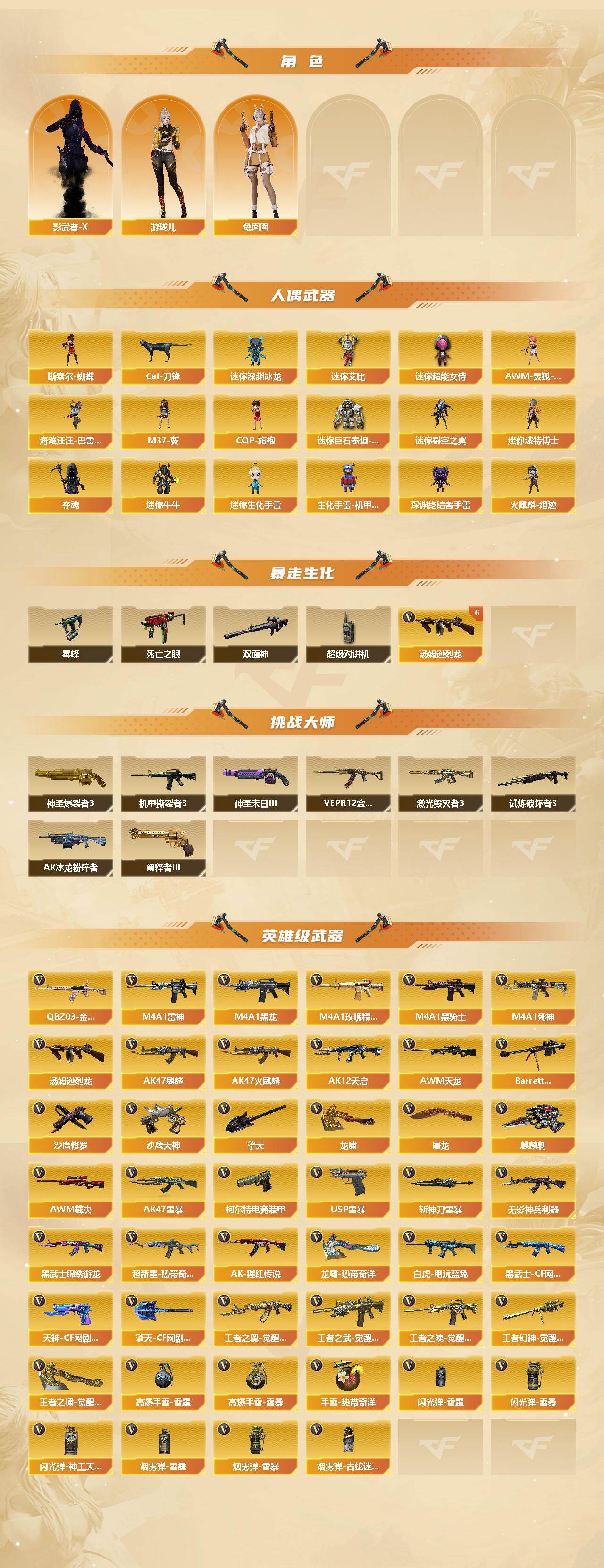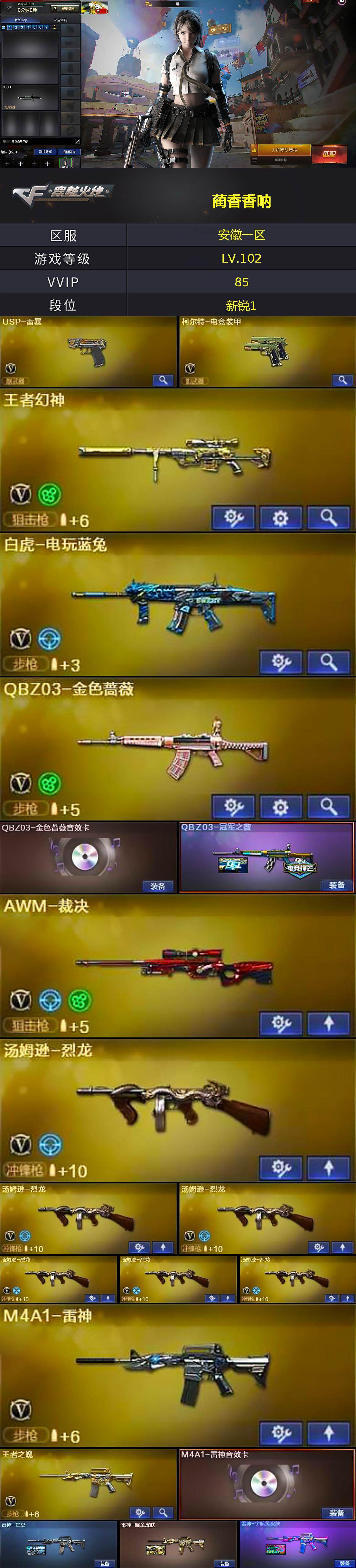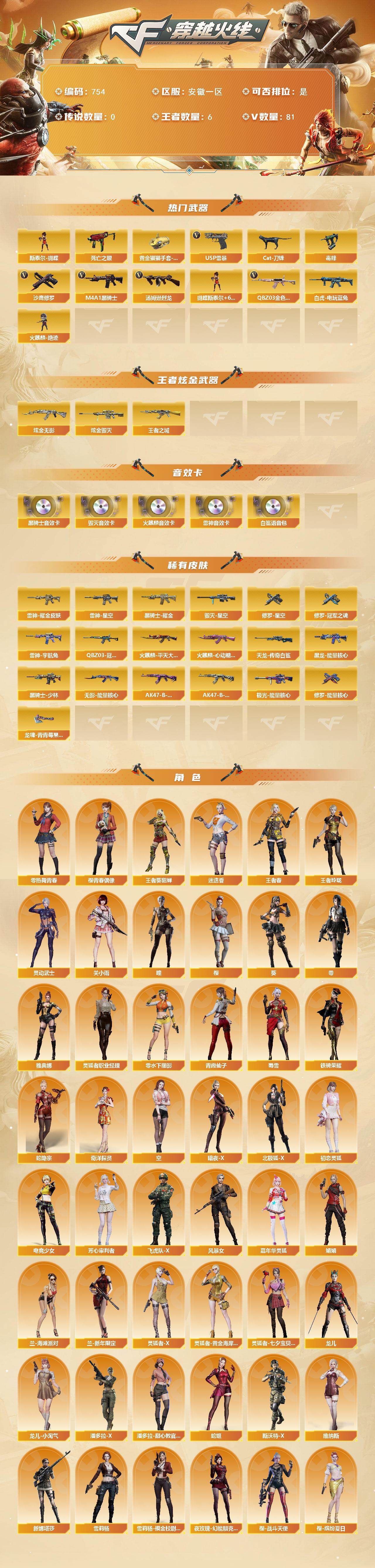 安徽一区-81v-6王者-3炫金 【热门武器】:q03-金色蔷薇,死亡之眼,白虎-电玩蓝兔,cat-刀锋,毒蜂,m4a1-黑骑士,汤姆逊-烈龙6,斯泰尔-蝴蝶,火麒麟-绝迹,usp-雷暴,沙鹰-修罗4,黄金猫猫手套-白鲨 【王者炫金武器】:王者之城,炫金无影,炫金毁灭2 【音效卡】:ak47-火麒麟音效卡,m4a1-雷神音效卡,m4a1-黑骑士音效卡,barrett-毁灭音效卡,白鲨语音包 【皮肤】:q03-冠军之薇,雷神-星空,雷神-耀金皮肤,雷神-宇航兔皮肤,火麒麟-平天大圣,火麒麟-心动糖果,毁灭-星空,黑龙-能量核心,黑骑士耀金皮肤,黑骑士-少林,无影-能量核心,ak47-b-常胜将军-曹操,ak47-b-常胜将军-刘备,awm-天龙-传奇白鲨,极光-能量核心,修罗-能量核心,修罗-星空,修罗-冠军之魂,龙啸-青青莓果 皮肤 【角色】:零,葵,樱,瞳,迷迭香,关小雨,王者-葵-貂蝉,王者春,王者玲珑,蛇隐宗,奇洋探员,空,暗夜-x,北极狐-x,初恋灵狐,电竞少女,芳心审判者,飞虎队-x,风暴女,嘉年华灵狐,娟娟,兰-海滩派对,兰-新年限定,零-热舞青春,灵动武士,零-水下丽影,灵狐者-x,灵狐者-黄金海岸,灵狐者-七夕宝贝,灵狐者-职业经理,龙儿,龙儿-小淘气,潘多拉-x,潘多拉-甜心教官,青霞仙子,蛇姬,斯沃特-x,蜀雪,铁骑荣耀,兔囡囡,维纳斯,新娜塔莎,雪莉杨,雪莉杨-摸金校尉,夜玫瑰-幻能朋克,樱-青春偶像,樱-战斗天使,樱-缤纷夏日,影武者-x,游珑儿,雅典娜 【人偶武器】:火麒麟-绝迹,斯泰尔-蝴蝶,awm-灵狐-15周年嘉年华,海滩汪汪-芭蕾特,m37-葵,cop-旗袍,cat-刀锋,迷你深渊冰龙,迷你裂空之翼,迷你波特博士,夺魂,迷你牛牛2,迷你生化手蕾,生化手蕾-机甲核心2,深渊终结者手蕾2,迷你艾比,迷你超能女侍,迷你巨石泰坦-魔花研究所 【暴走生化】:毒蜂,双面神,死亡之眼,超级对讲机 【挑战大师】:神圣爆裂者iii,ak47-冰龙粉碎者,vepr-12-金魔,激光毁灭者iii2,机甲撕裂者iii,试炼破坏者iii,神圣爆裂者-末日iii,阐释者iii 【英雄级武器】:ak47-火麒麟2,ak47-麒麟,m4a1-黑龙,m4a1-雷神,m4a1-黑骑士,m4a1-死神4,ak12-天启,ak47-雷暴,无影-神兵利器,黑武士-锦绣游龙,超新星-热带奇洋,m4a1-玫瑰精灵,q03-金色蔷薇,王者之翼-觉醒版,王者之武-觉醒版,王者之魄-觉醒版,ak-47-猩红传说,白虎-电玩蓝兔,黑武士-cf网剧冠军,awm-天龙,barrett-毁灭3,awm-裁决,王者幻神-觉醒版,汤姆逊-烈龙6,沙鹰-修罗4,沙鹰-天神2,usp-雷暴,柯尔特-电竞装甲,天神-cf网剧冠军,屠龙2,龙啸,擎天,麒麟刺5,龙啸-热带奇洋,斩神刀-雷暴,擎天-cf网剧冠军,王者之啸-觉醒版,高爆手蕾-雷霆,高爆手蕾-雷暴5,手蕾-热带奇洋,闪光丹-雷霆,闪光丹-雷暴5,闪光丹-神工天巧,盐雾蛋-雷霆,盐雾蛋-雷暴5,盐雾蛋-古蛇迷踪 【道具】:ag战队炫彩背包,全能呛王背包,冰冰企鹅背包-猛男专用,奇洋探员-海龟背包,女皇终结者-背包,炫彩背包-诺拉,炫彩背包,热带奇洋炫彩背包,老虎背包,背包-洛丽塔,虎牙炫彩背包,超级背包,迷你冰龙背包,哔哩哔哩名片,圣拳猎手-炽雪,女皇终结者-魔龙之吻,妩媚妖姬,黄金生化钩,绿色巨人,灵魂忍者2,变异宝贝,迷雾幽灵3,生化弹匣,夺命之镰2,防化服4,金色流光-呛王排位2,星辰流光-呛王排位,呛王排位28赛季金色流光,电玩兔兔表情,热带奇洋表情,炽雪表情,防弹头盔5,防弹衣4,c4工具钳4,手蕾包4 【特殊呛械】:蝴蝶斯泰尔6烈龙,1黑骑士,6烈龙,1蝴蝶斯泰尔