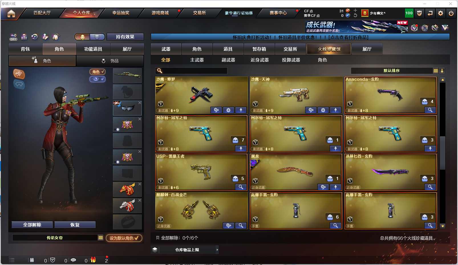 017-w5052-上海一区-(可二次-VIP3)-66V-【传说女帝4防-传说圣谕】-【幻神-幻神巅峰荣耀-幻神冠军之幻-幻神黄忠】-【星神长生圣莲-裁决-裁决音效卡】-【冠军之特x3-USP雷暴王者-冠军之刃x2-黄金猫猫手套】-【王者沙漠玫瑰4防-雨棠-潘多拉N】-【5烈龙-蛇影双娇】-SCARLight玄豹-FAMASG2天戎-HK417朱雀-QBZ金色蔷薇(冠军之薇)-火麒麟(冠军之心-枪娘凯萨林)-雷神(冠军之魄-赵云)-黑骑士(冠军之势)-修罗(冠军之魄-百战金芒)-屠龙(巅峰荣耀)-黑龙-超新星-QBZ天罚-机械迷城穹宇-炼狱-沙鹰修罗-沙鹰天神-丛林匕首玄豹-玄豹手雷套-雷暴手雷套