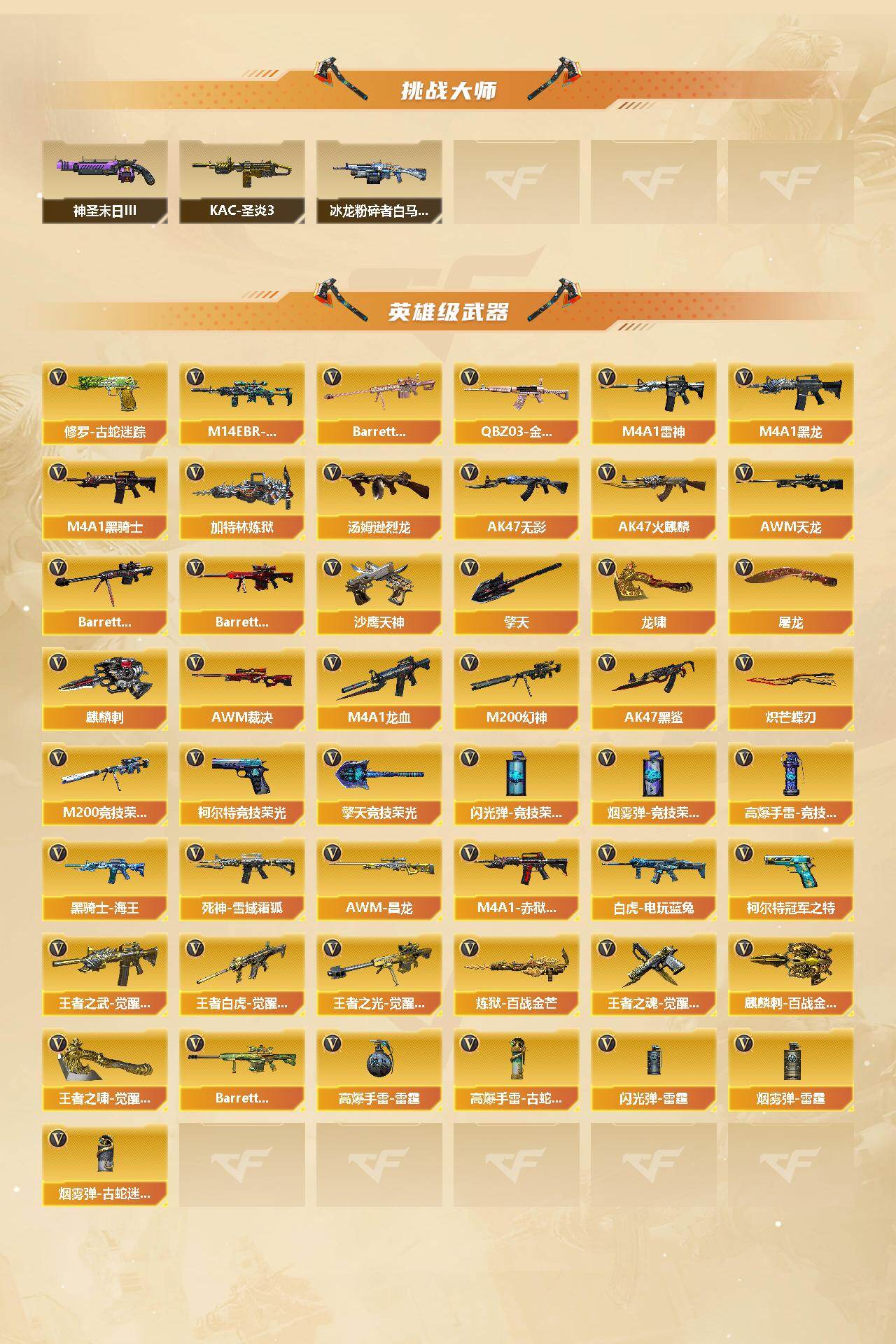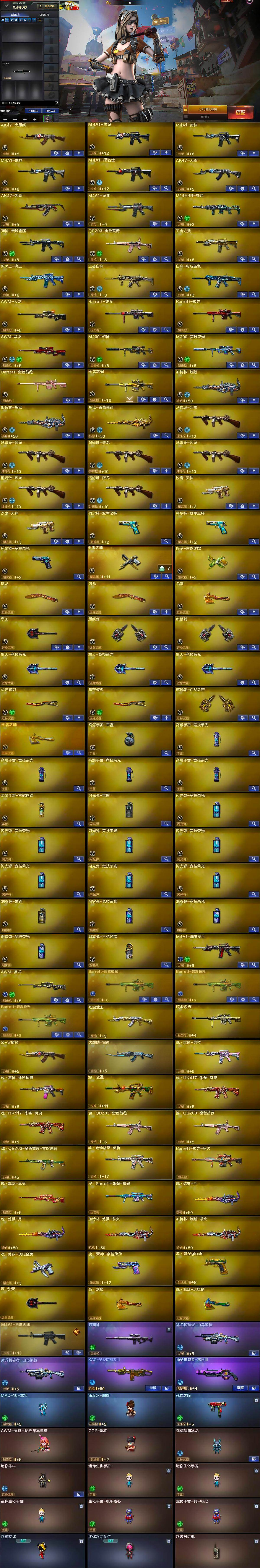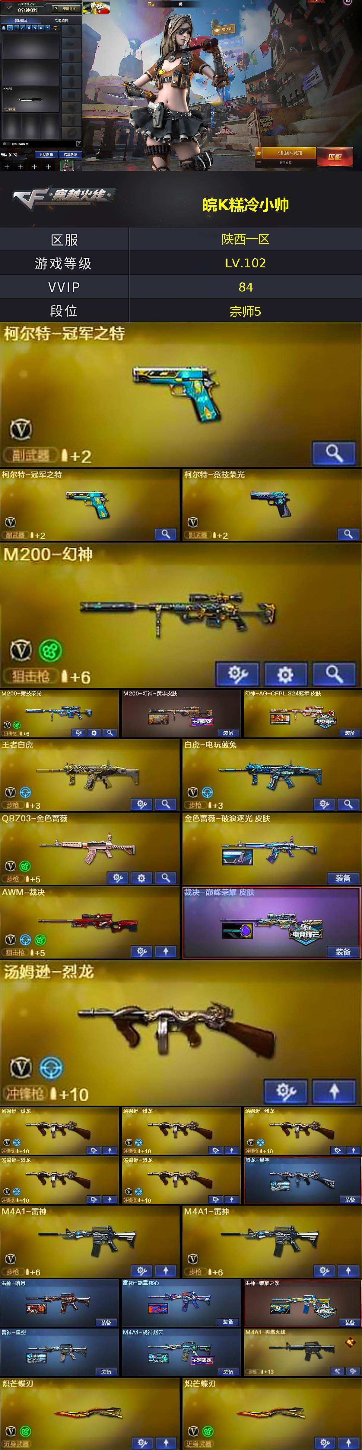陕西一区-81v-5王者-2炫金 【热门武器】:q03-金色蔷薇,m14ebr-玄武,m200-幻神,修罗-古蛇迷踪,m200-竞技荣光,死亡之眼,白虎-电玩蓝兔,柯尔特-冠军之特2,m4a1-黑骑士,汤姆逊-烈龙6,加特林-炼狱2,斯泰尔-蝴蝶,mac-10-龙宝,炽芒蝶刃2,黄金猫猫手套-白鲨 【王者炫金武器】:炫金武士,炫金毁灭 【音效卡】:ak47-火麒麟音效卡,m4a1-