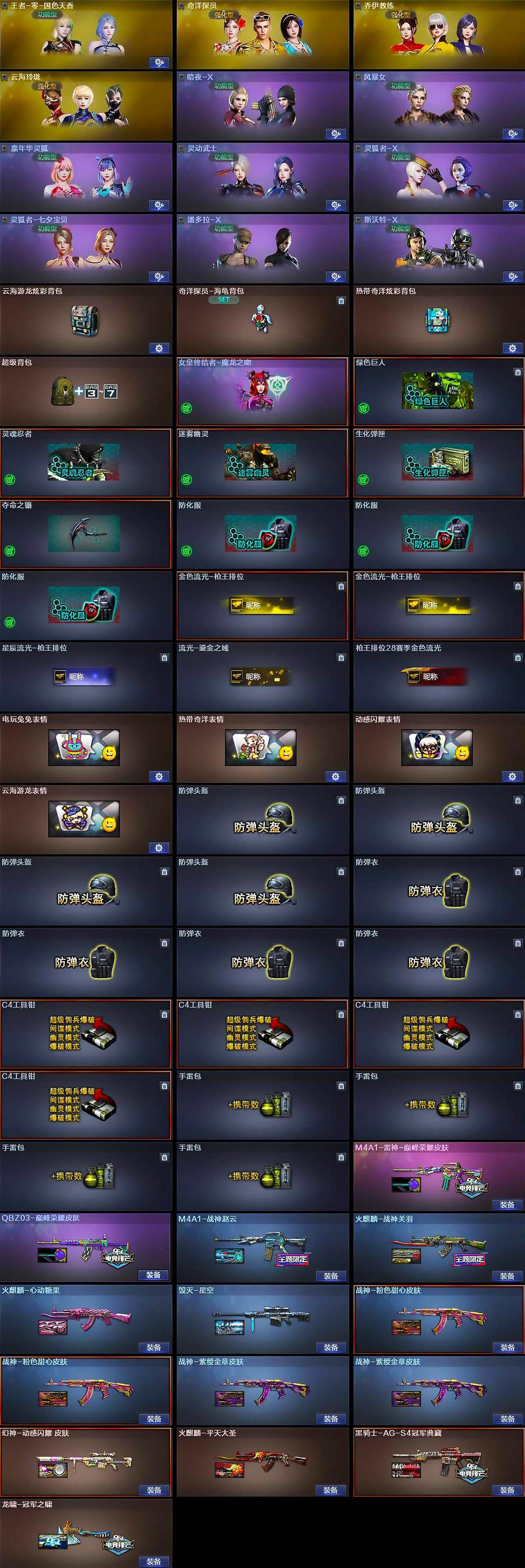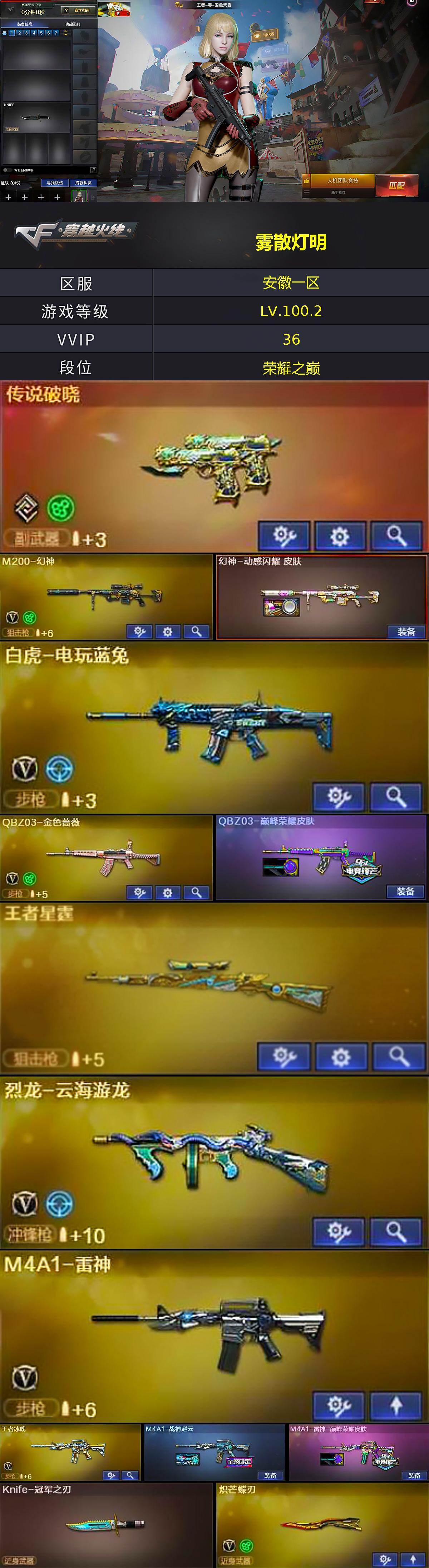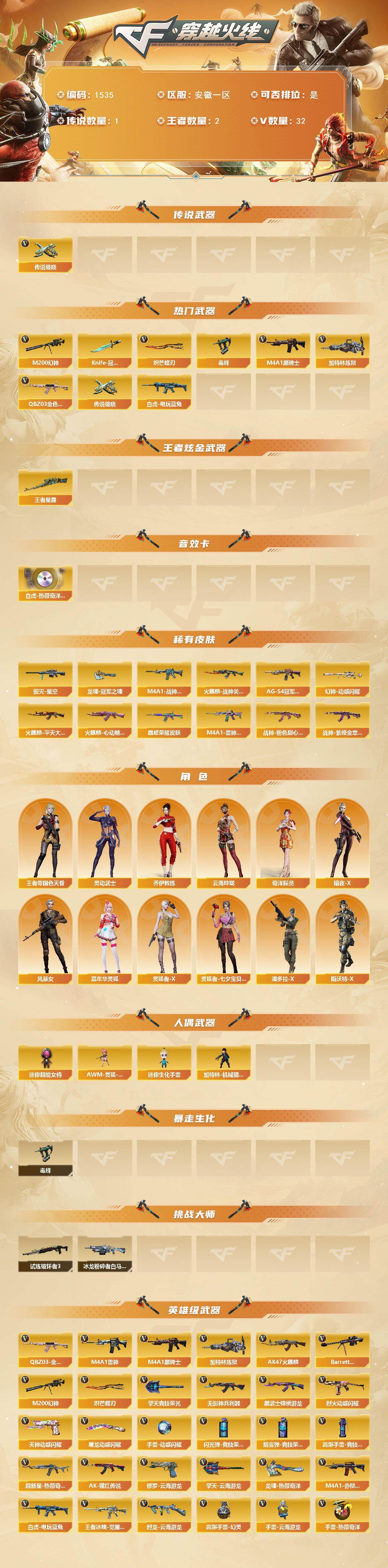 [15561526]安徽一区-32v-2王者-0炫金 【传说武器】:传说破晓 【热门武器】:传说破晓,q03-金色蔷薇,m200-幻神,白虎-电玩蓝兔,毒蜂,m4a1-黑骑士,加特林-炼狱,knife-冠军之刃,炽芒蝶刃 【王者炫金武器】:王者星霆 【音效卡】:scar light-白虎-热带奇洋音效卡 【皮肤】:幻神-动感闪耀 皮肤,q03-巅峰荣耀皮肤,m4a1-战神赵云,m4a1-雷神-巅峰荣耀皮肤,火麒麟-战神关羽,火麒麟-平天大圣,火麒麟-心动糖果,毁灭-星空,黑骑士-ag-s4冠军典藏,战神-粉色甜心皮肤2,战神-紫绶金章皮肤2,龙啸-冠军之啸 【角色】:王者-零-国色天香,奇洋探员,乔伊教练,云海玲珑,暗夜-x,风暴女,嘉年华灵狐,灵动武士,灵狐者-x,灵狐者-七夕宝贝,潘多拉-x,斯沃特-x 【人偶武器】:加特林-机械猎手,awm-灵狐-15周年嘉年华,迷你生化手蕾,迷你超能女侍 【暴走生化】:毒蜂 【挑战大师】:冰龙粉碎者-白马银呛,试炼破坏者iii 【英雄级武器】:ak47-火麒麟,m4a1-雷神,m4a1-黑骑士,无影-神兵利器,黑武士-锦绣游龙,超新星-热带奇洋,q03-金色蔷薇,烈火-动感闪耀,ak-47-猩红传说3,王者冰魄-觉醒版,白虎-电玩蓝兔,barrett-毁灭,m200-幻神,加特林-炼狱,烈龙-云海游龙,天神-动感闪耀,修罗-云海游龙,擎天-竞技荣光,炽芒蝶刃,屠龙-动感闪耀,擎天-云海游龙,龙啸-热带奇洋,高爆手蕾-幻灵,高爆手蕾-竞技荣光,手蕾-动感闪耀,手蕾-云海游龙,手蕾-热带奇洋,闪光丹-幻灵2,闪光丹-竞技荣光,盐雾蛋-幻灵,盐雾蛋-竞技荣光,m4a1-赤狱骑士 【道具】:云海游龙炫彩背包,奇洋探员-海龟背包,热带奇洋炫彩背包,超级背包,女皇终结者-魔龙之吻,绿色巨人,灵魂忍者,迷雾幽灵,生化弹匣,夺命之镰,防化服3,金色流光-呛王排位2,星辰流光-呛王排位,流光-鎏金之域,呛王排位28赛季金色流光,电玩兔兔表情,热带奇洋表情,动感闪耀表情,云海游龙表情,防弹头盔4,防弹衣4,c4工具钳4,手蕾包4 【特殊呛械】:1黑骑士,1炼狱