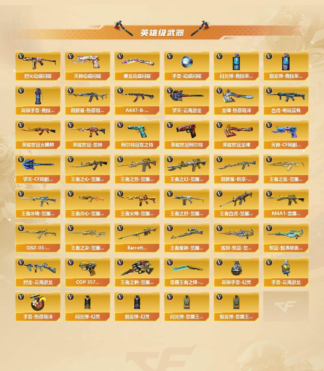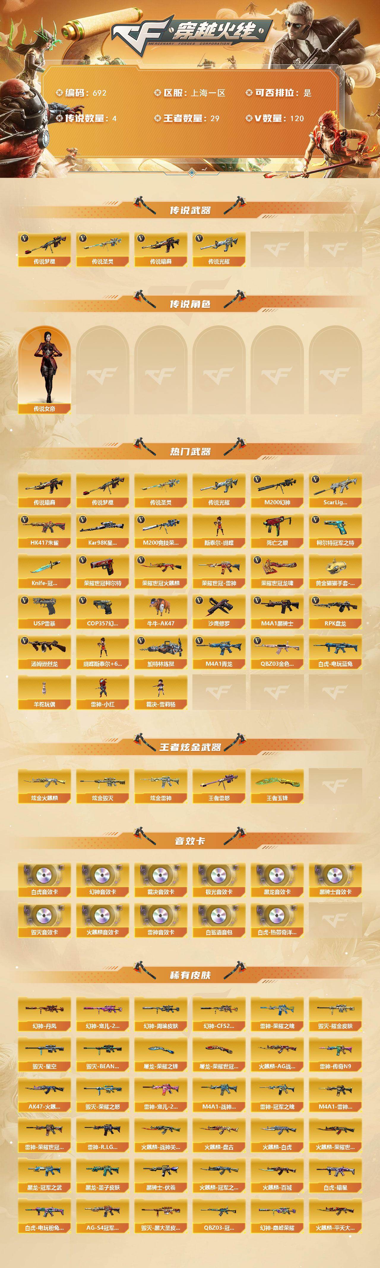 [15529321]上海一区-120v-29王者-3炫金 【传说武器】:传说光耀,传说暗裔,传说圣灵,传说梦魇 【传说角色】:传说女帝 【热门武器】:传说光耀,传说暗裔,传说梦魇,传说圣灵,q03-金色蔷薇,scar light-白虎,hk417-朱雀,m4a1-青龙,m200-幻神2,m200-竞技荣光,死亡之眼,荣耀世冠-火麒麟,荣耀世冠-雷神,白虎-电玩蓝兔,柯尔特-冠军之特3,荣耀世冠-柯尔特,kar98k-星神,牛牛-ak47,m4a1-黑骑士2,汤姆逊-烈龙6,rpk-盘龙6,加特林-炼狱2,斯泰尔-蝴蝶,羊驼玩偶3,雷神-小红,裁决-雪莉杨,usp-雷暴,cop 357-幻灵,沙鹰-修罗3,knife-冠军之刃2,荣耀世冠-龙啸,黄金猫猫手套-白鲨 【王者炫金武器】:王者雷怒,王者玉锋,炫金火麒麟,炫金雷神,炫金毁灭 【音效卡】:scar light-白虎-热带奇洋音效卡,m200-幻神音效卡,ak47-火麒麟音效卡,m4a1-雷神音效卡,m4a1-黑龙音效卡,m4a1-黑骑士音效卡,barrett-毁灭音效卡,barrett-极光音效卡,awm-裁决音效卡,scar light-白虎音效卡,白鲨语音包 【皮肤】:幻神-周瑜皮肤,幻神-丹凤,幻神-宠儿-2021mvp,幻神-巅峰荣耀,幻神-cfs2022,scar light-白虎-暗星,白虎-电玩粉兔皮肤,q03-冠军之薇,雷神-荣耀之魄,m4a1-雷神-cfs 2019,雷神-冠军之魄2,雷神-传奇n9,m4a1-战神赵云,雷神-宠儿-2019mvp,雷神-r.lgd-cfpls18冠军,雷神-烈虎皮肤,雷神-荣耀世冠ag,雷神-机甲刑天皮肤,火麒麟-ag战队皮肤,火麒麟-冠军之心,ak47-火麒麟-传奇even,火麒麟-战神关羽,火麒麟-平天大圣,火麒麟-盘古,火麒麟-白虎,火麒麟-荣耀世冠ag,火麒麟-百城,火麒麟-心动糖果,毁灭-荣耀之怒,毁灭耀金皮肤2,毁灭-星空,毁灭-bean-2020mvp,毁灭-黑大圣皮肤,黑龙-能量核心2,黑龙-墨子皮肤,黑龙-冠军之武,黑骑士-伏羲,黑骑士-ag-s4冠军典藏,无影-能量核心,战神-紫绶金章皮肤,ak47-b-常胜将军-刘备,ak47-b-常胜将军-孙权,awm-天龙-传奇70kg,awm-天龙-传奇白鲨,极光-能量核心,屠龙-荣耀