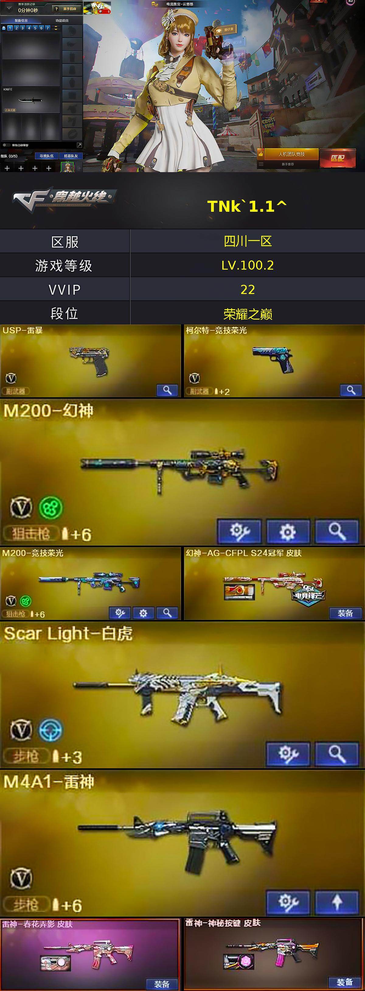 四川一区-22v-1王者-0炫金 【热门武器】:m14ebr-玄武,scar light-白虎,m200-幻神,m200-竞技荣光,m4a1-黑骑士,usp-雷暴 【皮肤】:幻神-ag-cfpl s24冠军 皮肤,雷神-春花弄影 皮肤,雷神-神秘按键 皮肤,火麒麟-心动糖果,黑骑士-冠军之势 【角色