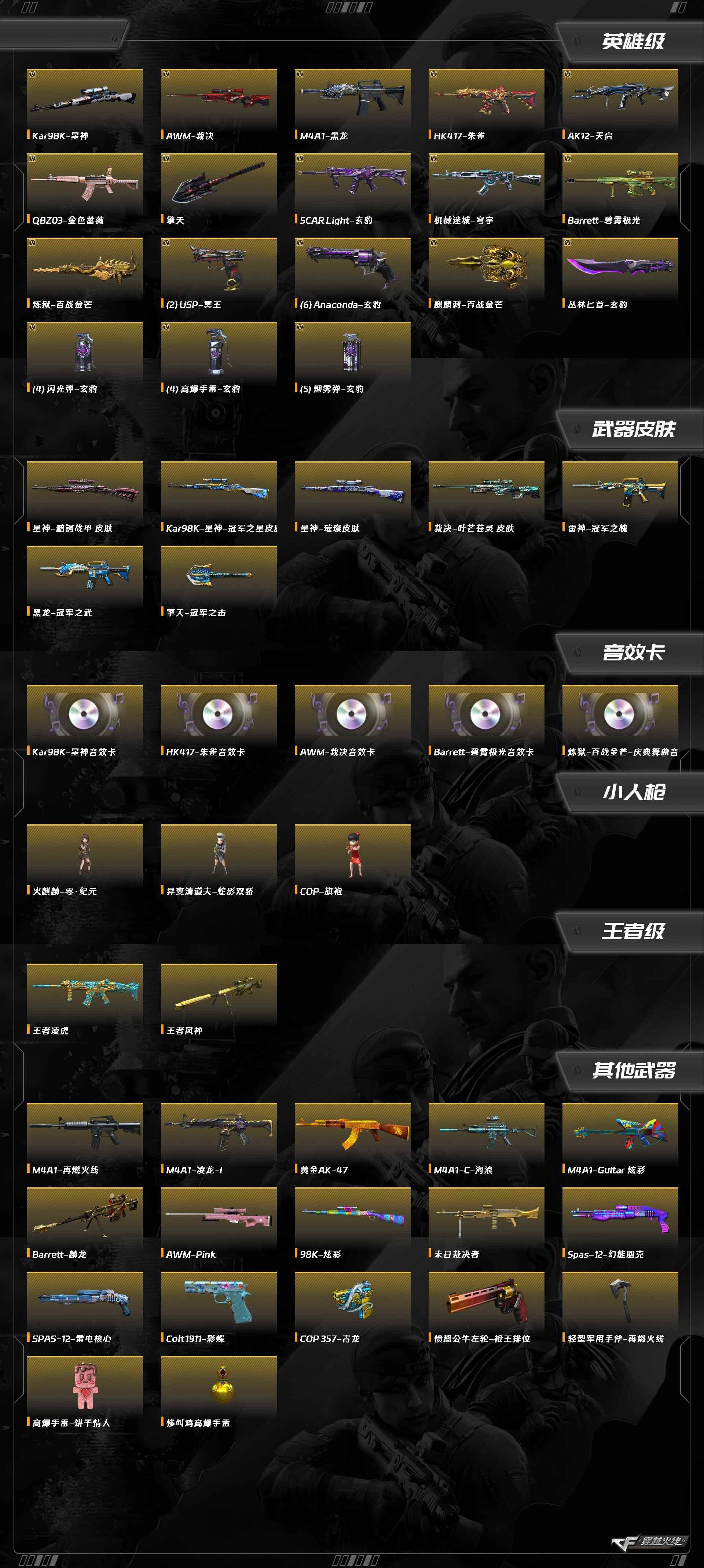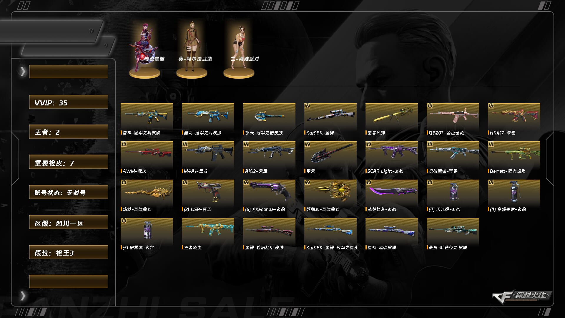 [15446445]xh9543/西部/四川一区/可排位/【呛王3】【lv.88 中将1】vip3/34v/【四防传说】/传说星骇/【未觉醒】王者风神/【星神三件套3皮】/星神/星神音效卡/星神黯钢战甲/星神冠军之星/星神璀璨/【裁决三件套】/裁决/裁决音效卡/裁决叶芒苍灵/玄豹套/朱雀/朱雀音效卡/q金色蔷薇/usp冥王/2/黑龙/炼狱百战金芒/擎天/丛林匕首玄豹/四套玄豹手蕾/【皮肤音效卡】/黑龙冠军之武/擎天冠军之击/炼狱百战金芒庆典舞曲音效卡/碧霄极光音效卡/【角色】/葵阿尔法武装/兰海滩派对/【玩偶武器】/异变清道夫蛇影双骄/火麒麟零纪元/cop旗袍///各种饰品/各种道具/细节看图/【此账号未被封过十年】