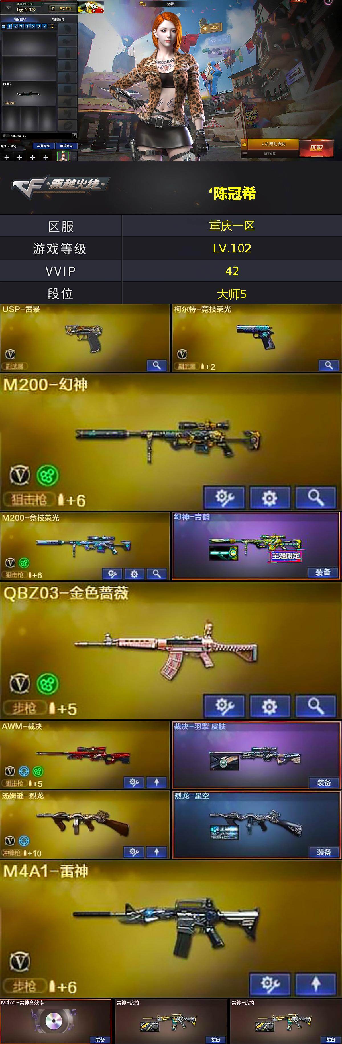 [15564427]重庆一区-42v-6王者-1炫金 【热门武器】:q03-金色蔷薇,hk417-朱雀,m200-幻神,m200-竞技荣光,金色小号,m4a1-黑骑士,汤姆逊-烈龙,加特林-炼狱,usp-雷暴,沙鹰-修罗 【王者炫金武器】:超新星-悦享,王者之武,王者之怒,王者之刺,王者之啸,炫金武士 【音效卡】:m4a1-雷神音效卡,m4a1-黑骑士音效卡,barrett-毁灭音效卡,barrett-极光音效卡2 【皮肤】:幻神-青鹤,裁决-羽掣 皮肤,烈龙-星空,雷神-虎将2,火麒麟-战神关羽,毁灭-星空,m4a1-千变-孔明皮肤,m4a1-黑龙-361,黑骑士-地狱火,无影-霓裳皮肤,战神-粉色甜心皮肤,awm-天龙-传奇70kg,极光-能量核心2,修罗-星空,屠龙-春桃 皮肤 【角色】:魅影,炫,电竞教官-云悠悠,王者-救世主,暗夜-x,风暴女,灵狐-花神,灵狐者-x,灵狐者-黄金海岸,龙儿-小淘气,玫瑰花神,潘多拉-x,潜龙队-x,青霞仙子,铁骑荣耀,维纳斯,雪莉杨,智影 【人偶武器】:天龙-曼陀罗,火麒麟-灵狐,迷你深渊冰龙,夺魂,迷你生化手蕾,闪光丹-小乔 【暴走生化】:超级对讲机 【挑战大师】:ak47-冰龙粉碎者,激光毁灭者iii,神圣爆裂者-末日iii 【英雄级武器】:ak47-火麒麟,m4a1-黑龙,m4a1-雷神,m4a1-黑骑士,ak47-无影,m4a1-武圣2,m4a1-龙血,hk417-朱雀,q03-金色蔷薇,王者之心-觉醒版,ak47-b-战神,awm-天龙,barrett-毁灭,barrett-极光,awm-裁决,m200-幻神,m200-竞技荣光,加特林-炼狱,汤姆逊-烈龙,沙鹰-修罗,沙鹰-天神,usp-雷暴,柯尔特-竞技荣光,屠龙3,龙啸,擎天,麒麟刺,擎天-竞技荣光,高爆手蕾-夜魔,高爆手蕾-竞技荣光,高爆手蕾-云龙,闪光丹-夜魔,闪光丹-竞技荣光,盐雾蛋-夜魔,盐雾蛋-竞技荣光 【道具】:edg炫彩背包,xrock炫彩背包,炫彩背包,超级背包,救世主-黑桃战神,绿色巨人,灵魂忍者2,变异宝贝,妖姬,迷雾幽灵,生化弹匣,夺命之镰,防化服2,流光-再燃火线,呛王排位29赛季金色流光,防弹头盔7,防弹衣7,c4工具钳3,手蕾包2 【特殊呛械】:1黑骑士,1烈龙,1炼狱