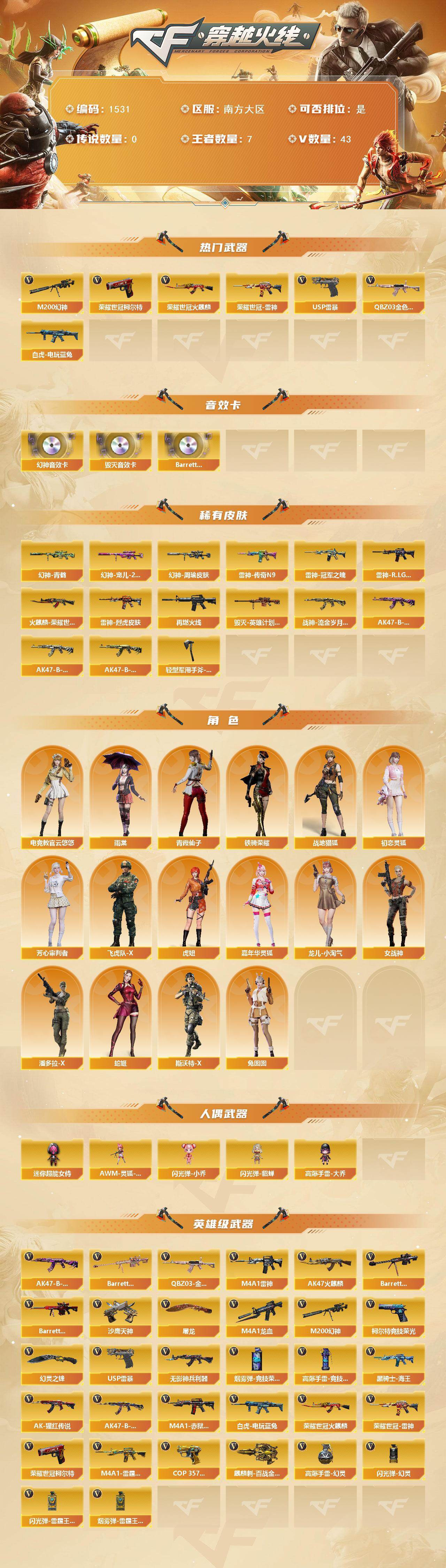 南方大区-43v-7王者-0炫金 【热门武器】:q03-金色蔷薇,m200-幻神,荣耀世冠-火麒麟,荣耀世冠-雷神,白虎-电玩蓝兔,荣耀世冠-柯尔特,usp-雷暴 【音效卡】:m200-幻神音效卡,barrett-毁灭音效卡,barrett-碧霄极光音效卡2 【皮肤】:幻神-周瑜皮肤,幻神-青