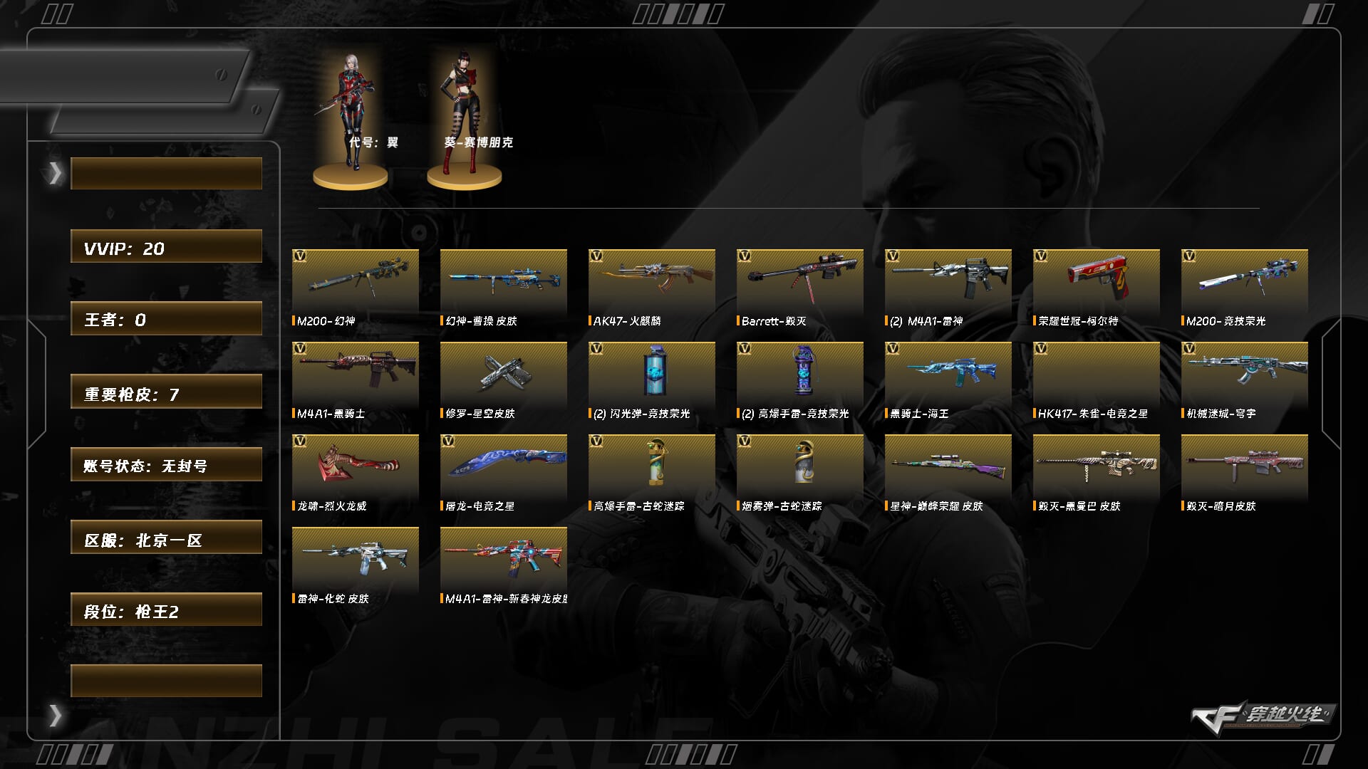 9571/北部/北京一区/可排位/【呛王2】【lv.61 中校2】vip3/18v/幻神/幻神曹操/m200竞技荣光/朱雀电竞之星/荣耀世冠柯尔特/毁灭/雷神/黑骑士/火麒麟/机械迷城穹宇/【无星神】/星神璀璨/【皮肤】/毁灭黑曼巴/雷神化蛇/【角色】/葵赛博朋克/代号翼/【玩偶武器】/朱雀蛇隐