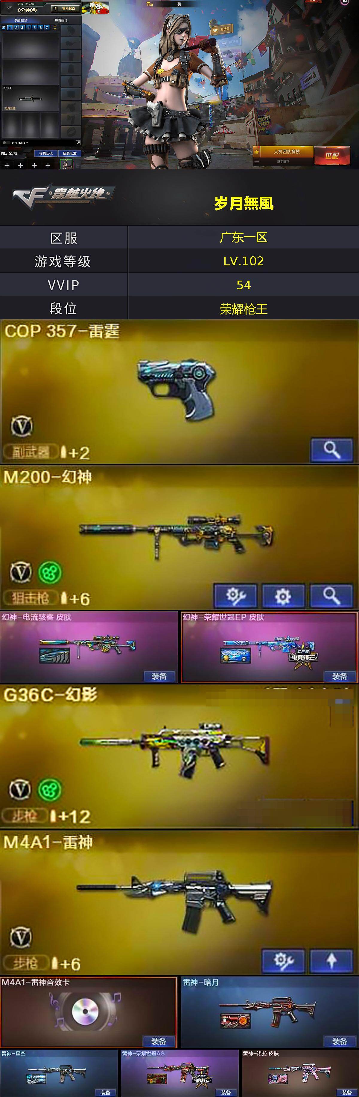 广东一区-52v-2王者-1炫金 【热门武器】:g36c-幻影,m200-幻神,m4a1-黑骑士,沙鹰-修罗2 【王者炫金武器】:王者之翼,炫金毁灭 【音效卡】:m4a1-雷神音效卡,m4a1-黑骑士音效卡,死神-雪域霜狐-怀旧音效卡 【皮肤】:幻神-电流骇客 皮肤,幻神-荣耀世冠ep 皮肤,雷神-暗月,雷神-星空,雷神-荣耀世冠ag,雷神-诺拉 皮肤,毁灭-星空,毁灭-英雄计划 皮肤,黑骑