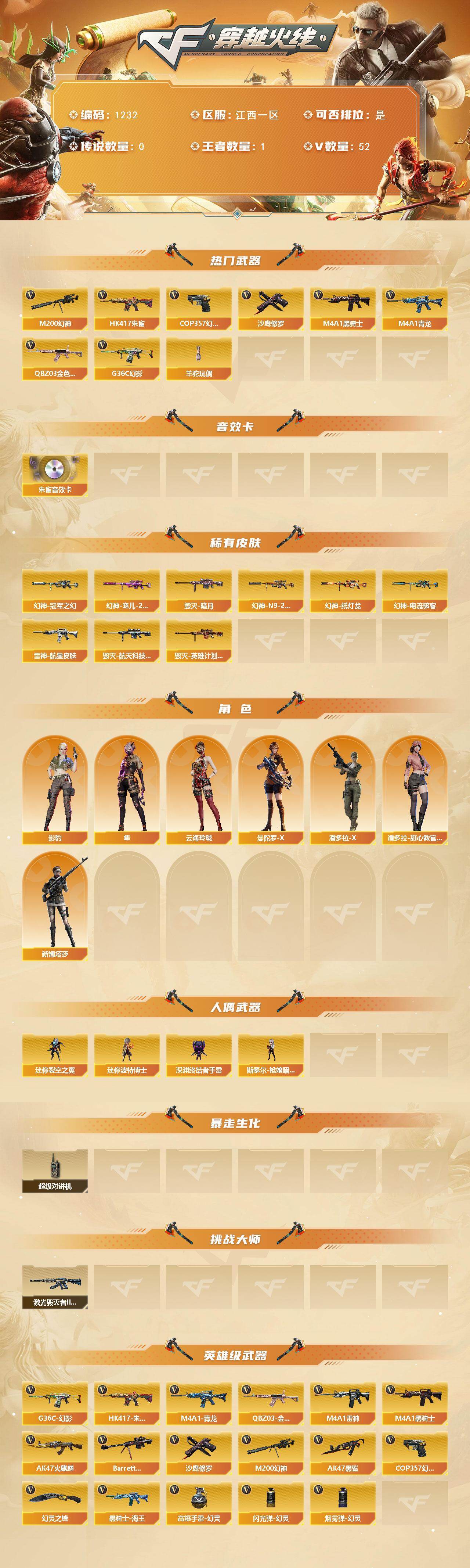 [15601299]江西一区-52v-1王者-0炫金 【热门武器】:g36c-幻影,q03-金色蔷薇,hk417-朱雀,m4a1-青龙,m200-幻神,m4a1-黑骑士,羊驼玩偶,cop 357-幻灵,沙鹰-修罗7 【音效卡】:hk417-朱雀音效卡 【皮肤】:幻神-冠军之幻,幻神-宠儿-2021mvp,m200-幻神-n9-2022mvp,幻神-纸灯龙皮肤,幻神-电流骇客 皮肤,雷神-航星皮肤,毁灭-暗月,毁灭-航天科技皮肤,毁灭-英雄计划 皮肤 【角色】:影豹,隼,云海玲珑,曼陀罗-x,潘多拉-x,潘多拉-甜心教官,新娜塔莎 【人偶武器】:斯泰尔-呛娘暗刃,迷你裂空之翼,迷你波特博士,深渊终结者手蕾 【暴走生化】:超级对讲机 【挑战大师】:激光毁灭者iii-白马银呛 【英雄级武器】:ak47-火麒麟,m4a1-雷神,m4a1-黑骑士,ak47-黑鲨,m4a1-青龙,hk417-朱雀,g36c-幻影,q03-金色蔷薇,黑骑士-海王,barrett-毁灭,m200-幻神,沙鹰-修罗7,cop 357-幻灵,幻灵之锋2,高爆手蕾-幻灵7,闪光丹-幻灵7,盐雾蛋-幻灵7 【道具】:cfs限定背包,冰冰企鹅背包,白狐背包,绿色巨人,灵魂忍者,迷雾幽灵,夺命之镰2,防化服2,金色流光-呛王排位,星辰流光-呛王排位,语音特效-生化,防弹头盔2,防弹衣2,c4工具钳2,手蕾包2 【特殊呛械】:1黑骑士