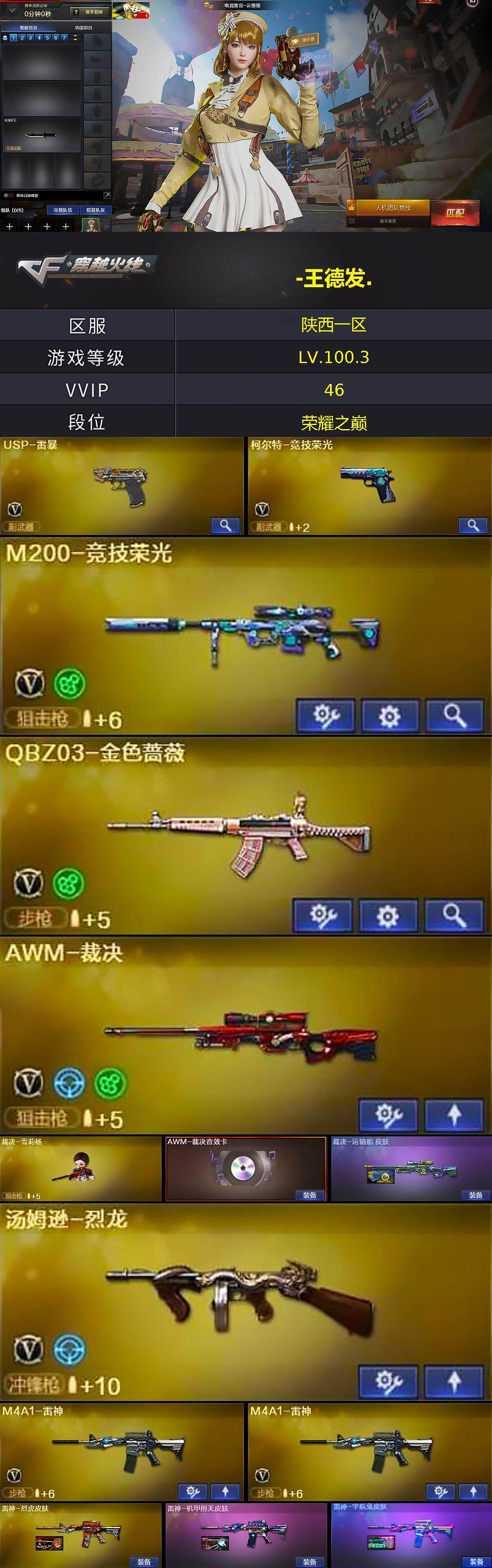 陕西一区-46v-0王者-0炫金 【热门武器】:q03-金色蔷薇,m200-竞技荣光,死亡之眼2,汤姆逊-烈龙,加特林-炼狱3,裁决-雪莉杨,usp-雷暴 【音效卡】:ak47-火麒麟音效卡,barrett-毁灭音效卡,awm-裁决音效卡 【皮肤】:裁决-运输船 皮肤,雷神-烈虎皮肤,雷神-机甲刑天皮肤,雷神-宇航兔皮肤,火麒麟-ag战队皮肤,火麒麟-雷神2,火麒麟-平天大圣,火麒麟
