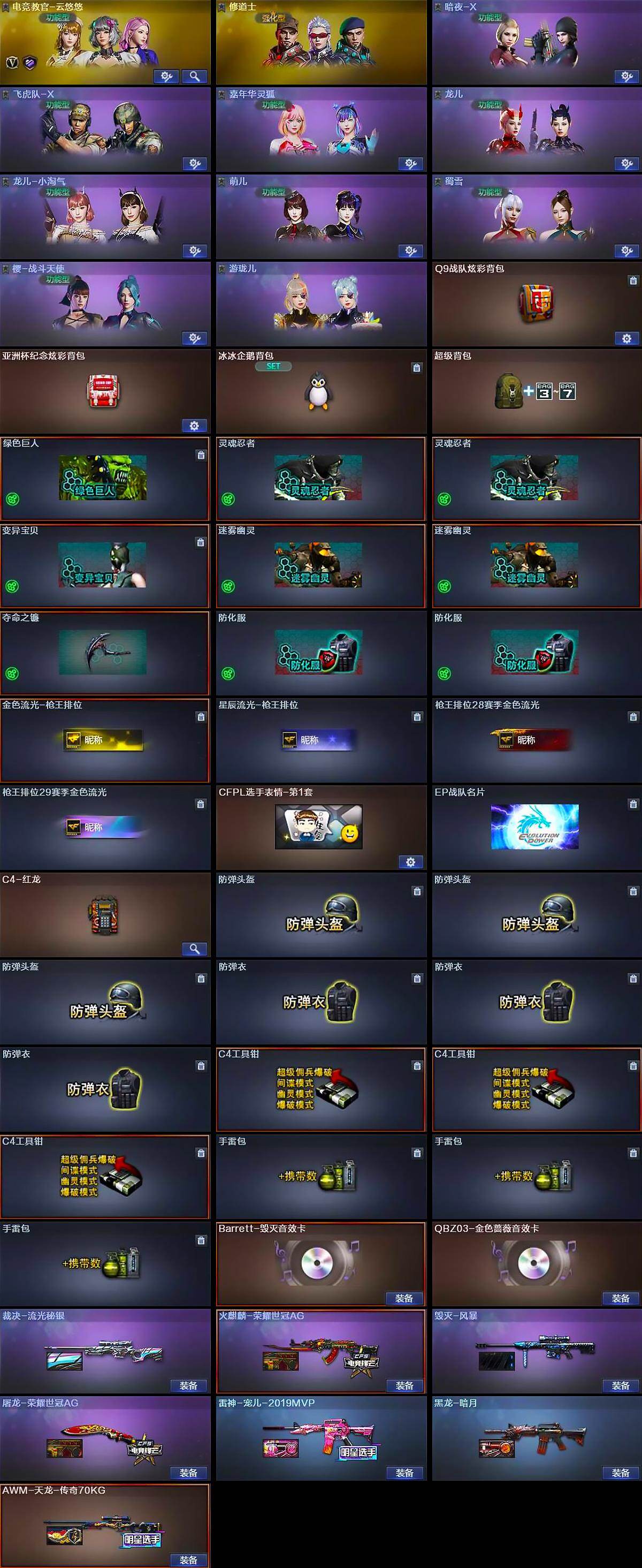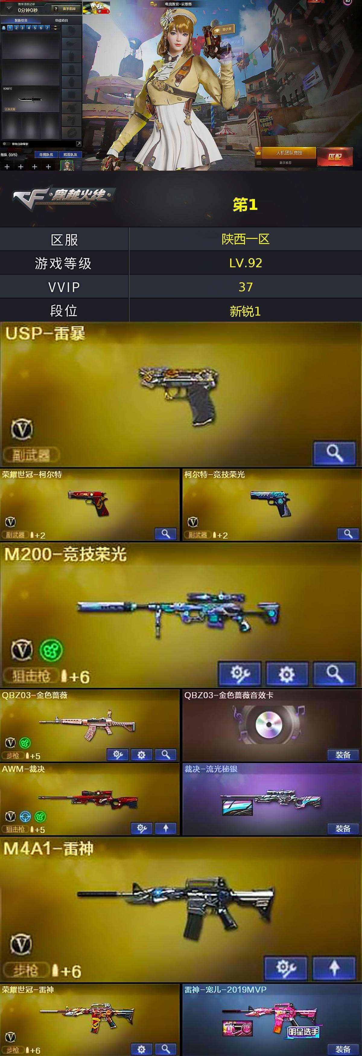 陕西一区-37v-0王者-0炫金 【热门武器】:q03-金色蔷薇,m200-竞技荣光,荣耀世冠-雷神,荣耀世冠-柯尔特,牛牛-ak47,usp-雷暴 【音效卡】:barrett-毁灭音效卡 【皮肤】:裁决-流光秘银,雷神-宠儿-2019mvp,火麒麟-荣耀世冠ag,毁灭-风暴,黑龙-暗月,awm-天龙-传奇70kg,屠龙-荣耀世冠ag 【角色】:电竞教官-云悠悠,修道士,暗夜-x,飞虎队-x,嘉年华灵狐,龙儿,龙儿-小淘气,萌儿,蜀雪,樱-战斗天使,游珑儿 【人偶武器】:awm-灵狐-15周年嘉年华2,牛牛-ak47,迷你牛牛,灵狐娃娃手蕾 【挑战大师】:冰龙粉碎者-白马银呛 【英雄级武器】:ak47-火麒麟,m4a1-黑龙,m4a1-雷神,ak47-黑武士,m4a1-幻灵,无影-神兵利器,黑武士-锦绣游龙,q03-金色蔷薇,m4a1-猎神,荣耀世冠-雷神,barrett-毁灭,awm-裁决,m200-竞技荣光,usp-雷暴,荣耀世冠-柯尔特,柯尔特-竞技荣光,屠龙2,龙啸,马来剑-夜魔,麒麟刺,擎天-竞技荣光,高爆手蕾-雷暴,高爆手蕾-夜魔,高爆手蕾-竞技荣光4,闪光丹-雷霆,闪光丹-雷暴,闪光丹-夜魔,闪光丹-竞技荣光,盐雾蛋-夜魔,盐雾蛋-竞技荣光3 【道具】:q9战队炫彩背包,亚洲杯纪念炫彩背包,冰冰企鹅背包,超级背包,绿色巨人,灵魂忍者2,变异宝贝,迷雾幽灵2,夺命之镰,防化服2,金色流光-呛王排位,星辰流光-呛王排位,呛王排位28赛季金色流光,呛王排位29赛季金色流光,cfpl选手表情-第1套,ep战队名片,c4-红龙,防弹头盔3,防弹衣3,c4工具钳3,手蕾包3 【特殊呛械】: