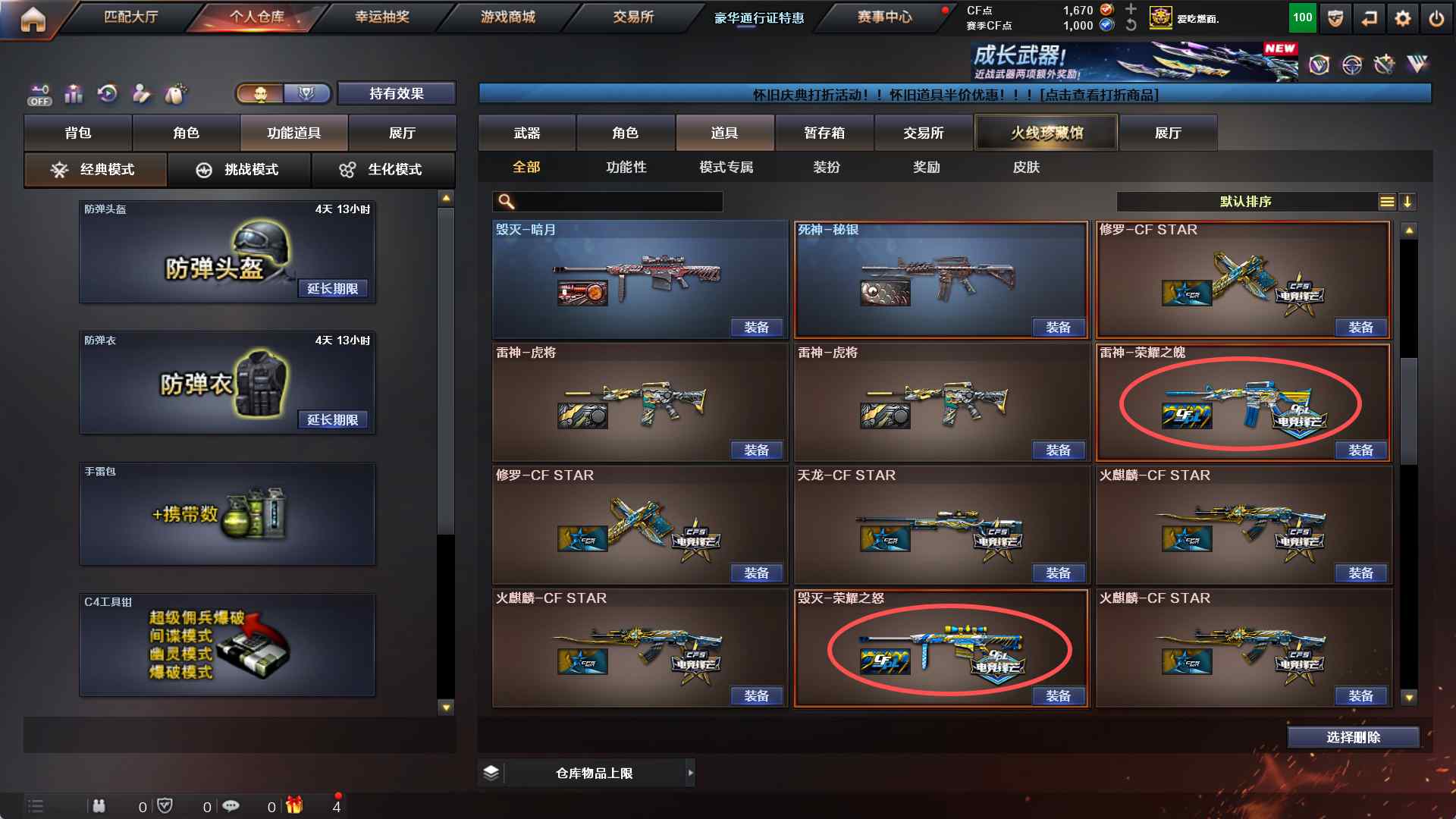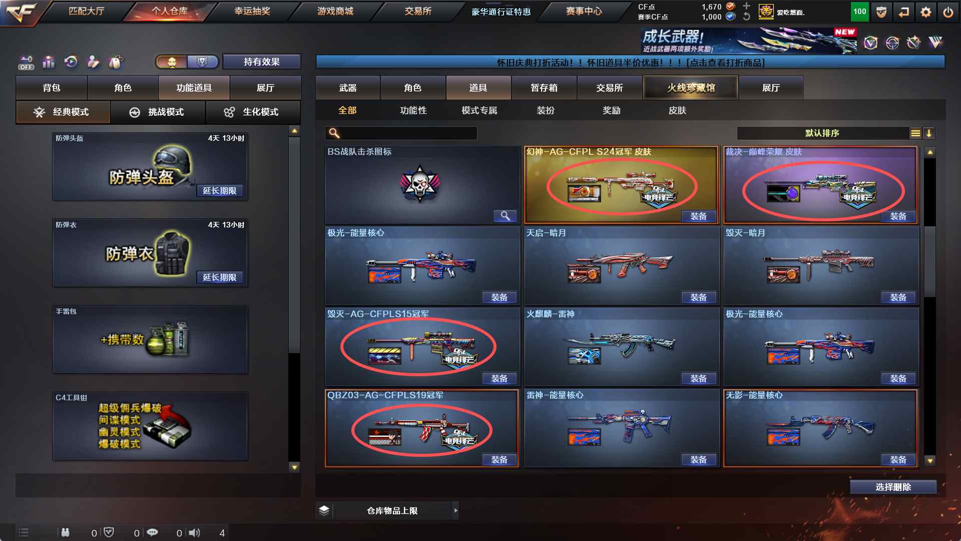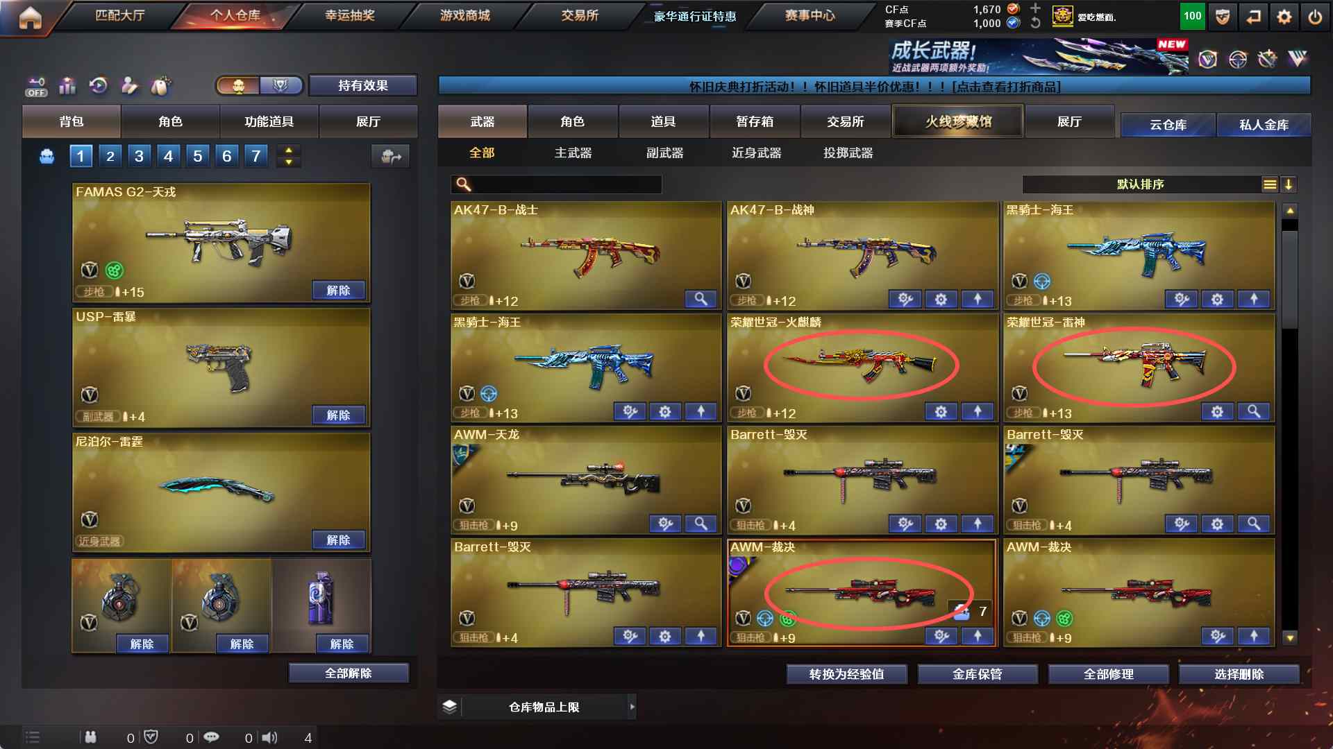 2070 重庆一区113v【幻兽投掷物1套】【雷暴投掷物4套】【雷霆投掷物2套】【夜魔投掷物1套】【堕天神投掷物2套】【幻神-AG CFS24冠军】【98k星神】【usp雷暴】【FAMS G2 天戎】【qbz金色蔷薇-AGcfpls19冠军】【白虎】【裁决-巅峰荣耀皮肤】【qbz-3天罚-天罚音效卡】【荣耀世冠火麒麟】【荣耀世冠雷神】【盘龙x6】【烈龙x7-斯太尔蝴蝶】【四防灵狐者职业经理】音效卡【雷神音效卡-毁灭音效卡-火麒麟音效卡-黑骑士音效卡】【】雷神容易之魄】【毁灭荣耀之怒】【及哦麒麟冠军之心】