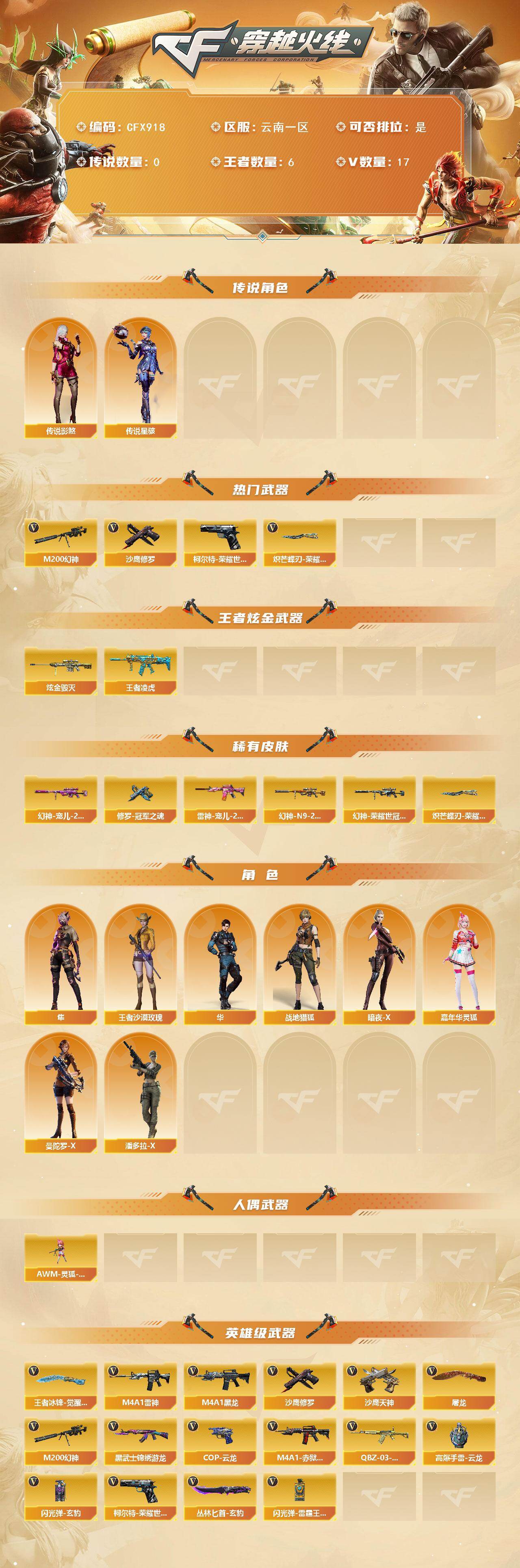 【cfx918】14v/100级/元帅/6王者/1炫金/3英雄/传说星骇/传说影煞/m200-幻神/柯尔特-荣耀世冠白鲨2023/沙鹰-修罗/炽芒蝶刃-荣耀世冠白鲨2023 皮肤/王者凌虎/炫金毁灭/幻神-宠儿-2021mvp/m200-幻神-n9-2022mvp/幻神-荣耀世冠白鲨2023 皮肤/雷神-宠儿-2019mvp/修罗-冠军之魂/隼/华/战地猎狐/王者沙漠玫瑰/暗夜-x/嘉年华灵狐/曼陀罗-x/潘多拉-x/awm-灵狐-15周年嘉年华/m4a1-黑龙/m4a1-雷神/黑武士-锦绣游龙/q-03-王者蔷薇-觉醒版/沙鹰-天神/cop 357-云龙/屠龙/丛林匕首-玄豹/王者冰锋-觉醒版/高爆手蕾-云龙/闪光丹-玄豹/闪光丹-雷霆王者-觉醒版/m4a1-赤狱骑士/女皇终结者-魔龙之吻/绿色巨人/灵魂忍者/迷雾幽灵/夺命之镰/防化服/金色流光-呛王排位/星辰流光-呛王排位/巅峰赛先锋-金色流光/呛王排位28赛季金色流光/呛王排位29赛季金色流光/c4-红龙/防弹头盔/防弹衣/c4工具钳/手蕾包