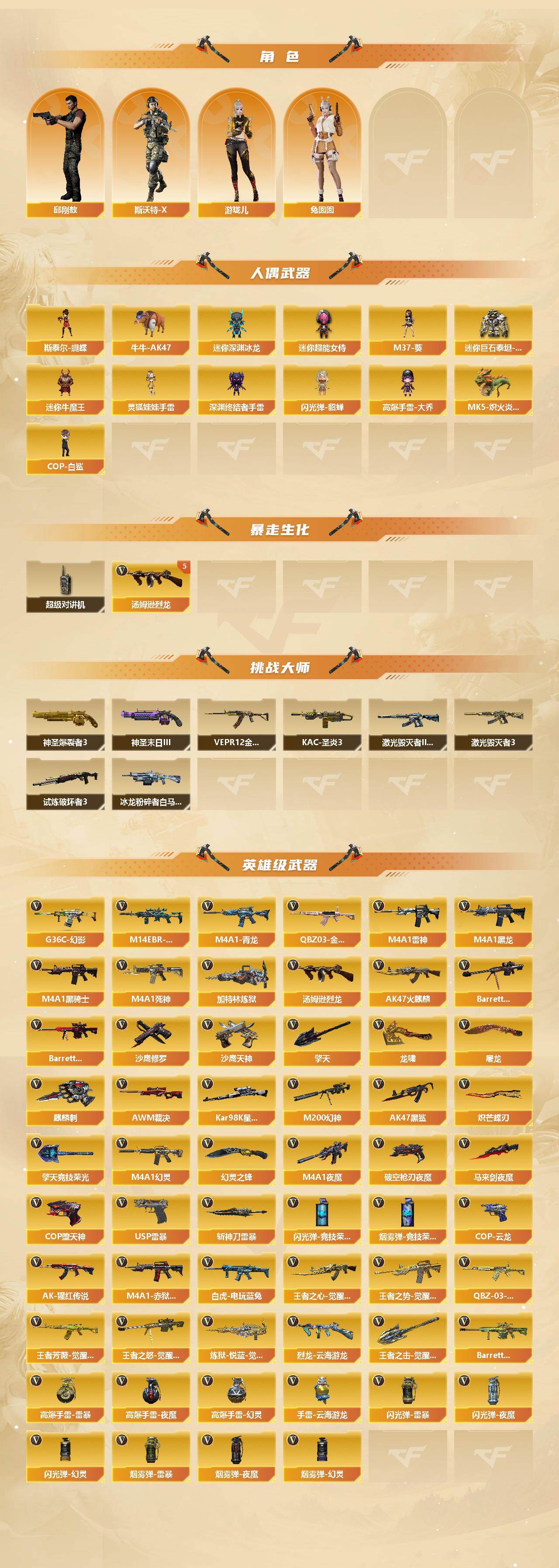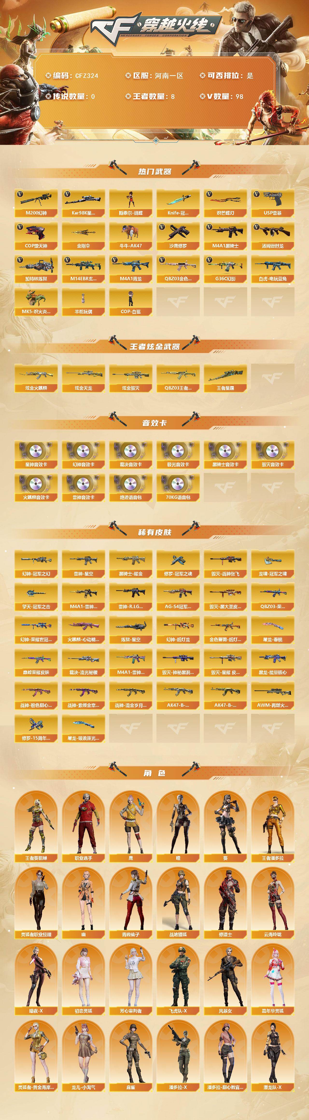 【cfz324】94v/101级/大元首/8王者/3炫金/4英雄/q三件套/幻神三件套/裁决三件套/g36c-幻影/q03-金色蔷薇/m14ebr-玄武/m4a1-青龙/m200-幻神/白虎-电玩蓝兔/kar98k-星神/牛牛-ak47/m4a1-黑骑士/汤姆逊-烈龙/加特林-炼狱/斯泰尔-蝴蝶/mk5-炽火炎龙/羊驼玩偶/cop-白鲨/usp-雷暴/cop-堕天神/沙鹰-修罗/knife-冠军之刃/炽芒蝶刃/金刚伞/王者星霆/炫金火麒麟/炫金毁灭/炫金天龙/q-03-王者蔷薇/m200-幻神音效卡/ak47-火麒麟音效卡/m4a1-雷神音效卡/m4a1-黑骑士音效卡/barrett-毁灭音效卡/barrett-极光音效卡/awm-裁决音效卡/70kg语音包/绝迹语音包/kar98k-星神音效卡/幻神-冠军之幻/m200-幻神-荣耀世冠白鲨/幻神-纸灯龙皮肤/q03-荣耀世冠白鲨/金色蔷薇-纸灯龙皮肤/q03-巅峰荣耀皮肤/裁决-流光秘银/雷神-星空/m4a1-雷神-cfs 2019/雷神-r.lgd-cfpls18冠军/m4a1-雷神-巅峰荣耀皮肤/火麒麟-心动糖果/毁灭-战神张飞/毁灭-黑大圣皮肤/毁灭-神秘黑洞皮肤/毁灭-星耀 皮肤/黑龙-能量核心/黑骑士耀金皮肤/黑骑士-ag-s4冠军典藏/战神-粉色甜心皮肤/战神-紫绶金章皮肤/战神-流金岁月皮肤/ak47-b-常胜将军-刘备/ak47-b-常胜将军-孙权/awm-再燃火线/炼狱-星空/修罗-冠军之魂/修罗-15周年嘉年华 皮肤/屠龙-春桃 皮肤/屠龙-破浪逐光 皮肤/龙啸-冠军之啸/擎天-冠军之击/葵/瞳/鹰/战地猎狐/王者-葵-貂蝉/王者潘多拉/修道士/云海玲珑/暗夜-x/初恋灵狐/芳心审判者/飞虎队-x/风暴女/嘉年华灵狐/灵狐者-黄金海岸/灵狐者-职业经理/龙儿-小淘气/麻雀/潘多拉-x/潘多拉-甜心教官/潜龙队-x/邱刚敖/青霞仙子/斯沃特-x/兔囡囡/幽/游珑儿/职业选手/m37-葵/迷你深渊冰龙/迷你牛魔王/深渊终结者手蕾/闪光丹-貂蝉/高爆手蕾-大乔/迷你超能女侍/迷你巨石泰坦-魔花研究所/灵狐娃娃手蕾/超级对讲机/5烈龙/神圣爆裂者iii/冰龙粉碎者-白马银呛/激光毁灭者iii-白马银呛/vepr-12-金魔/激光毁灭者iii/试炼破坏者iii/kac-圣炎切割者iii/神圣爆裂者-末日iii/ak47-火麒麟/m4a1-黑龙/m4a1-雷神/m4a1-死神/ak47-黑鲨/m4a1-夜魔/m4a1-幻灵/王者之心-觉醒版/王者之势-觉醒版/ak-47-猩红传说/q-03-王者蔷薇-觉醒版/王者芳薇-觉醒版/barrett-毁灭/barrett-极光/awm-裁决/王者之怒-觉醒版/炼狱-悦蓝-觉醒版/烈龙-云海游龙/沙鹰-天神/破空呛刃-夜魔/cop 357-云龙/屠龙/龙啸/马来剑-夜魔/擎天/麒麟刺/幻灵之锋/擎天-竞技荣光/斩神刀-雷暴/王者之击-觉醒版/高爆手蕾-雷暴/高爆手蕾-夜魔/高爆手蕾-幻灵/手蕾-云海游龙/闪光丹-雷暴/闪光丹-夜魔/闪光丹-幻灵/闪光丹-竞技荣光/盐雾蛋-雷暴/盐雾蛋-夜魔/盐雾蛋-幻灵/盐雾蛋-竞技荣光/m4a1-赤狱骑士/barrett-碧霄极光/鲨鲨水溅跃背包/bs战队炫彩背包/云海游龙炫彩背包/炫彩背包/超级背包/女皇终结者-魔龙之吻/绿色巨人/灵魂忍者/变异宝贝/迷雾幽灵/生化弹匣/夺命之镰/防化服/金色流光-呛王排位/星辰流光-呛王排位/流光-再燃火线/呛王排位28赛季金色流光/呛王排位29赛季金色流光/电玩兔兔表情/云海游龙表情/ep战队击杀图标/防弹头盔/防弹衣/c4工具钳/手蕾包